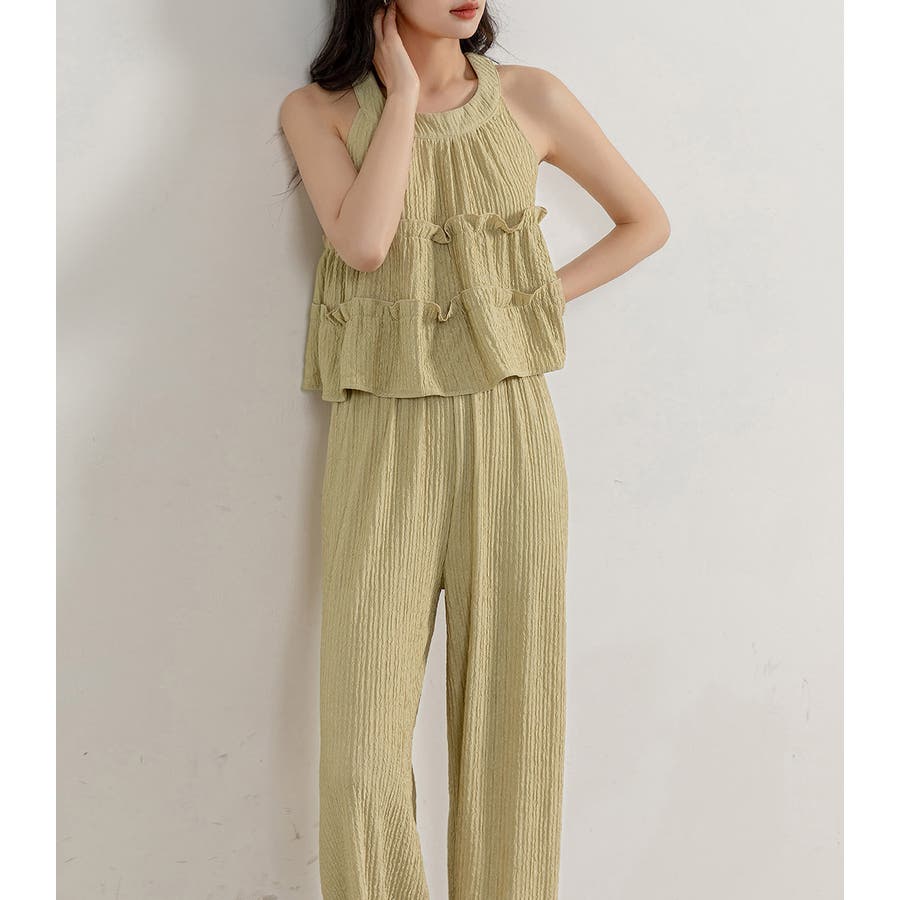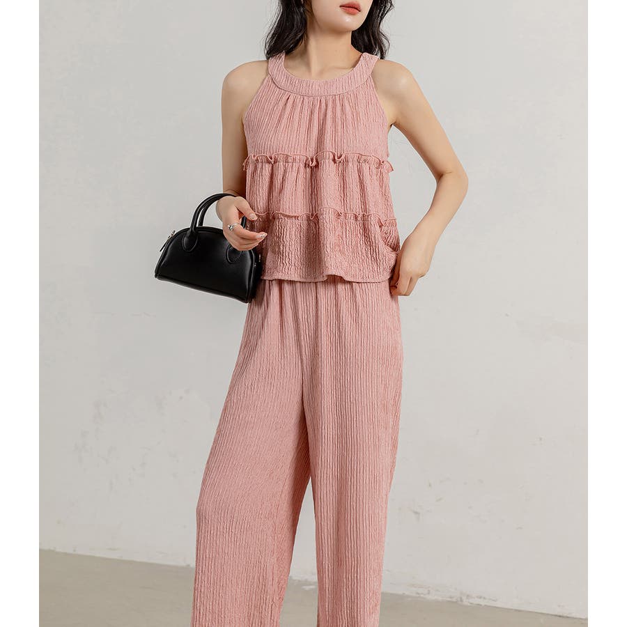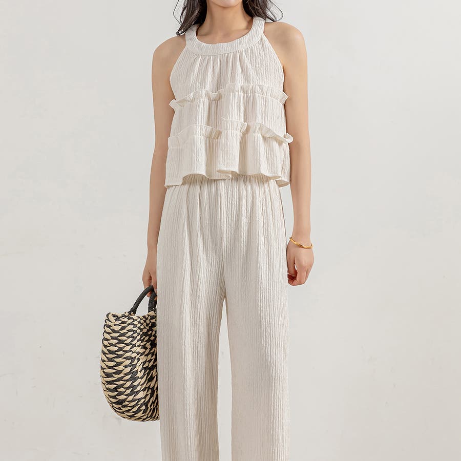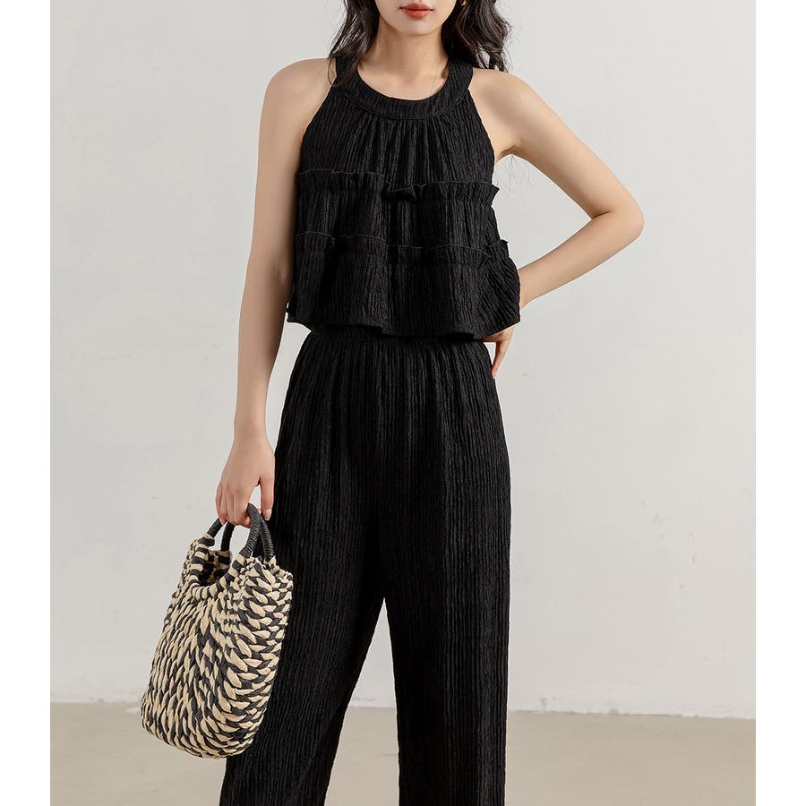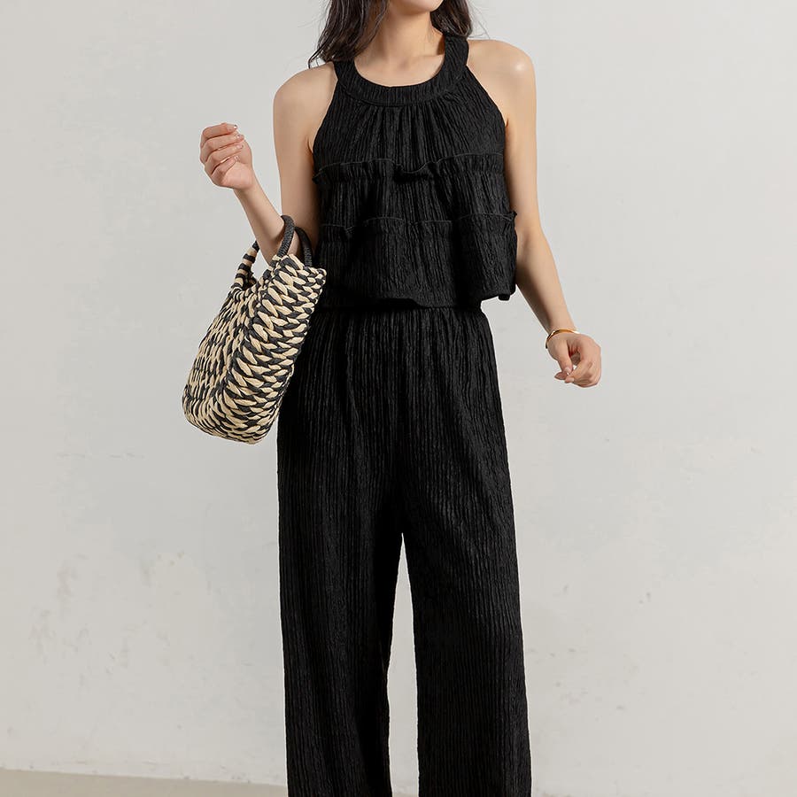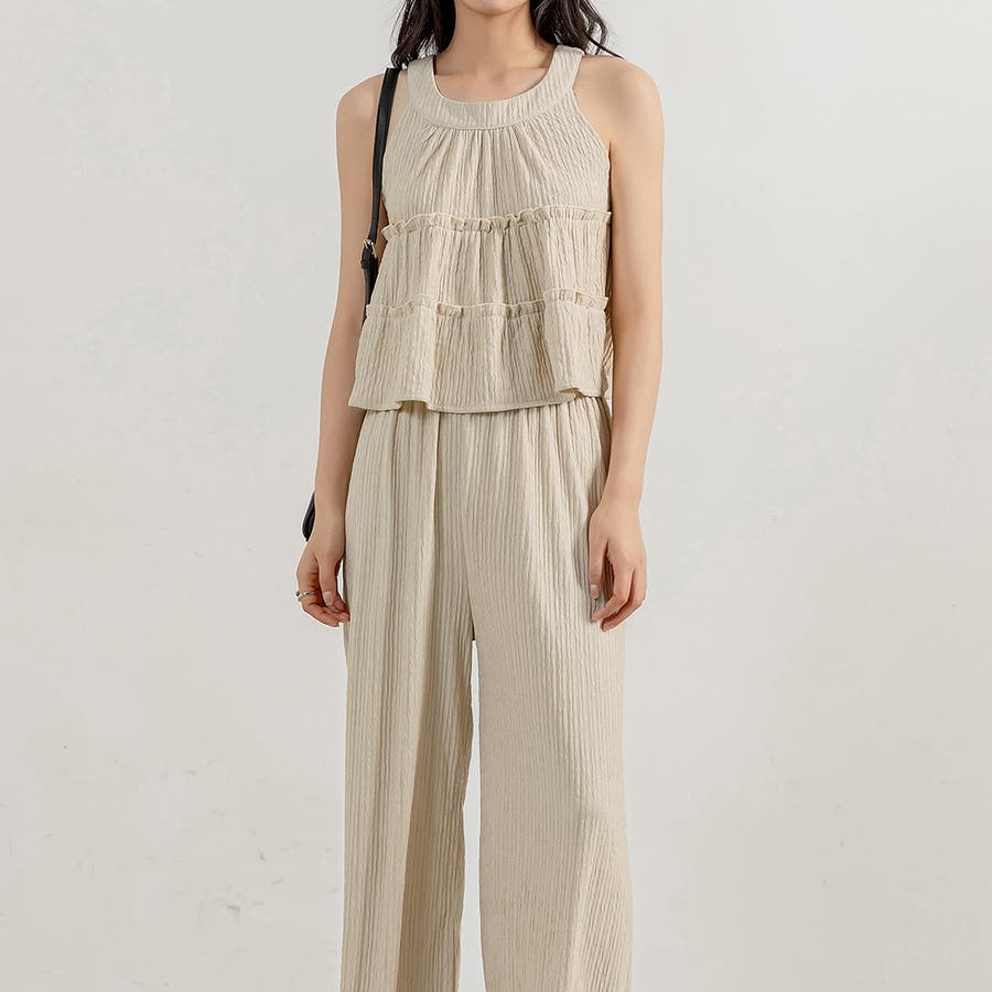 フレアトップスにワイドパンツを合わせたこなれ感のあるデザインで