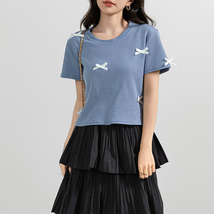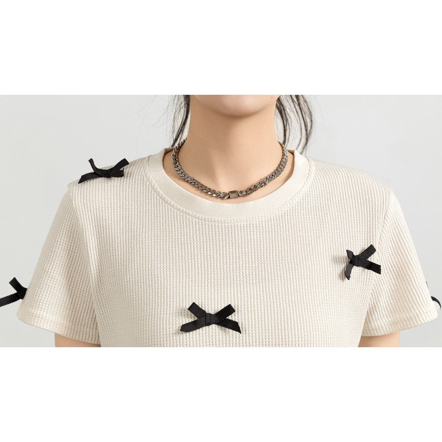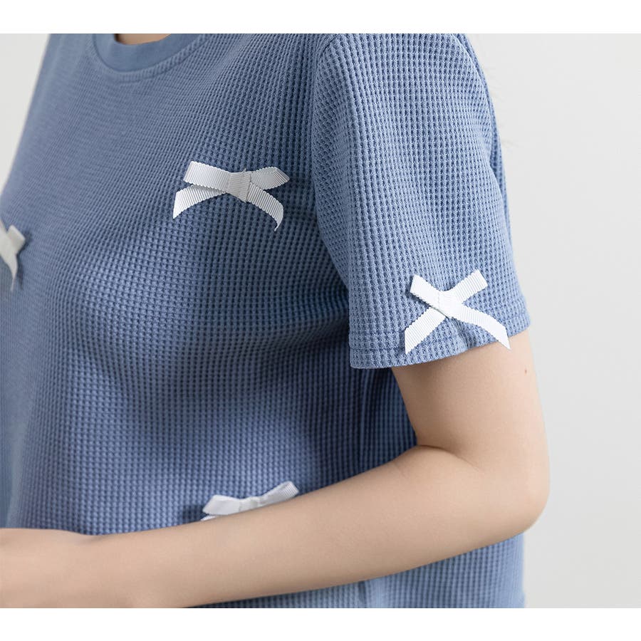 レディース リボン ワッフル生地 Tシャツ