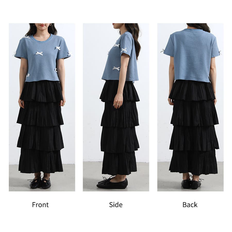 フロント部分に散りばめられたリボンで華やかなトップスに。