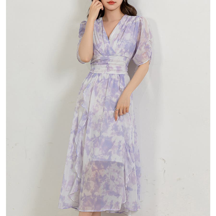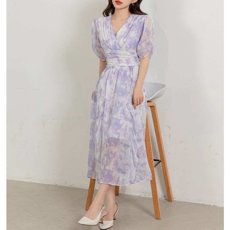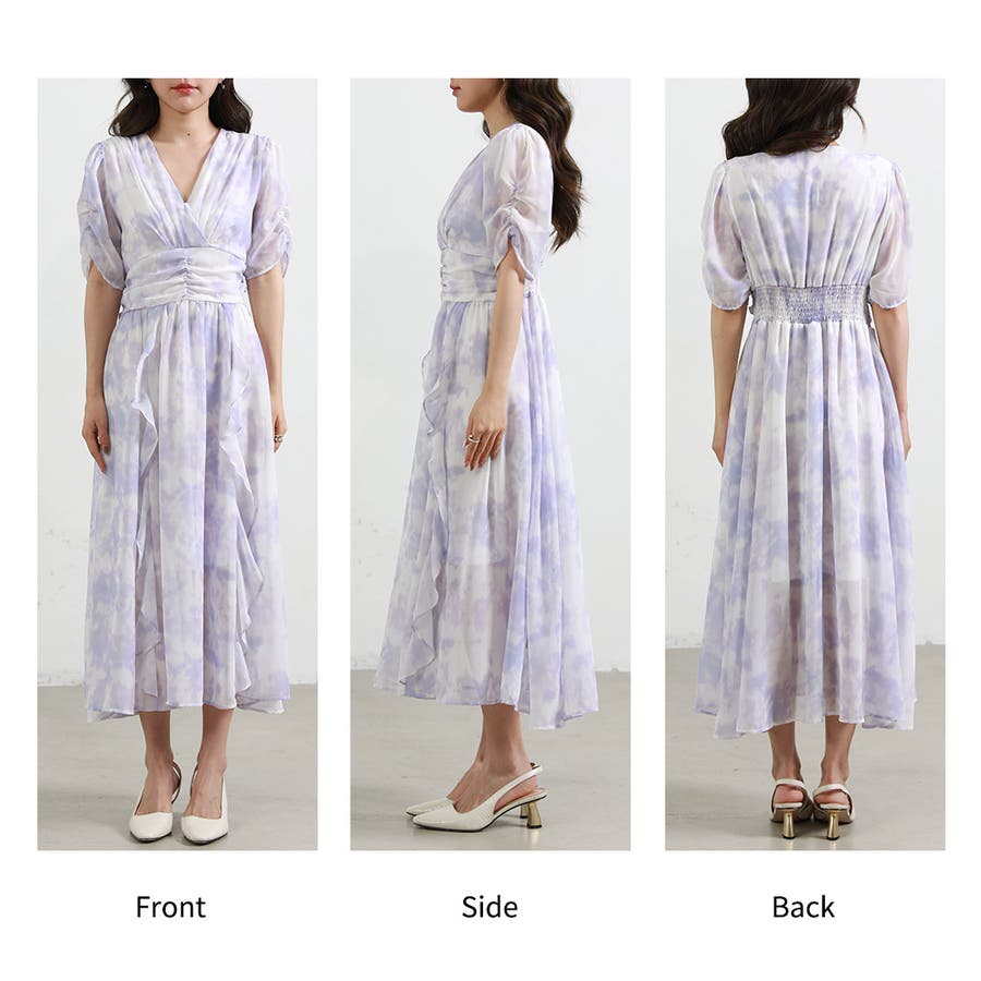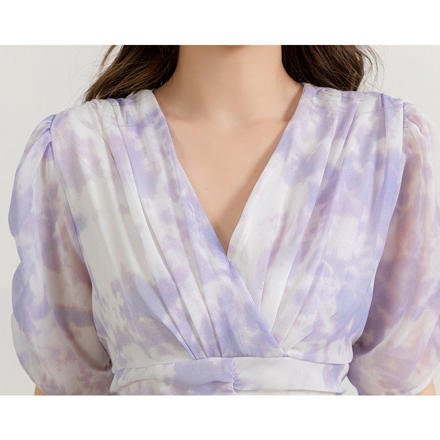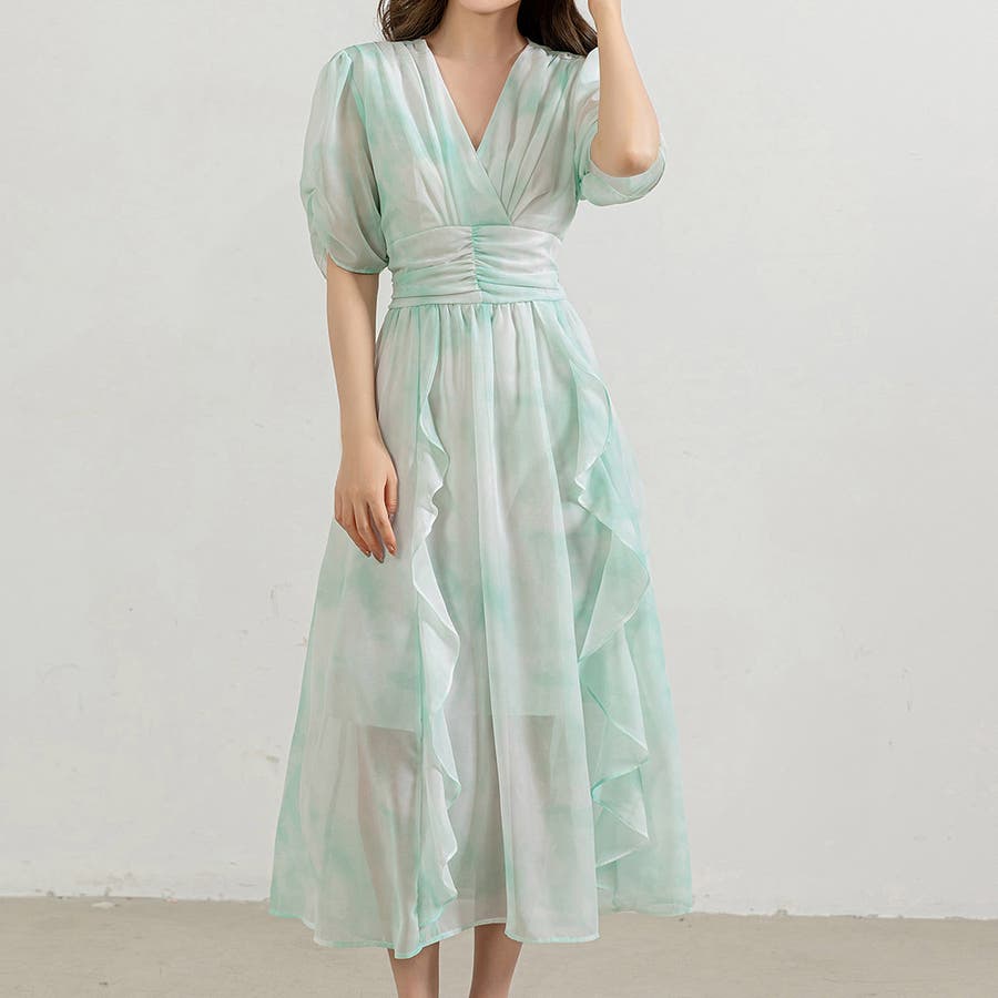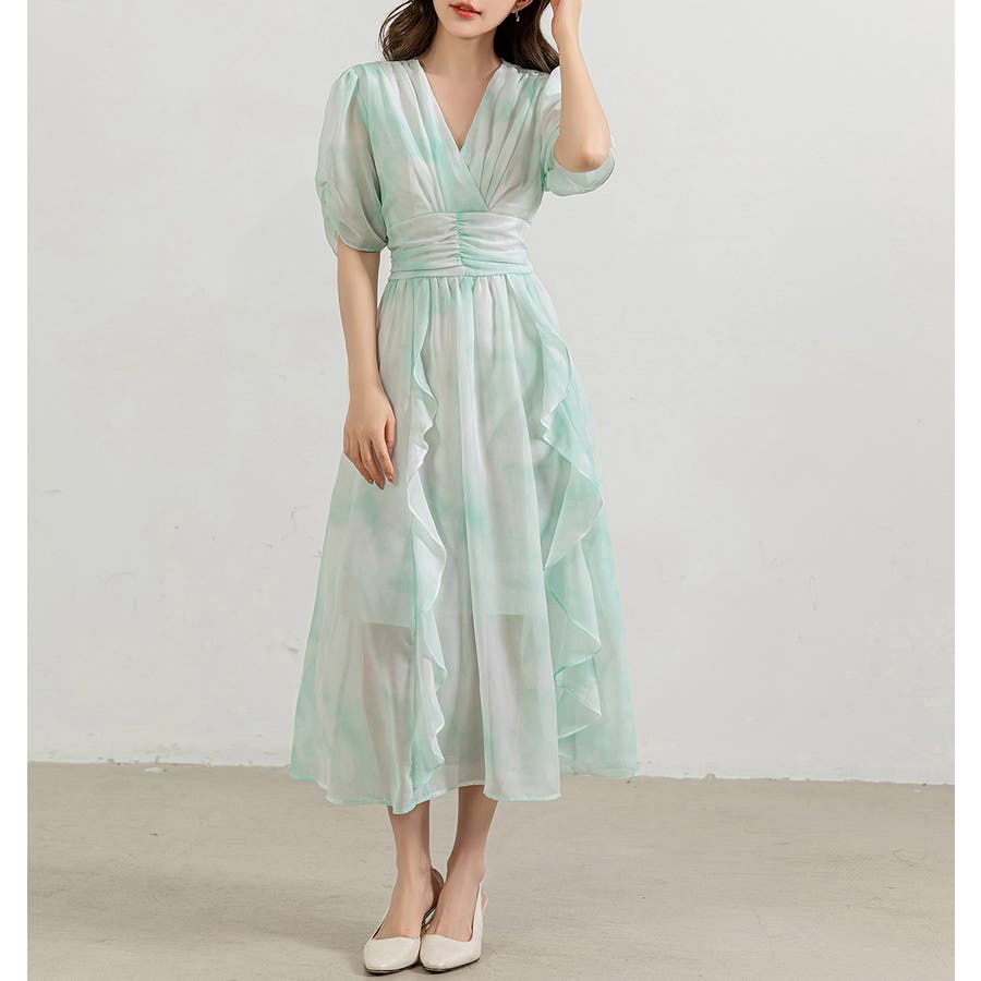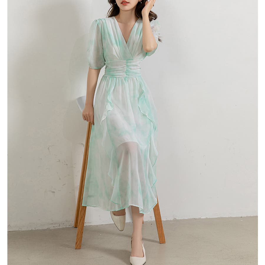 透け感が爽やかな雰囲気を演出し、カシュクールVネックとウエストラインの切り替えがポイント!
