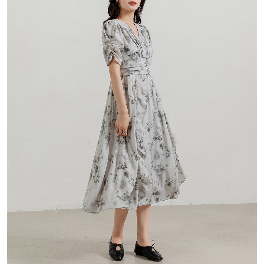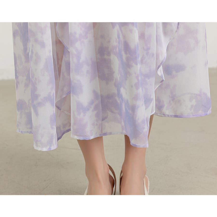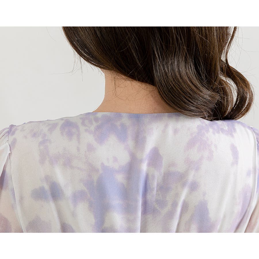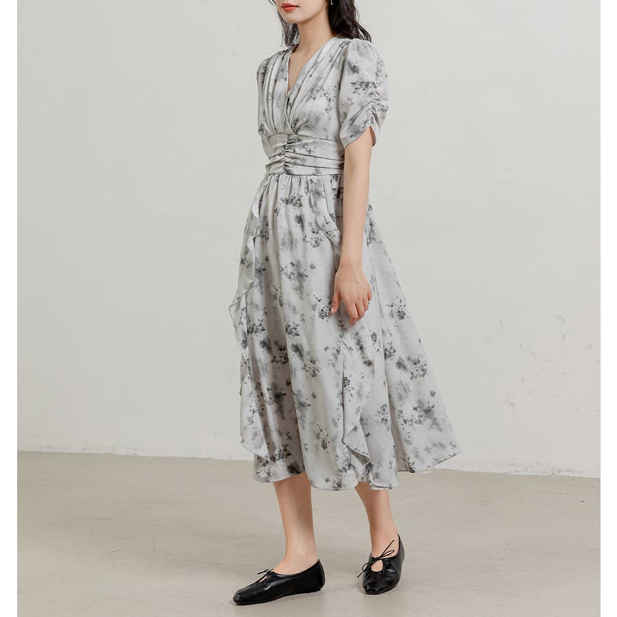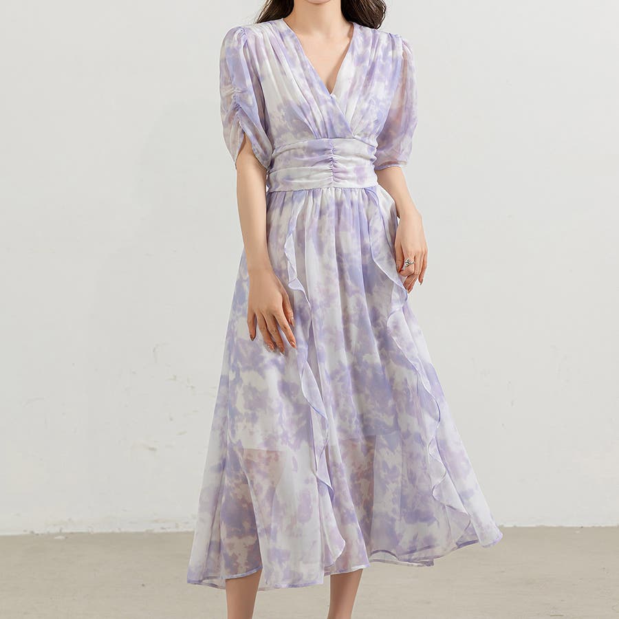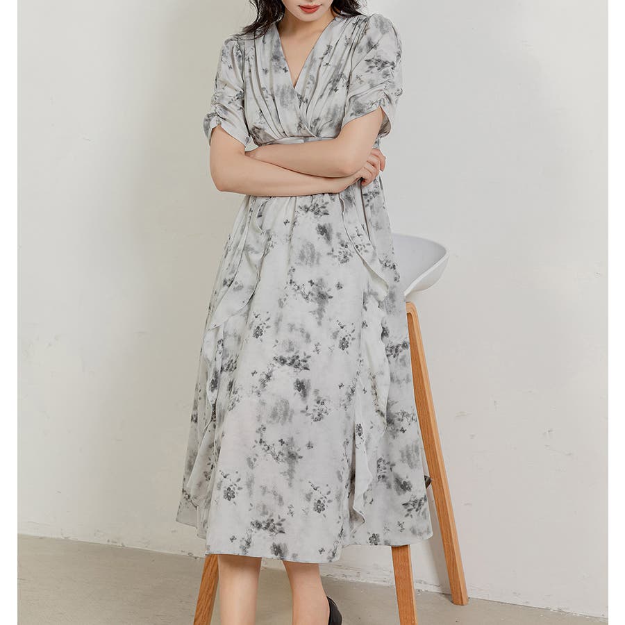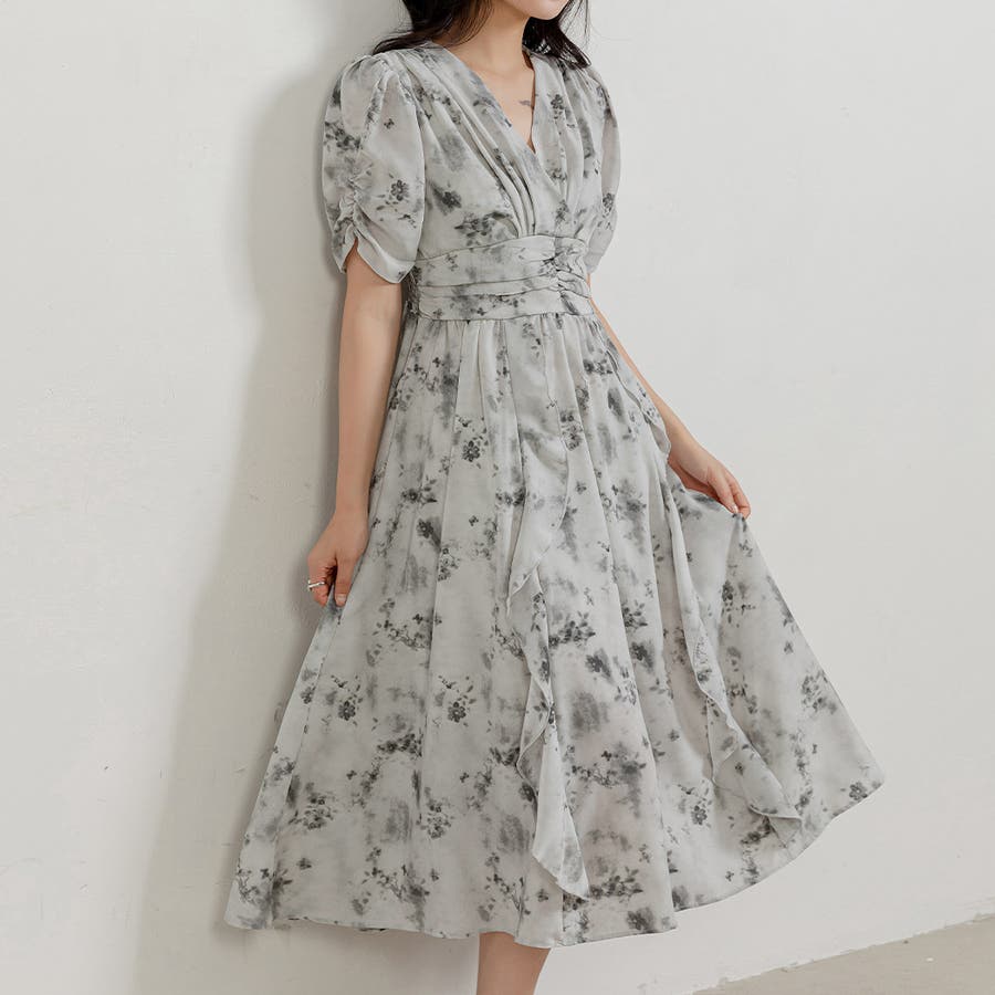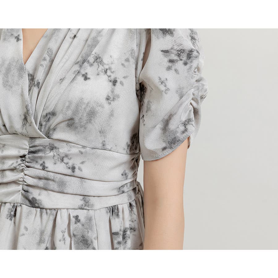透け感が爽やかな雰囲気を演出し、カシュクールVネックとウエストラインの切り替えがポイント!