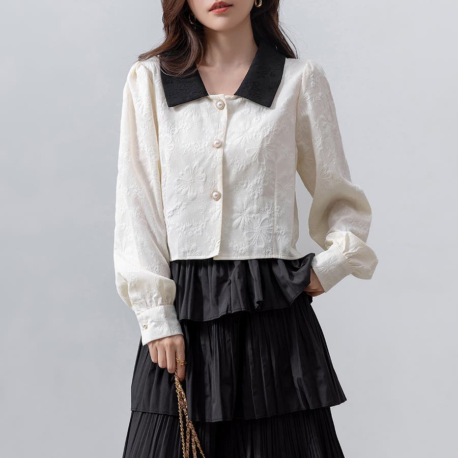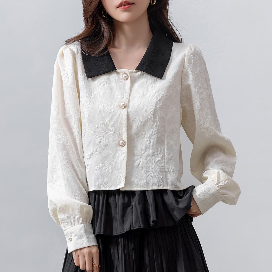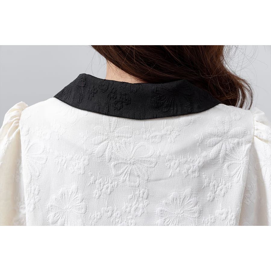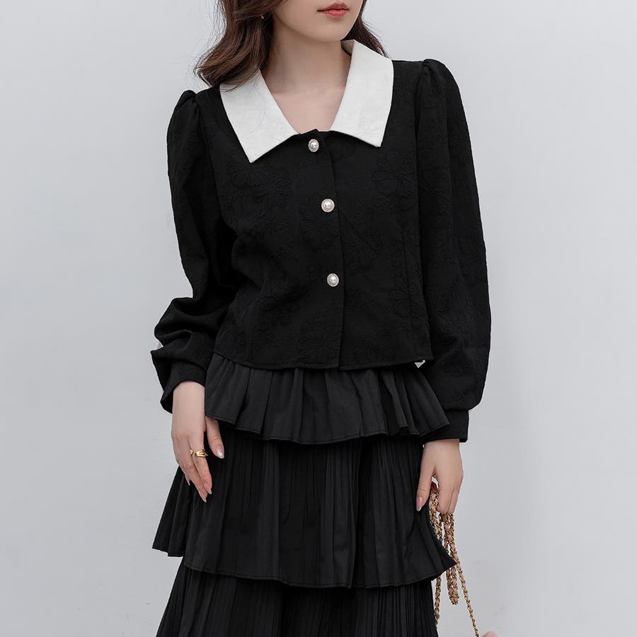 花柄のエンボス加工生地とパール調のボタンで華やかさをプラス。