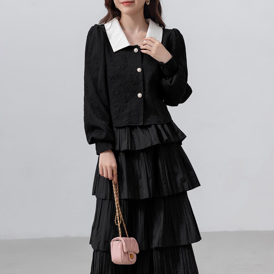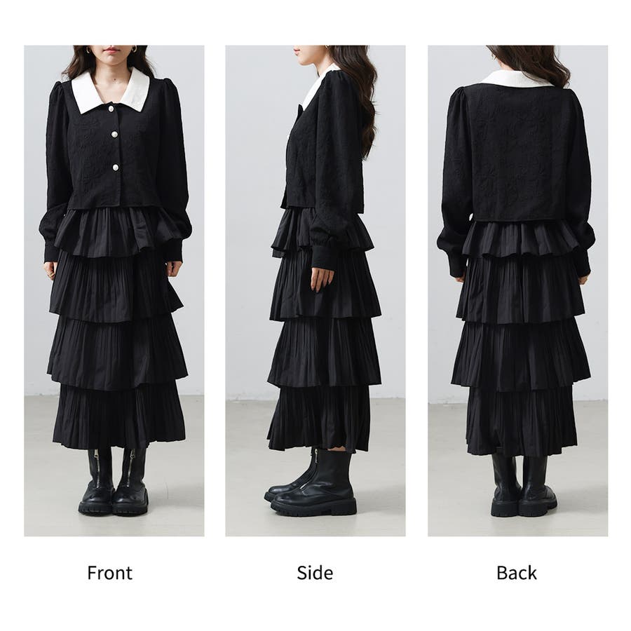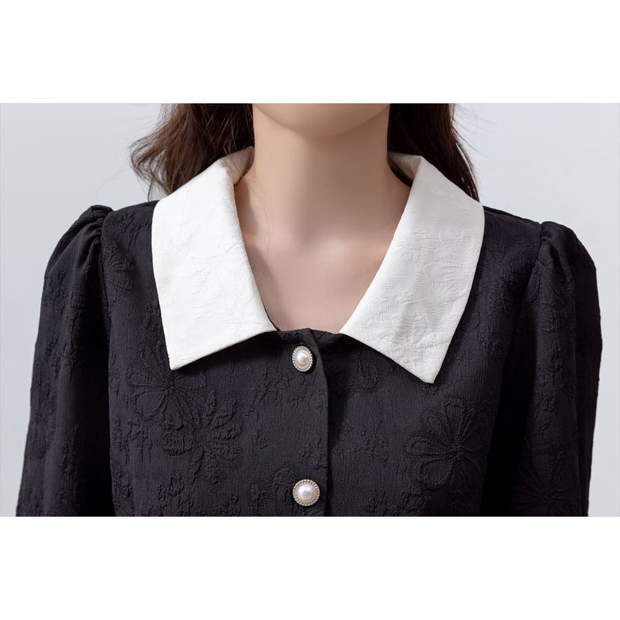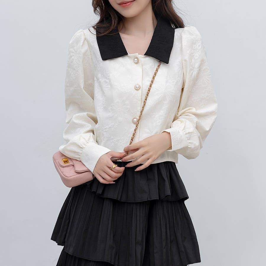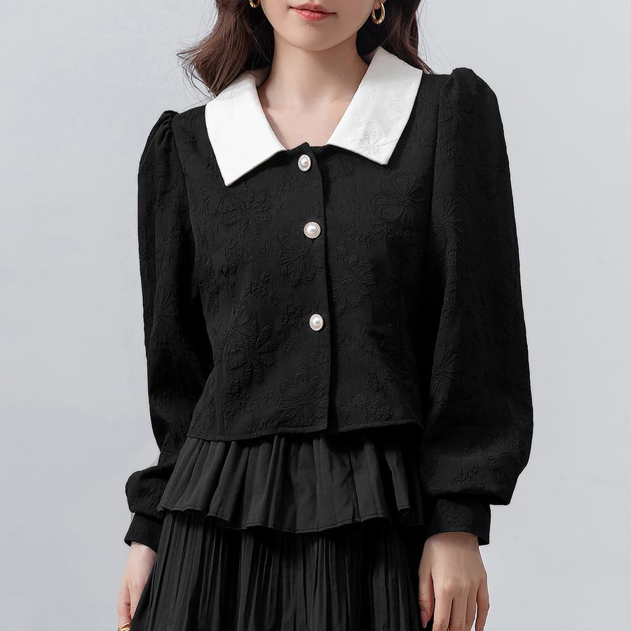 花柄のエンボス加工生地とパール調のボタンで華やかさをプラス。