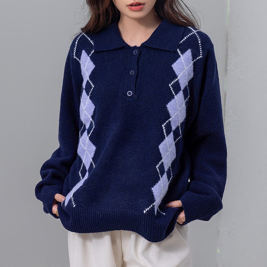 レトロ可愛いアーガイル柄に、襟付きのニットトップスでボーイズライクなスタイルに。