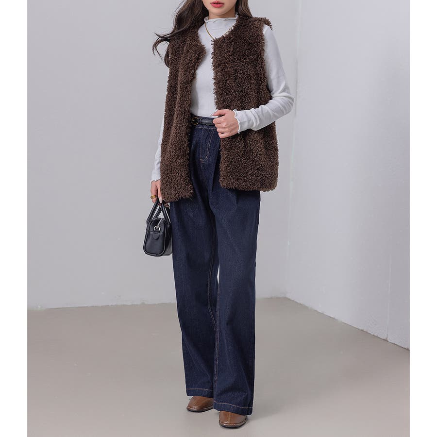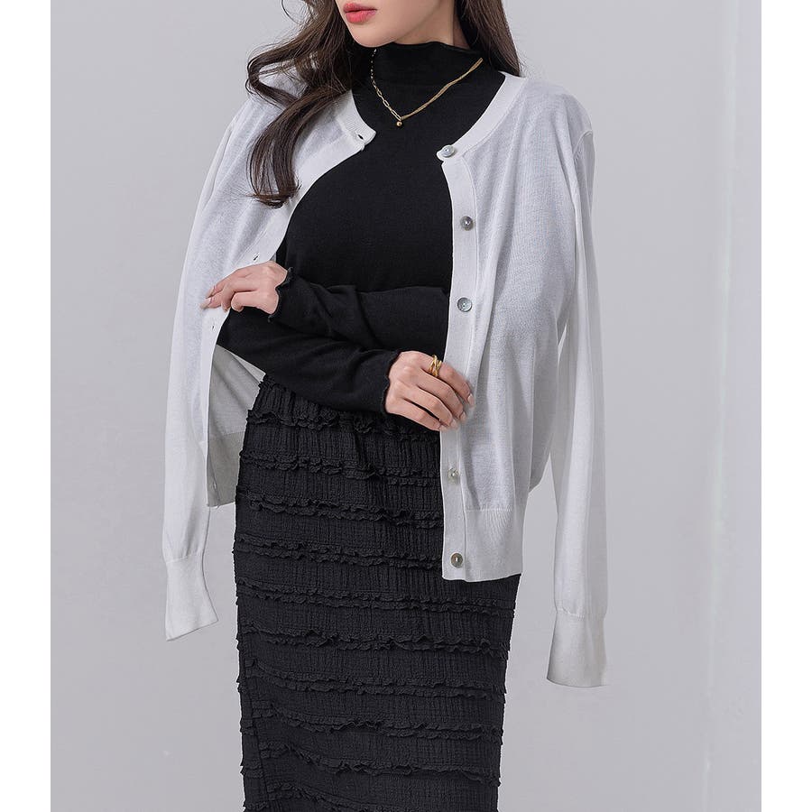 首元と、トレンドの長め袖のフリルで華やかなコーデに仕上がる