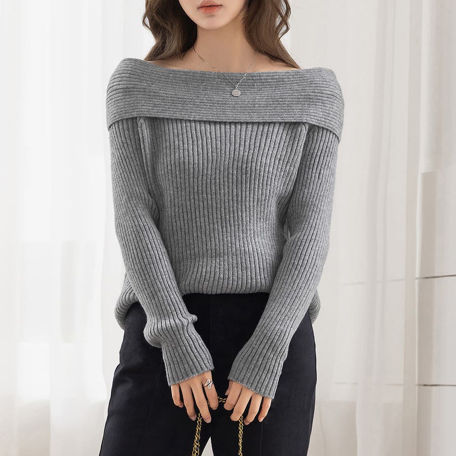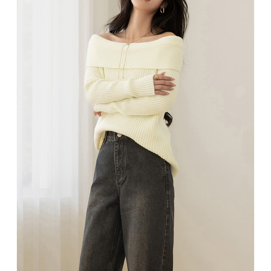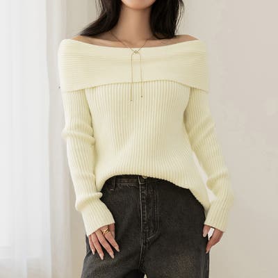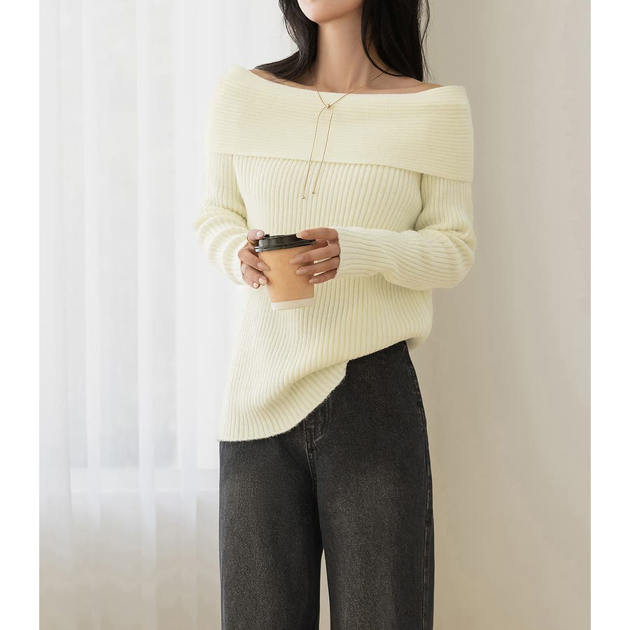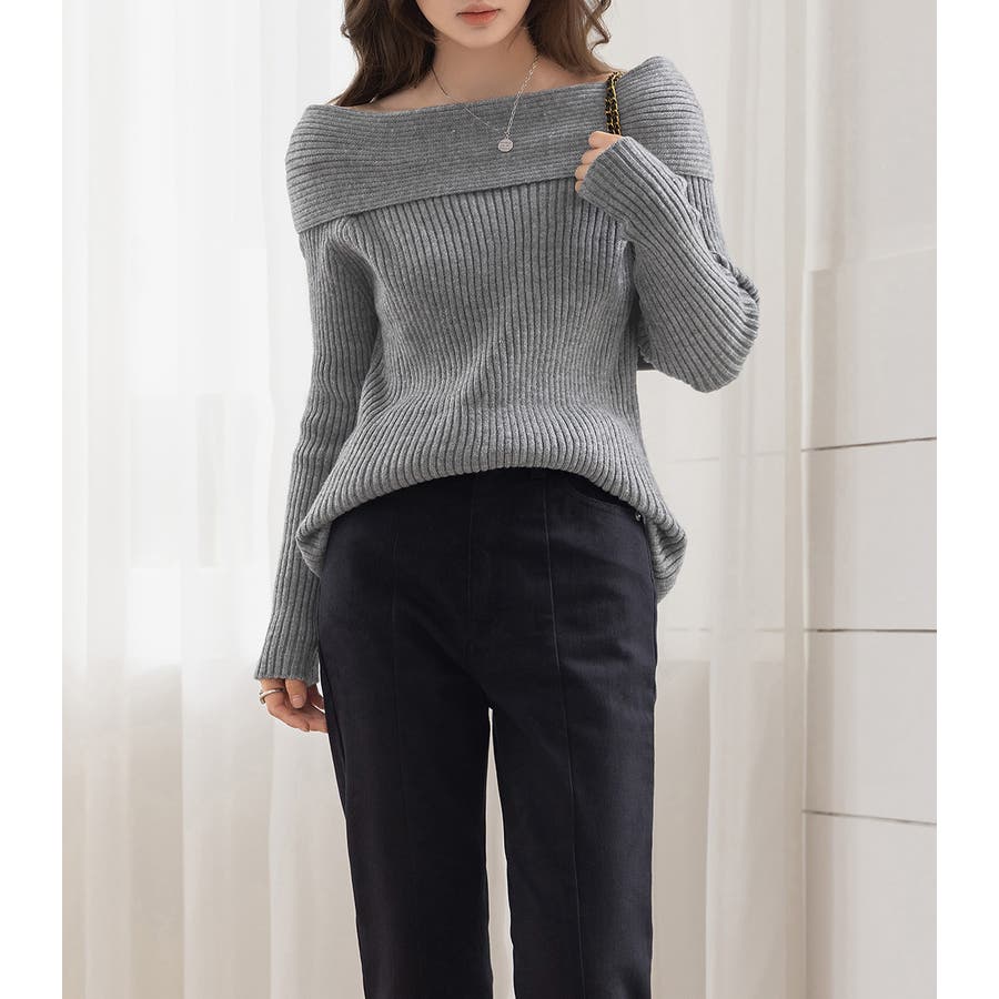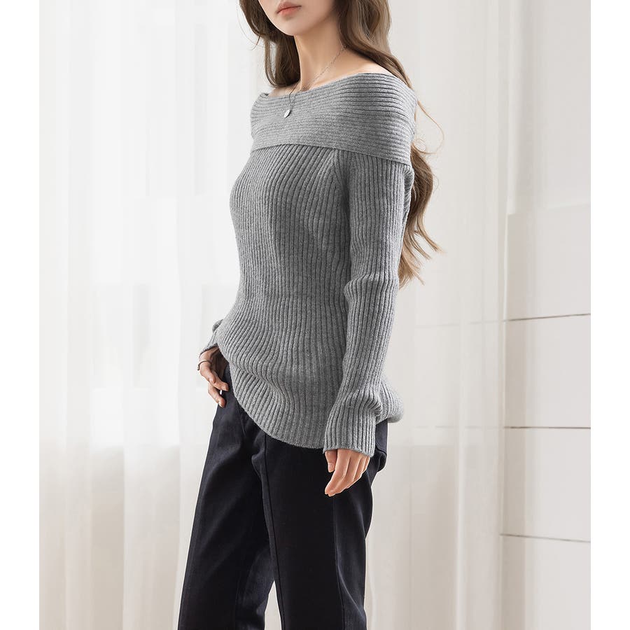 デコルテ周りをキレイに見せるオフショルデザイン&リブニットの縦ラインで華奢見えも叶うのが嬉しいポイント。