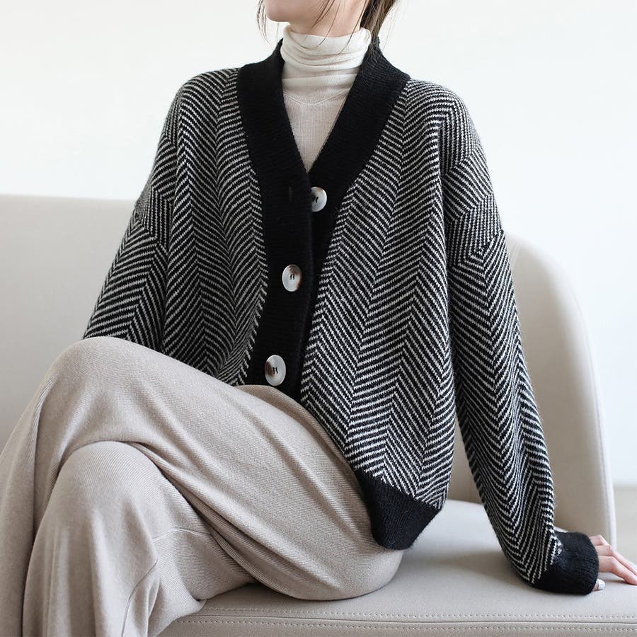 パッと目を惹くヘリンボーン柄Vネックカーディガン