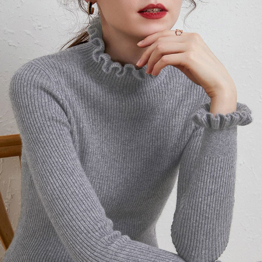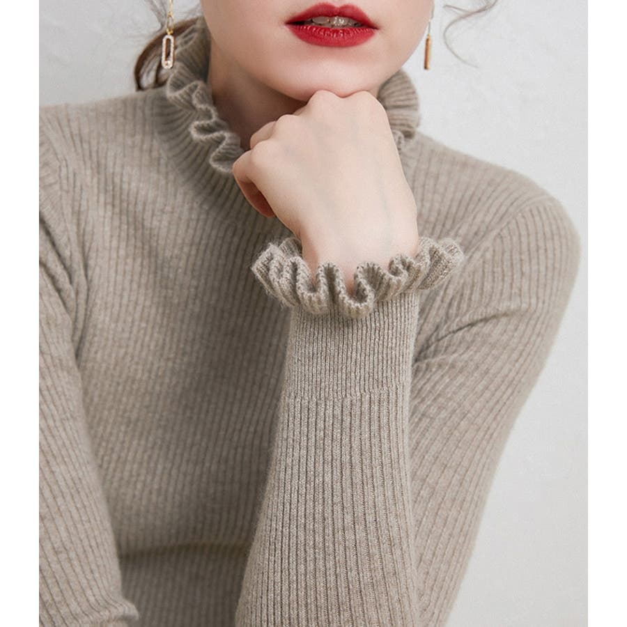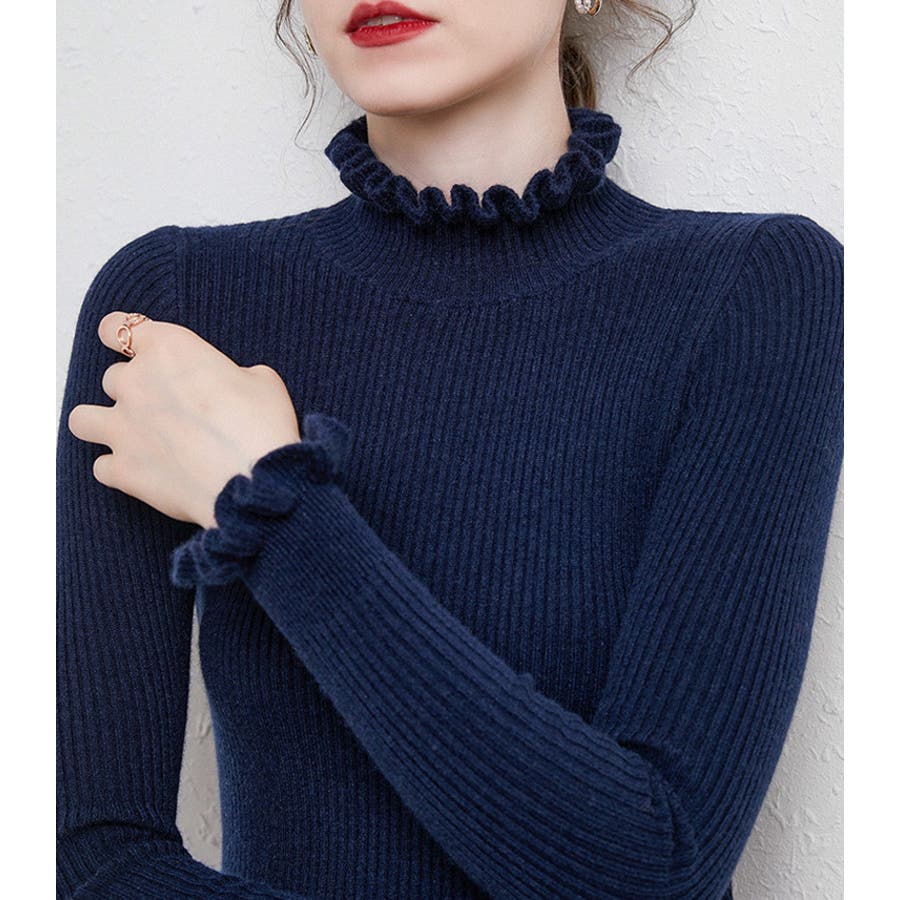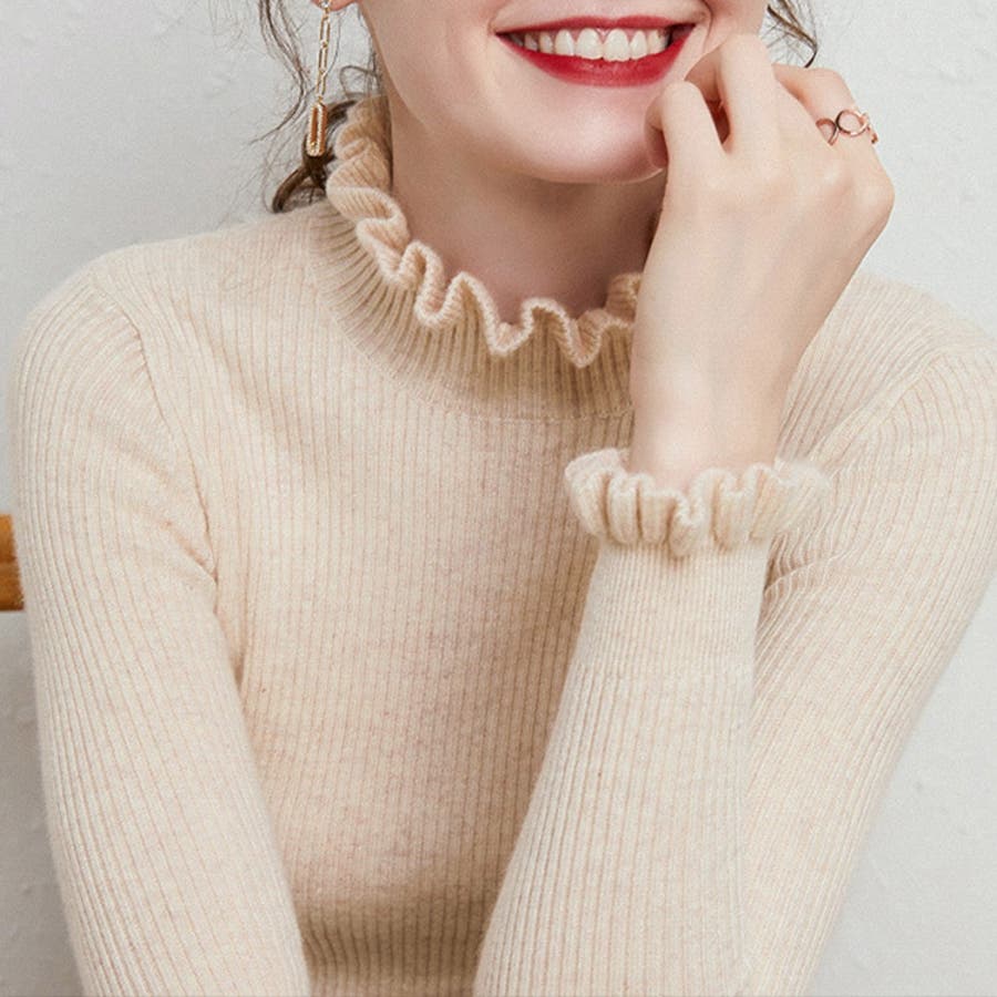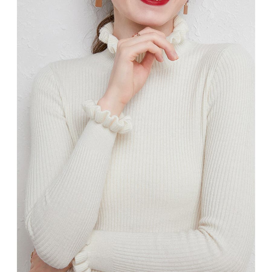 シンプルながらも、首周り&袖口にさり気ないフリルを施したミディ丈のリブニットが登場。