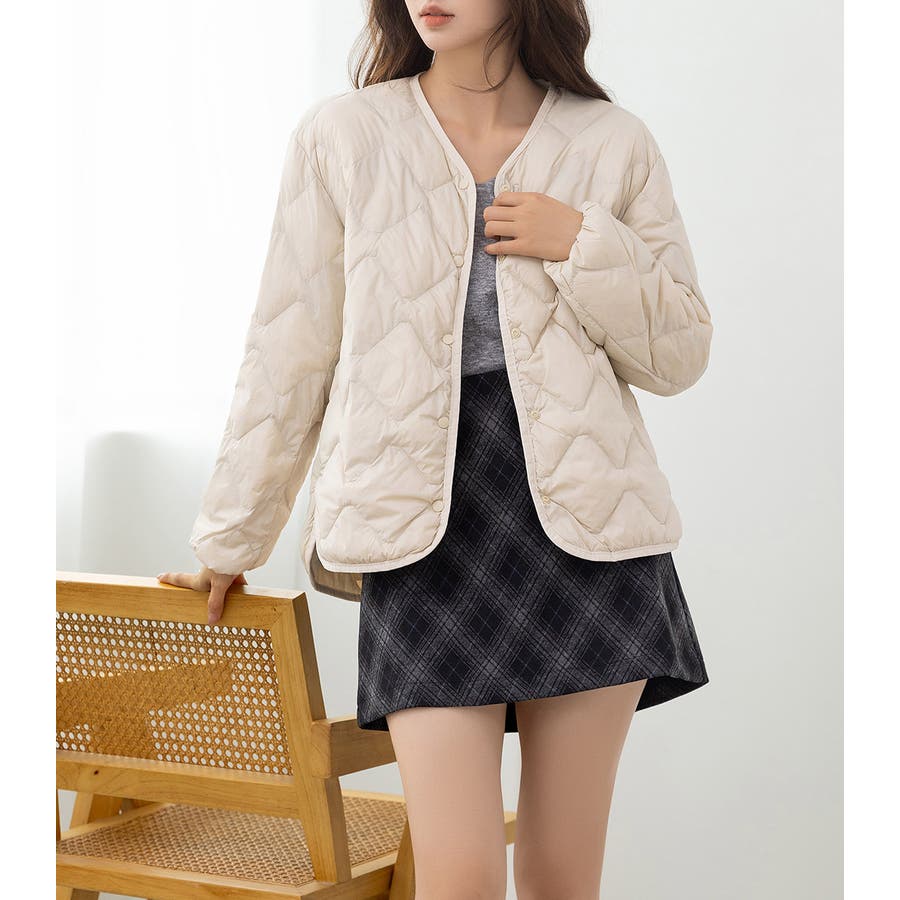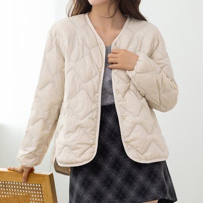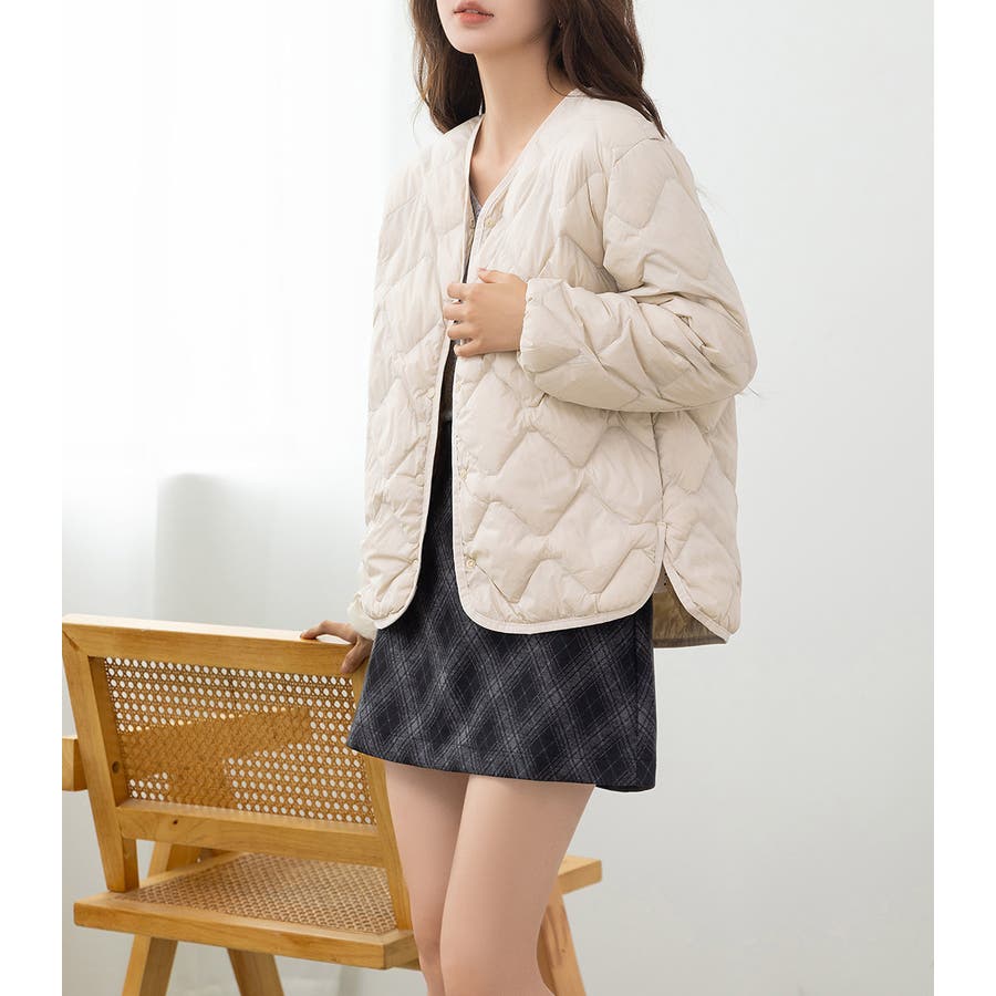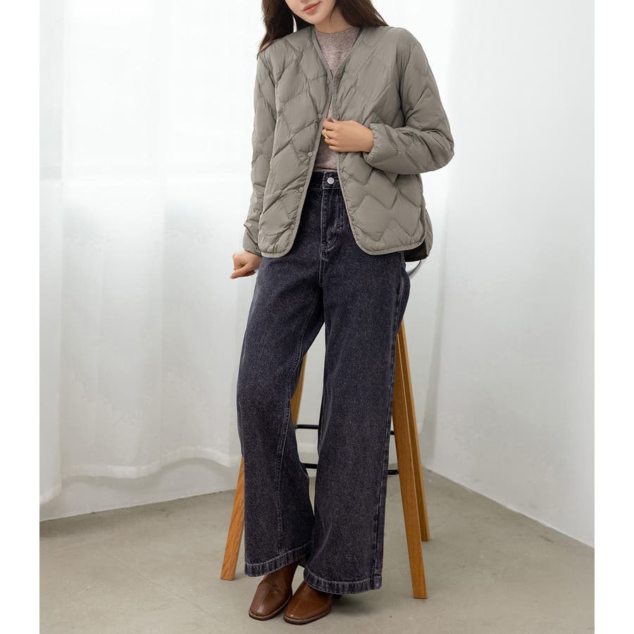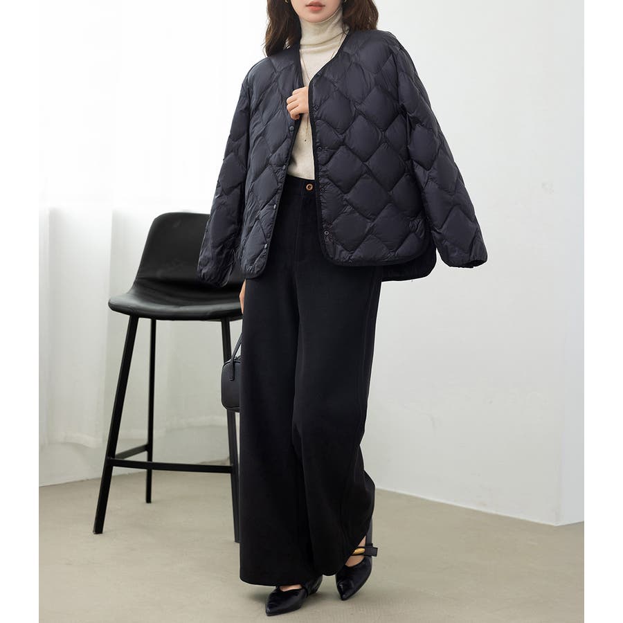 すっきりVネックのノーカラーデザインでハイネックニットとも相性抜群!