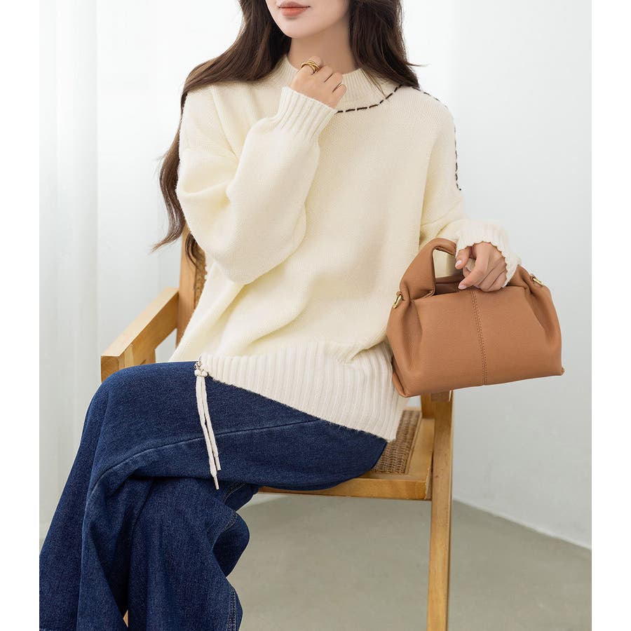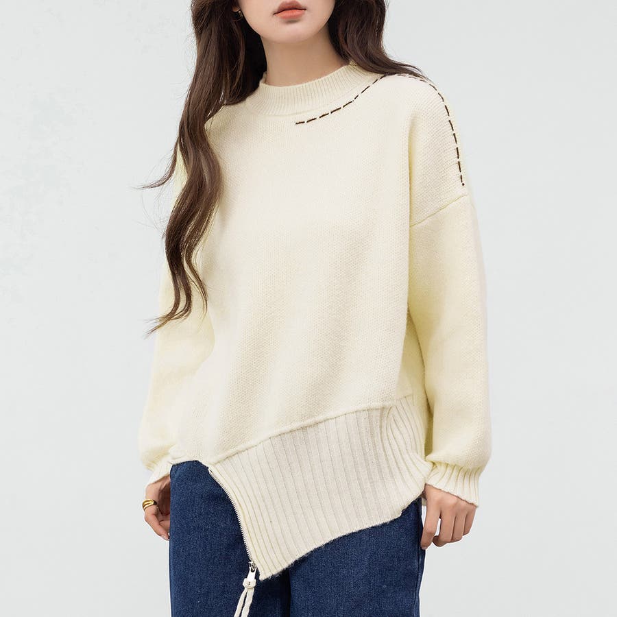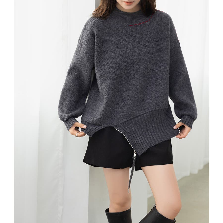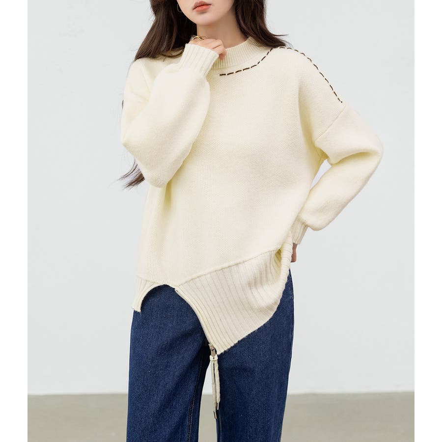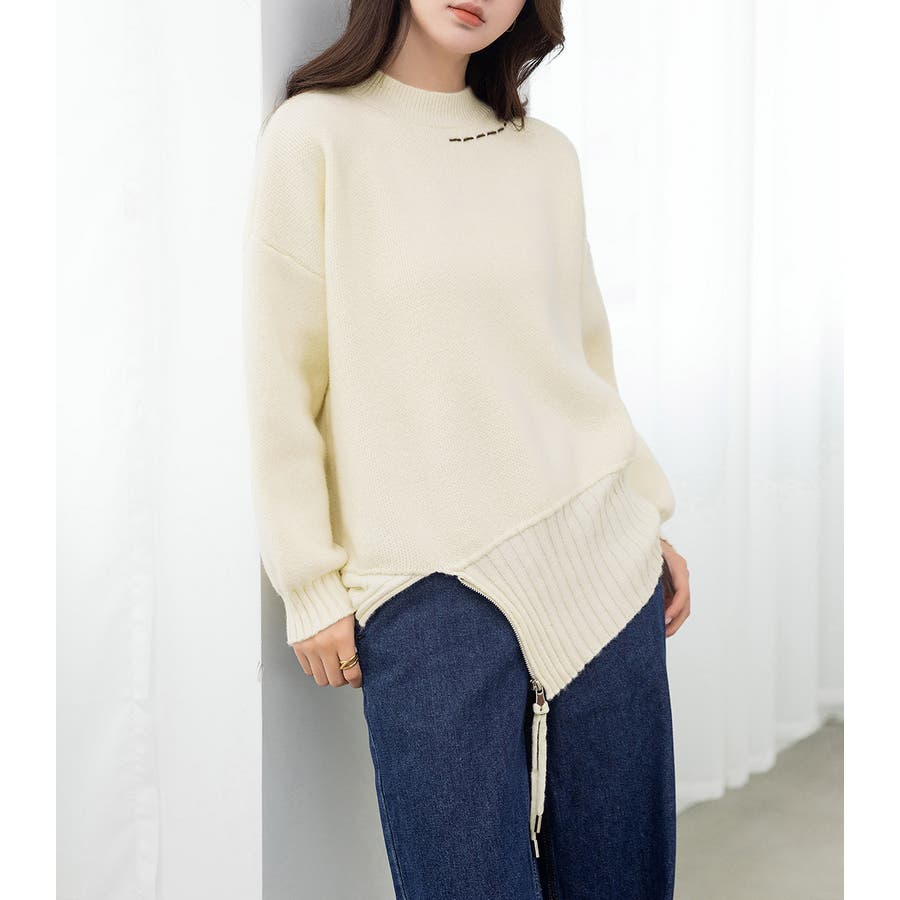 首元のステッチと片側ジップのアシンメトリーな裾がアクセントになった、モードな雰囲気が漂う主役級ニット。