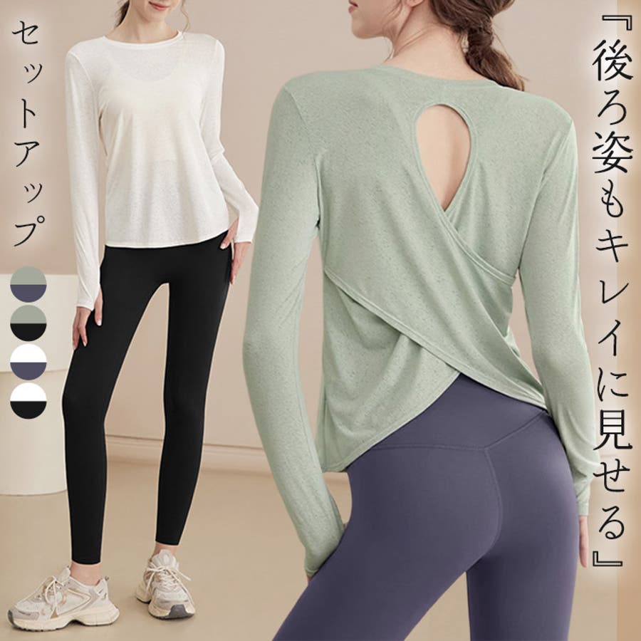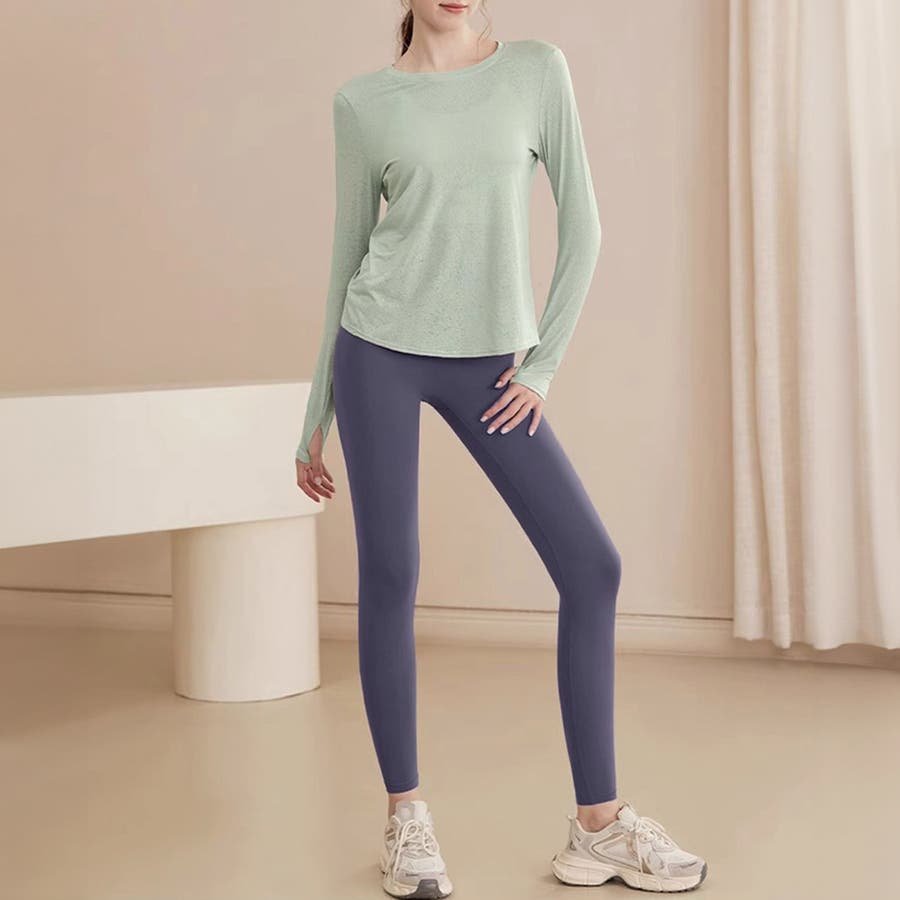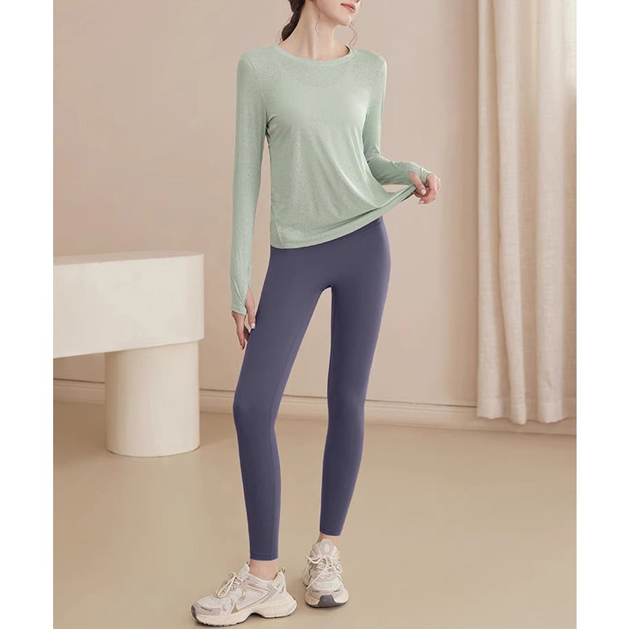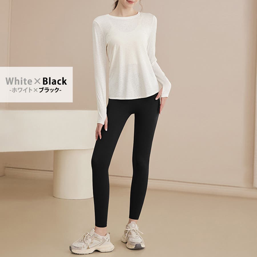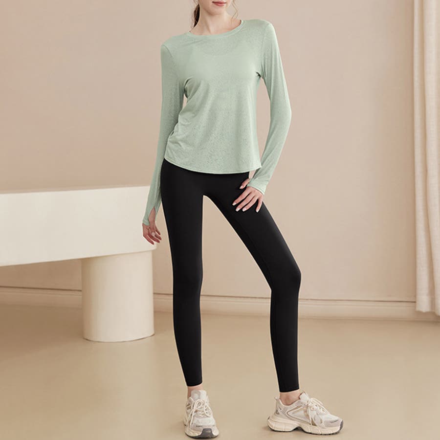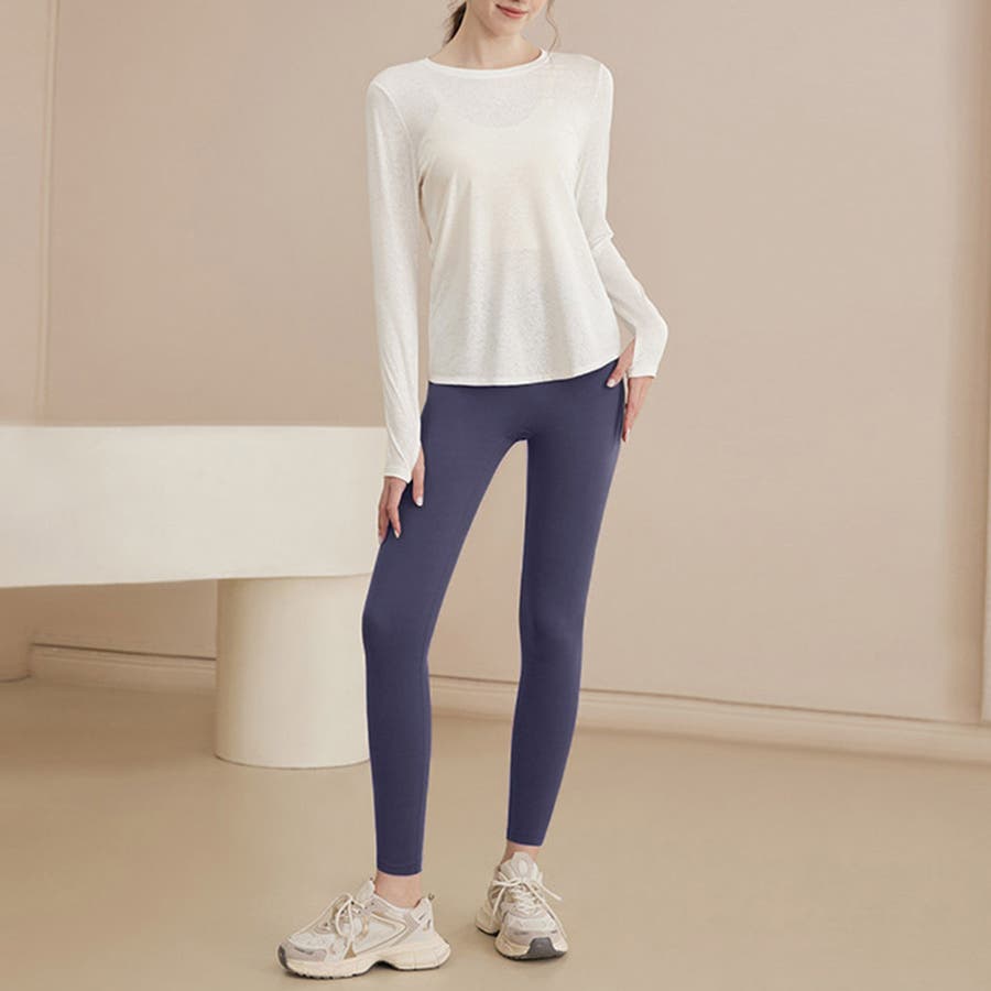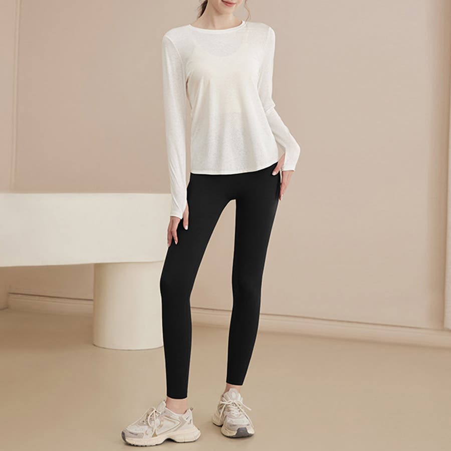 透け感のある長袖トップスとシンプルレギンスの組み合わせで使いやすさ抜群。