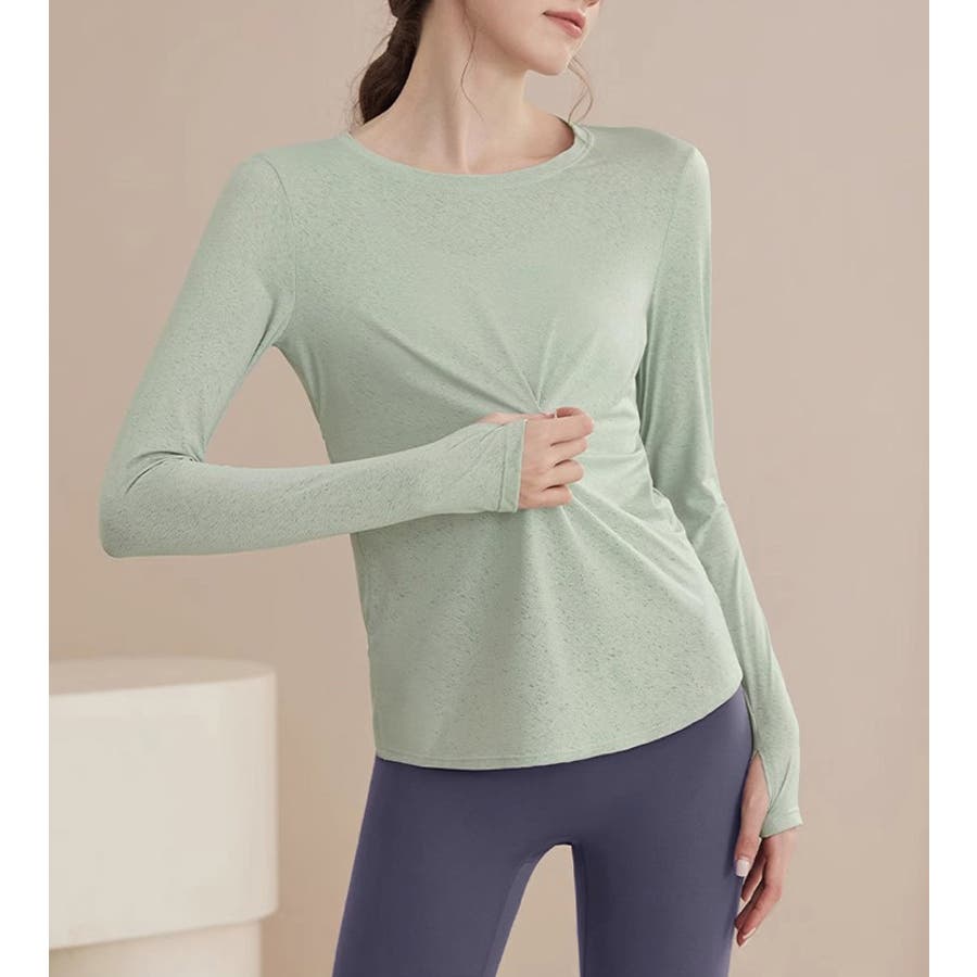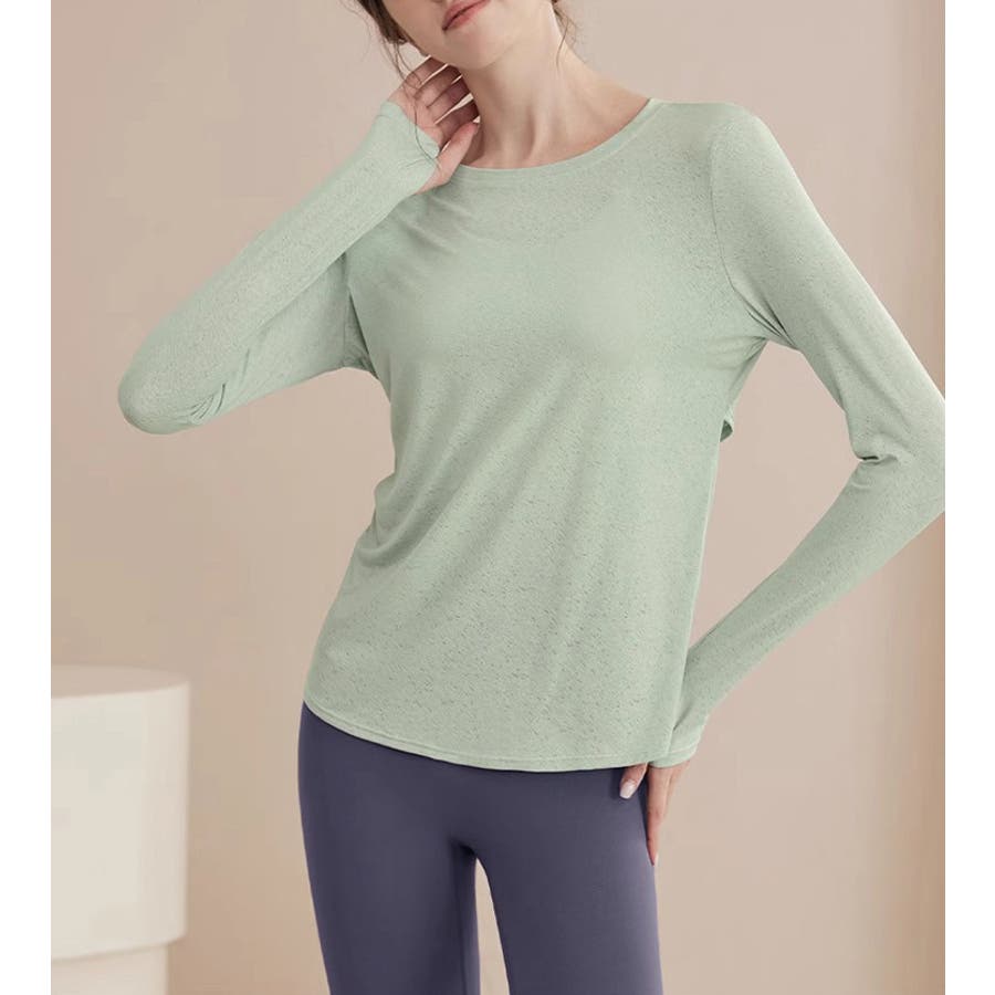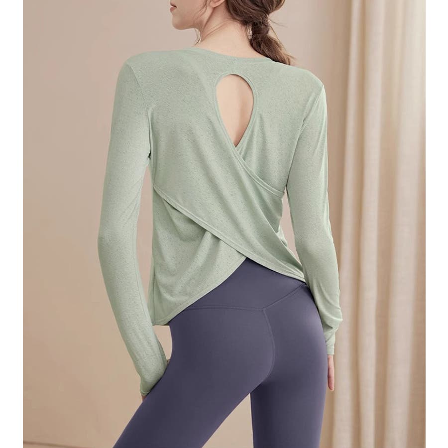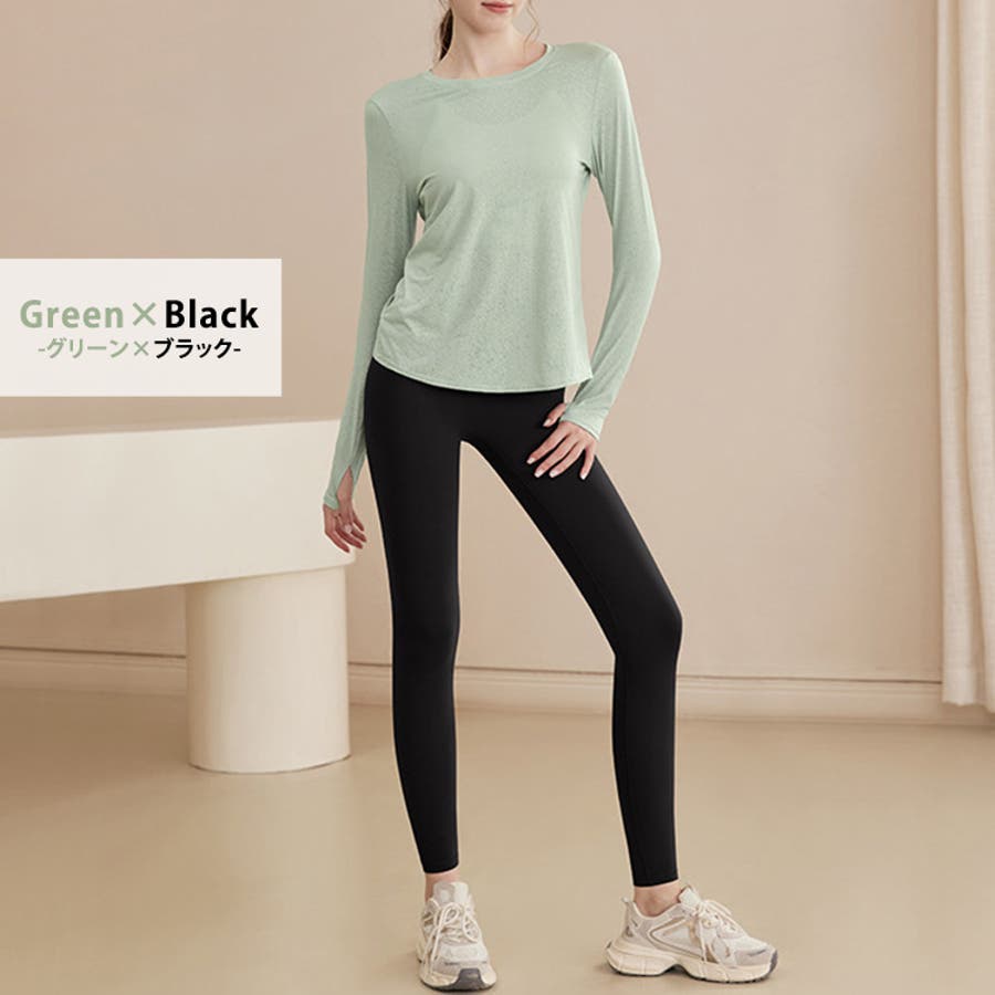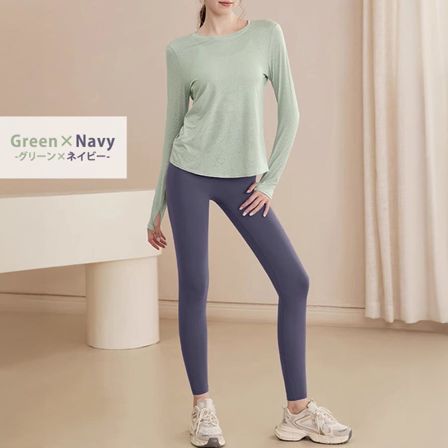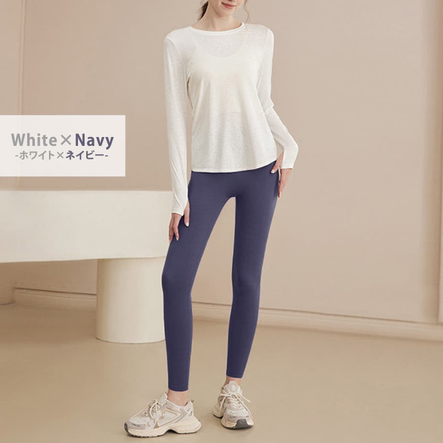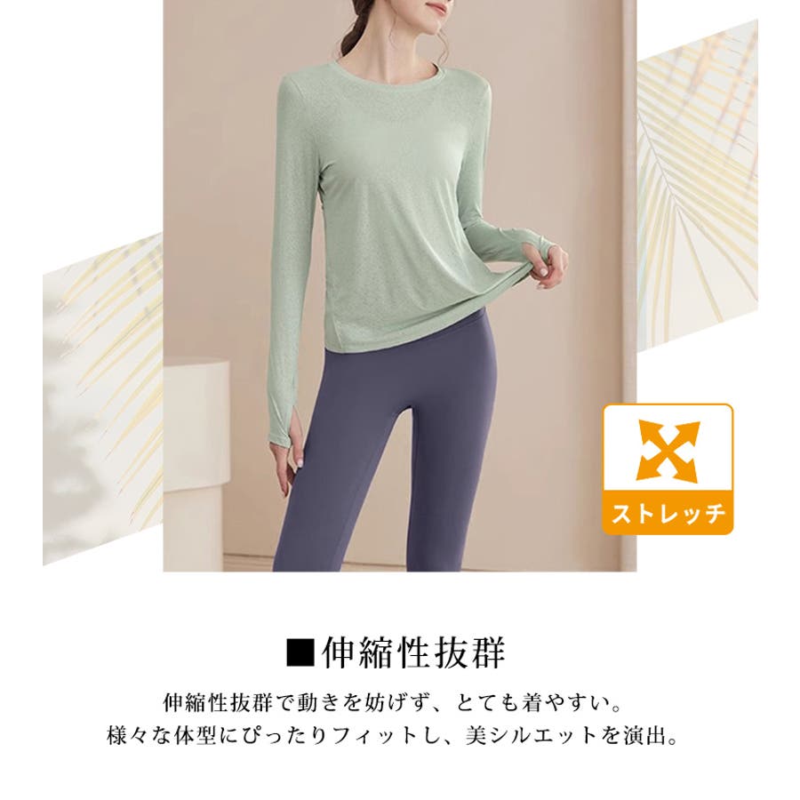 透け感のある長袖トップスとシンプルレギンスの組み合わせで使いやすさ抜群。