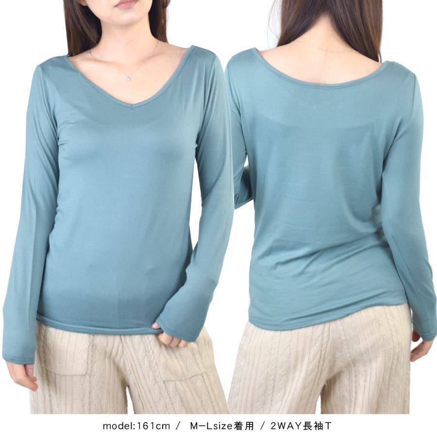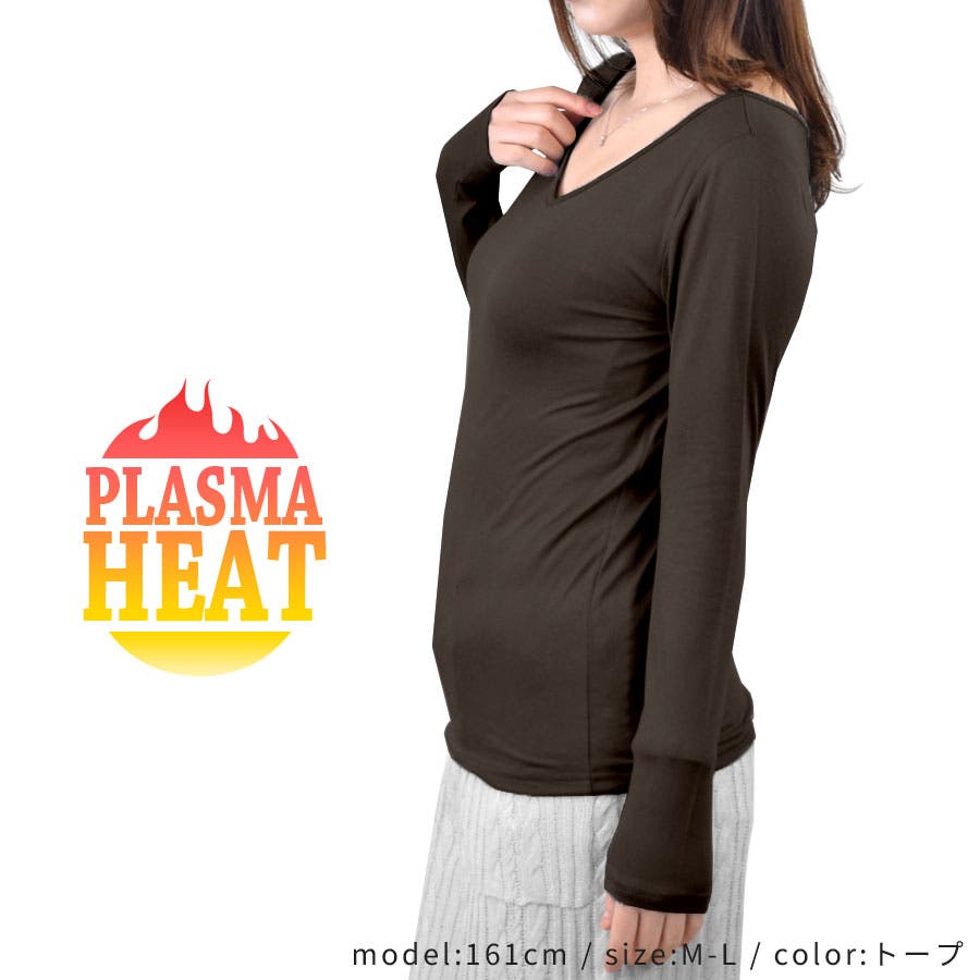 【裏起毛 ヒート インナー 長袖 レディース 2WAY 丸首 Vネック トップス プラズマヒート PLASMA HEAT ピーチタッチ カットソー防寒 保温 暖か 肌着 下着 ラウンドネック 薄手 伸縮性 ストレッチ 伸びる さらさら 極細繊維 ヒートインナー 発熱 吸湿 軽】