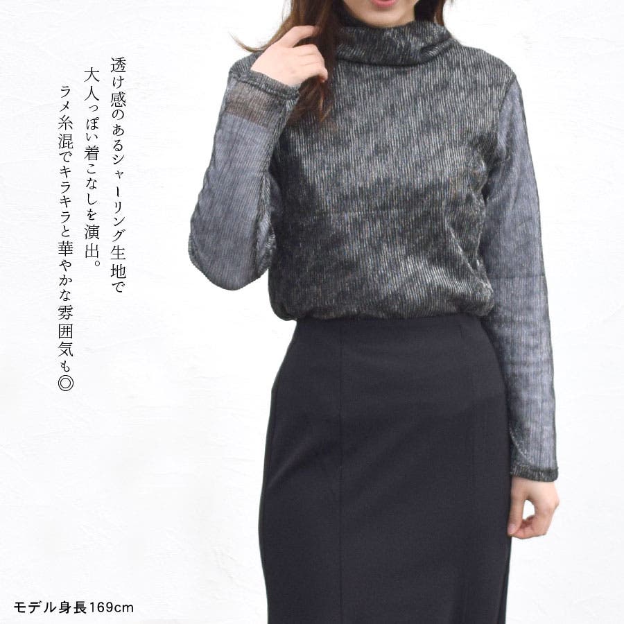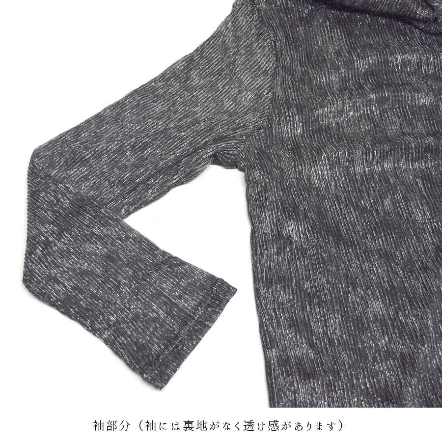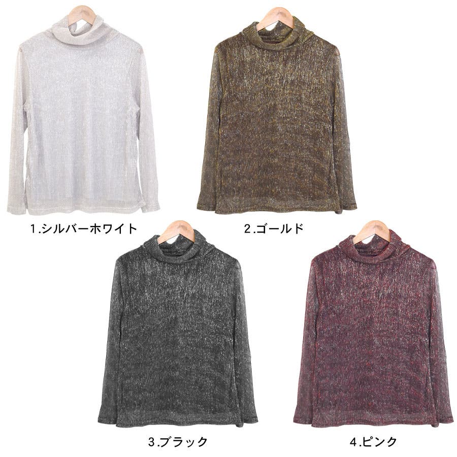 【シャーリング ラメ トップス ハイネック タートルネック カットソー レディース 長袖 透け感 シースルー シアー キラキラ ラメ糸混 シャイニー ブラウス きれいめ 華やか 派手 パーティー ハレの日】