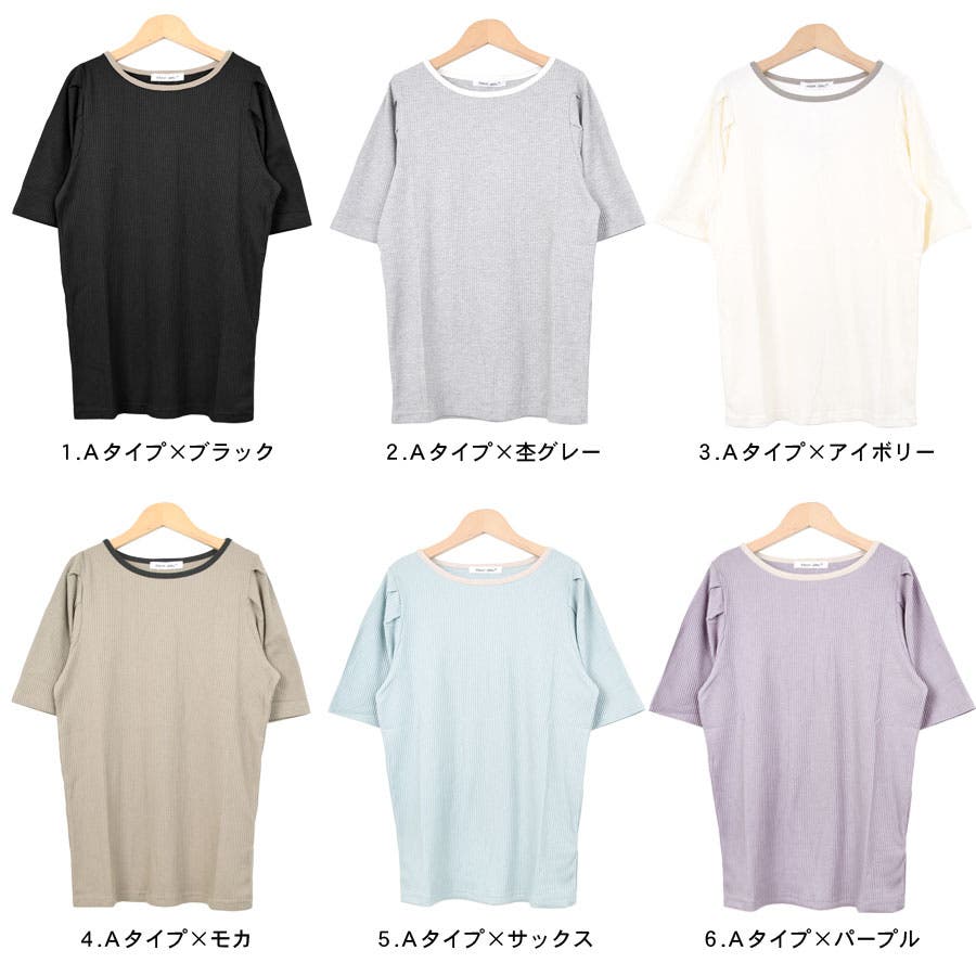 【カットソー 半袖 リブ テレコ Tシャツ レディース トップス ボリューム袖 ボリュームスリーブ プチハイネック パイピング 配色ネック パフスリーブ 上品 お洒落 シンプル 無地 バイカラー きれいめ くすみカラー】