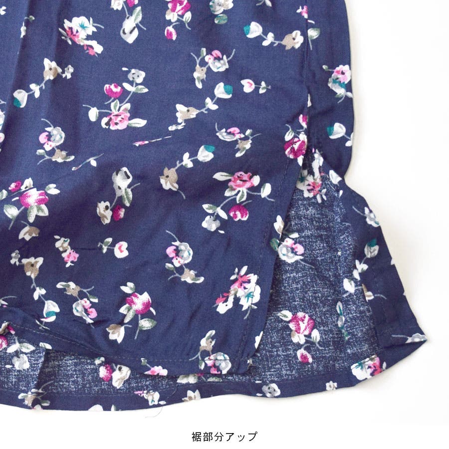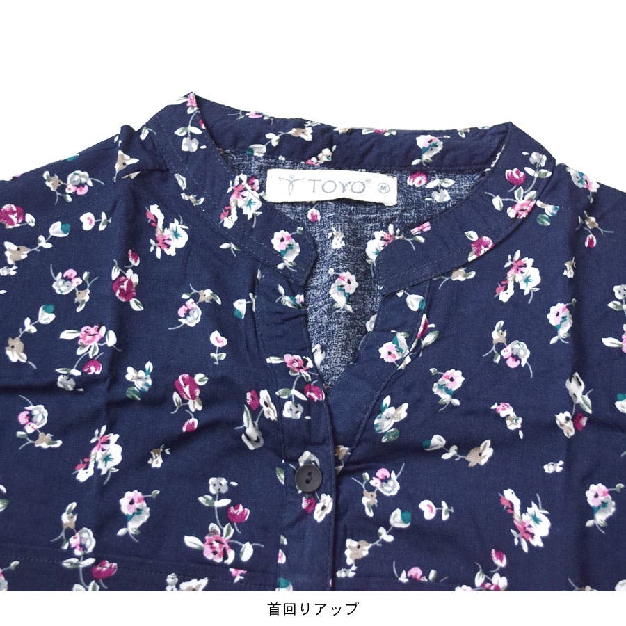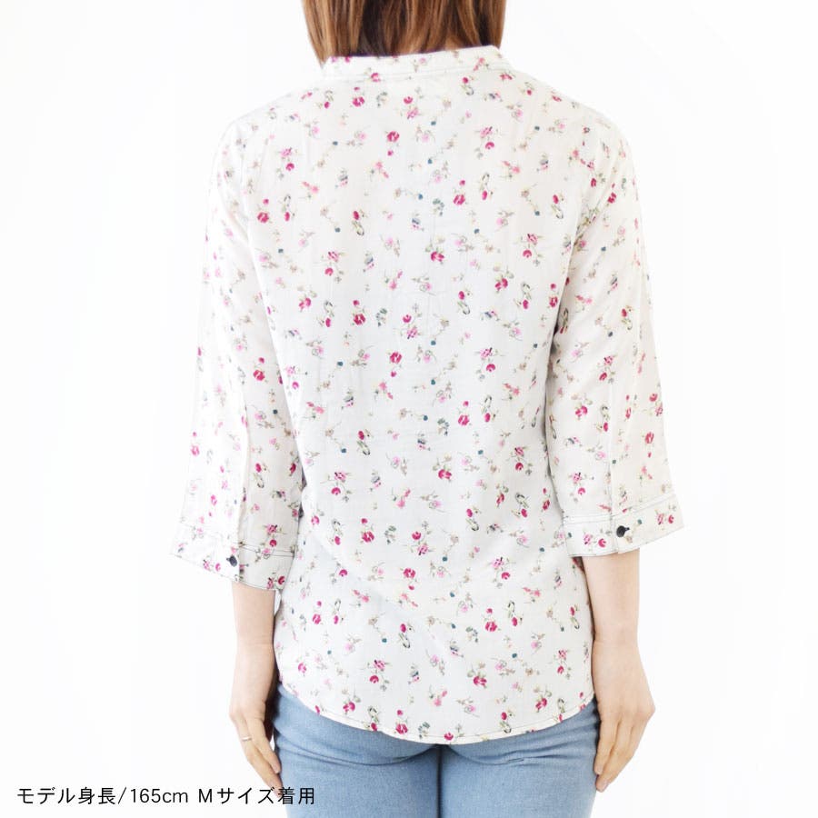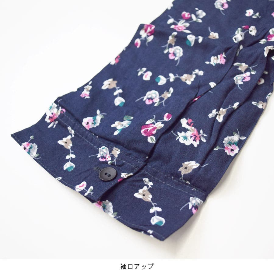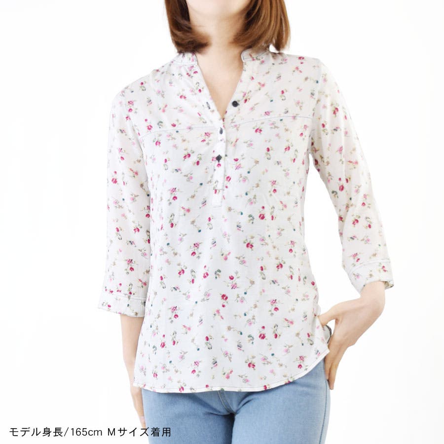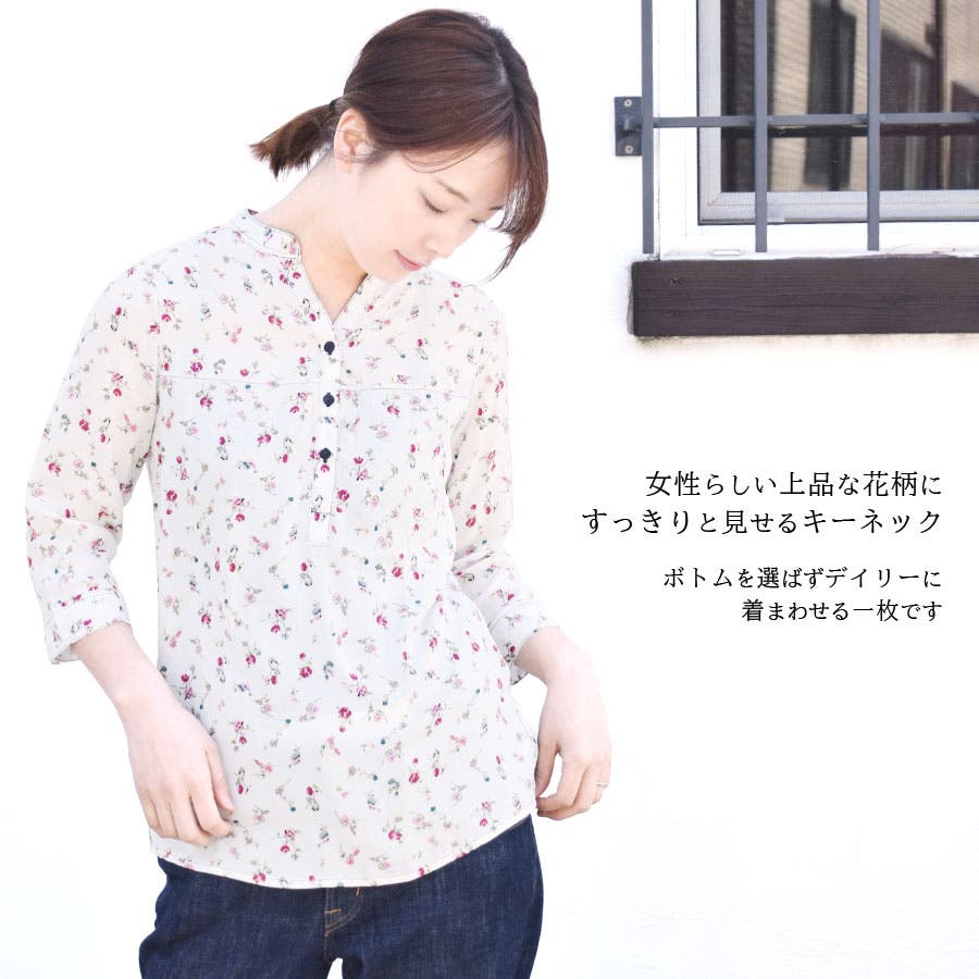 【シャツ ブラウス 七分袖 レディース トップス 花柄 フラワー 小花柄 総柄 キーネック スリット入り 薄手 カジュアル フェミニン おしゃれ かわいい 大人 さらさら 上品 婦人】