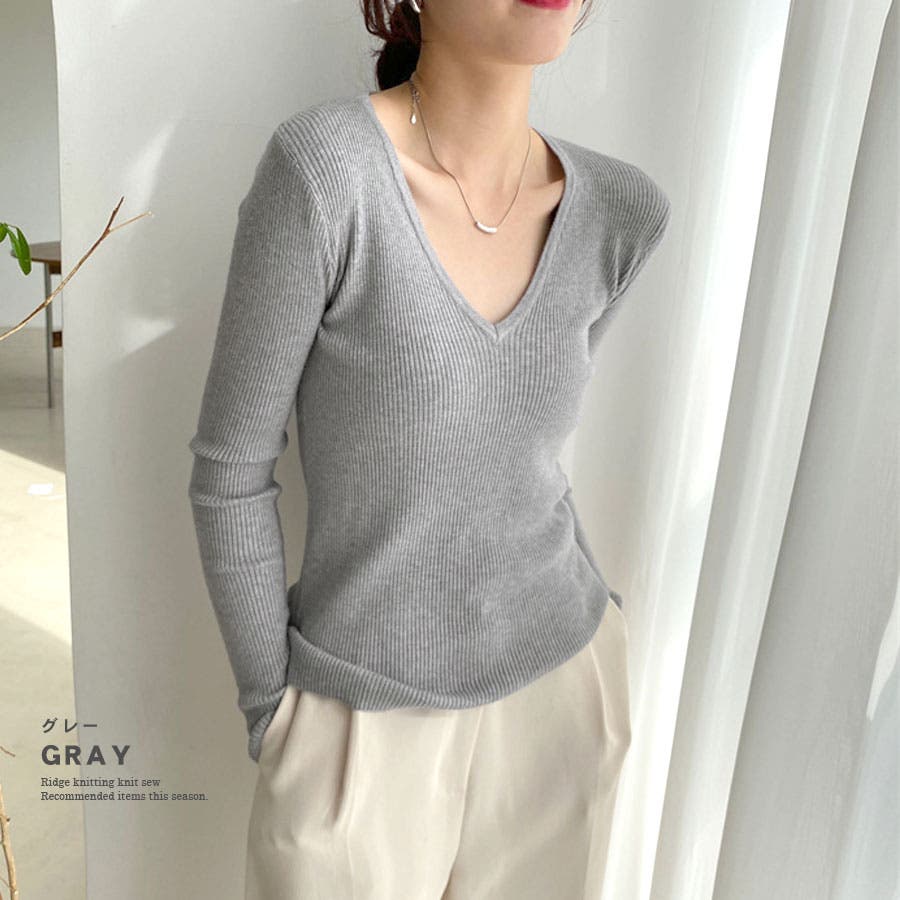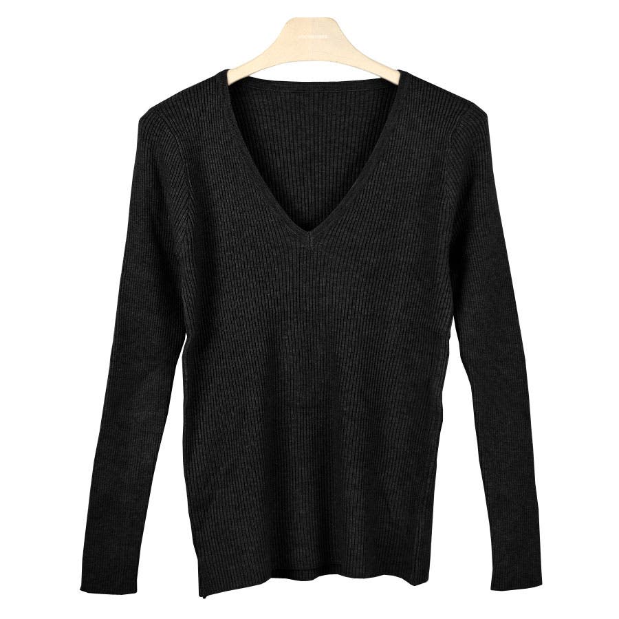 【Vネック リブ ニットソー ニット カットソー 深Vネック レディース トップス 長袖 伸び ストレッチ 伸縮性 タイト フィット リブ地 ぴったり もっちり 肉厚 綿混 韓国ファッション シンプル 無地 カジュアル デイリー】