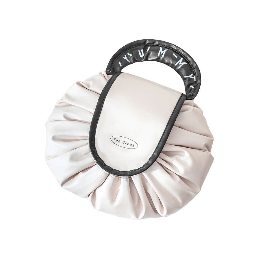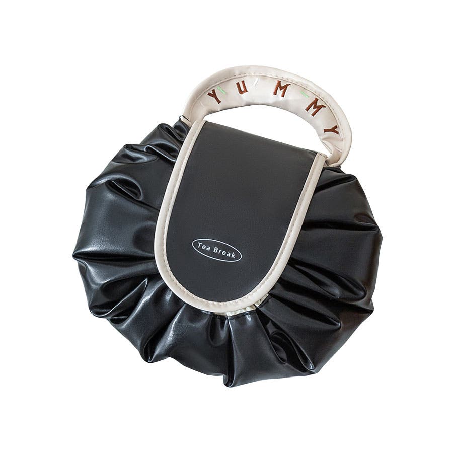 【コスメポーチ 化粧ポーチ 大容量 大きく開く 持ち歩き コンパクト 丸型 サークル おしゃれ 大きめ 巾着 ラウンド ドロスト マグネット ずぼら巾着 大判 収納 便利グッズ 時短 PUレザー バイカラー 配色 切り替え 英字 ロゴ YUMMY 小物 ずぼらポーチ トラベルポーチ 旅行】