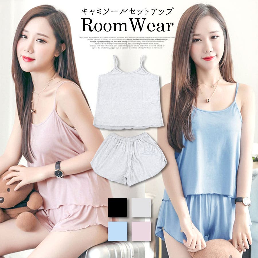 【ルームウェア セットアップ キャミソール ショートパンツ 上下セット 部屋着 パジャマ レディース ゆったり ネグリジェ ランジェリー ルーズ リラックス 寝間着 さらさら タッチ ボトム インナー ノースリーブ 韓国風 お洒落 シンプル 無地】
