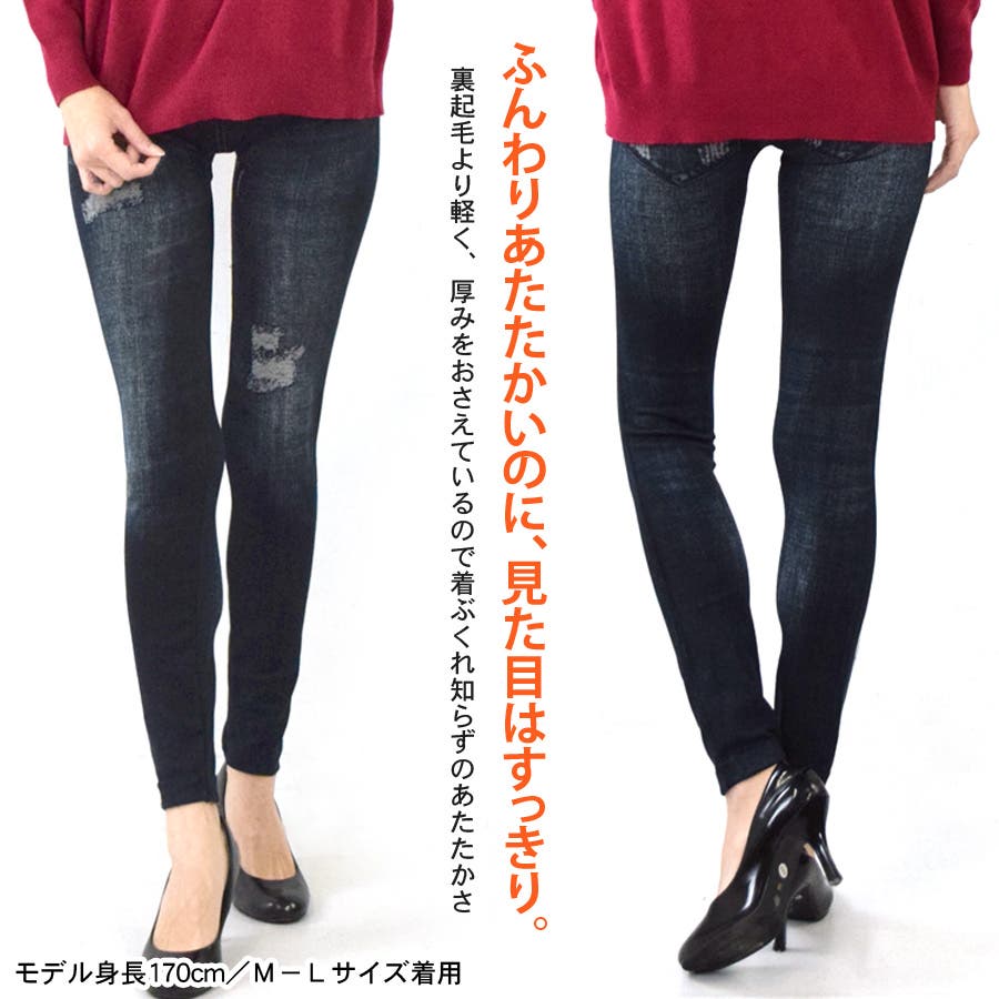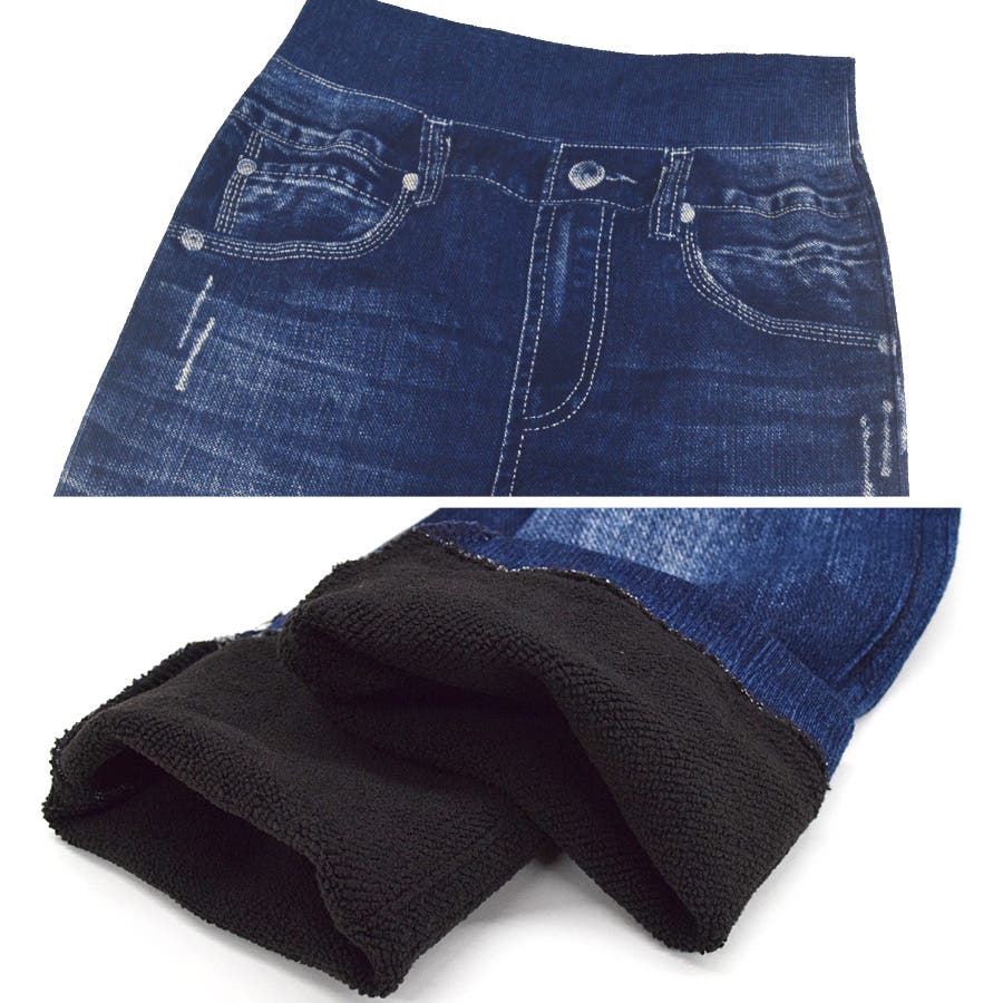 【裏パイル 裏毛 保温 あったか デニム風 レギンス レギンスパンツ レディース ボトムス デニム ハイウエスト ウエストゴム 伸縮性 ストレッチ デニムパンツ レギパン 裏起毛 ぽかぽか ヒート プリント インディゴ ブルー ブラック 脚長 美脚 厚手】