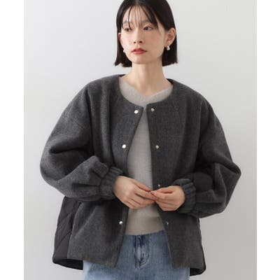 フロントはフェイクウール、後ろはタフタ生地のキルトパネルで切り替えたノーカラーのブルゾンです。