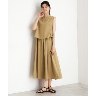 セットでコーディネートしたように見えるドッキングデザインはノースリーブに加え、トップス部分のフレアシルエットでスタイルアップを実現。