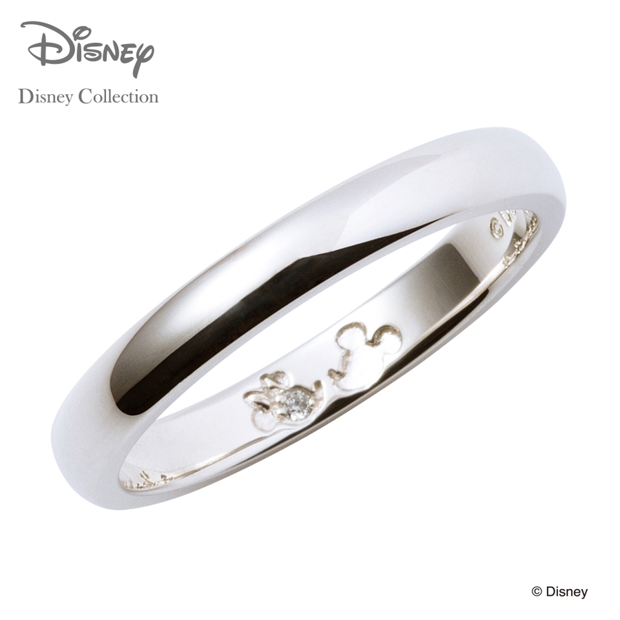【ディズニーコレクション】シンプルな甲丸リング。リングの内側にはミッキーとミニーのがキスしているシルエットが刻印されています。さらにレディースはミニー、メンズはミッキーのシルエットにダイヤモンドがセット。さりげなくディズニー感を楽しみたいカップルにオススメのペアリングです。