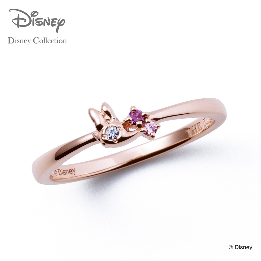 【ディズニーコレクション】デイジーのシルエットの隣にイメージカラーのストーンをセットした、シンプルな中にもキャラクターらしさが詰め込まれたリング。立体的なリボンが、デザインのポイントです。