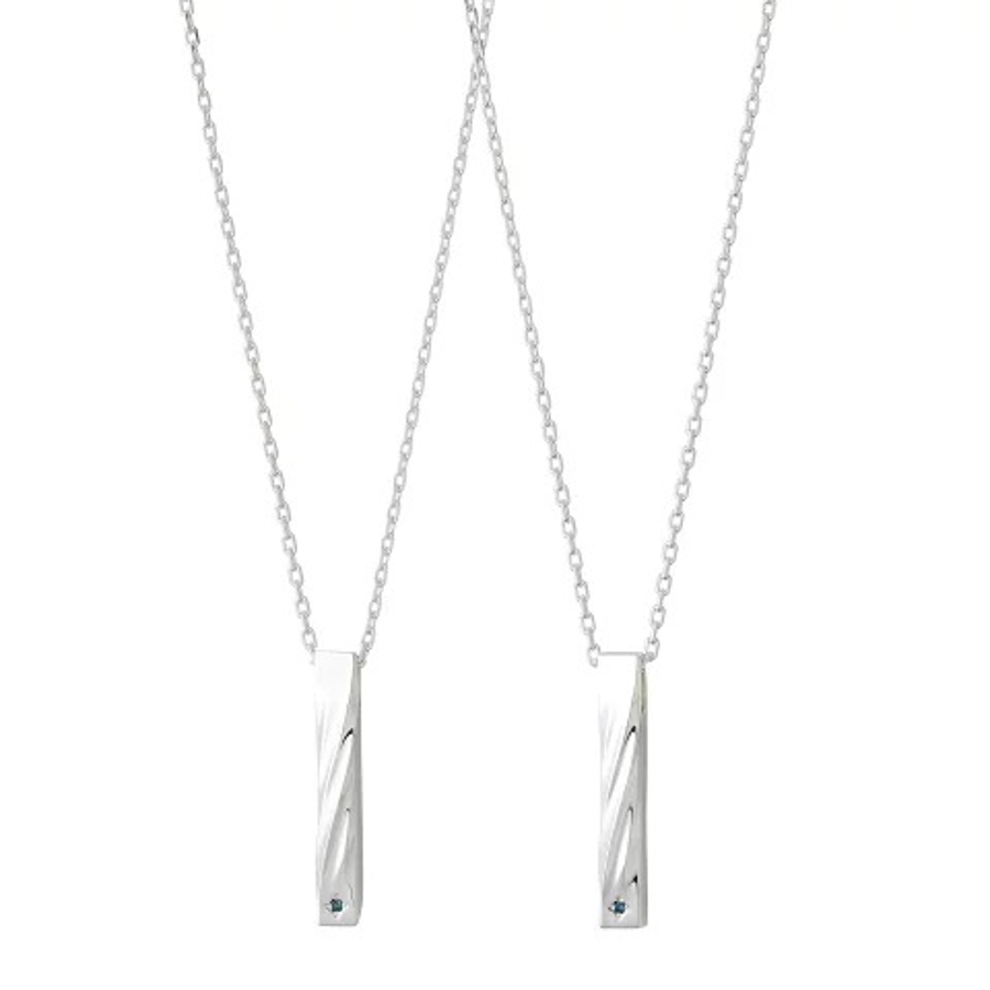幸せを呼ぶブルーダイヤモンドがポイントとなるシンプルなバータイプのネックレス。表面のしなやかなラインがやわらかな印象を与えてくれます。シンプルなデザインは服装を選ばず、カップルでつけていただきやすいネックレスです。