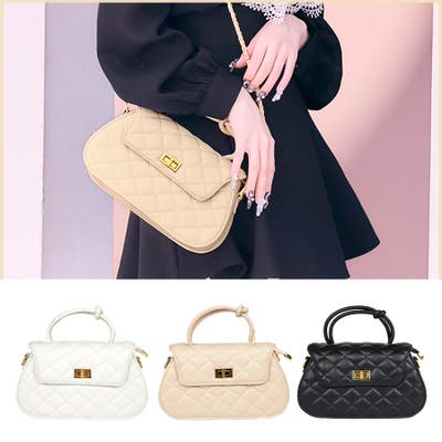 女の子らしい印象をメイクする結びハンドルキルティングバッグ。