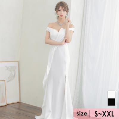 エレガントな雰囲気をメイクするオフショルサイドフリルロングドレス。