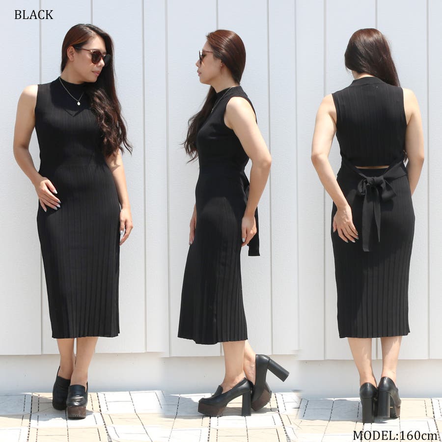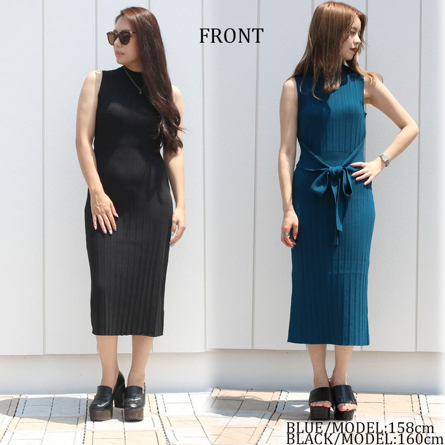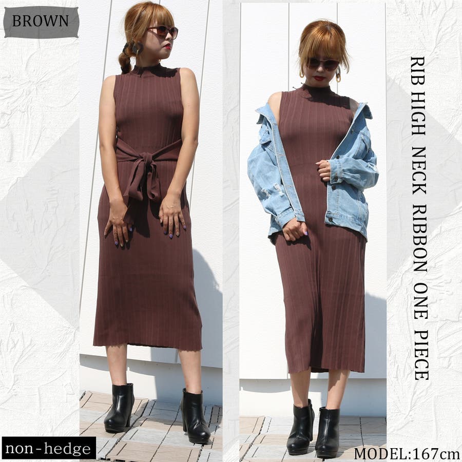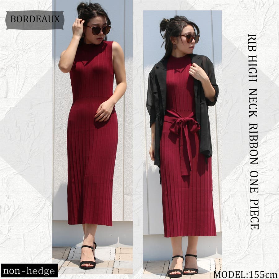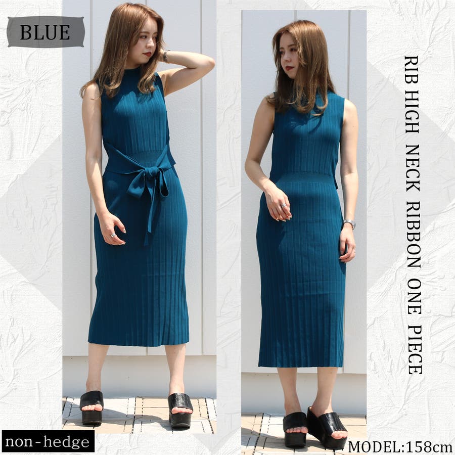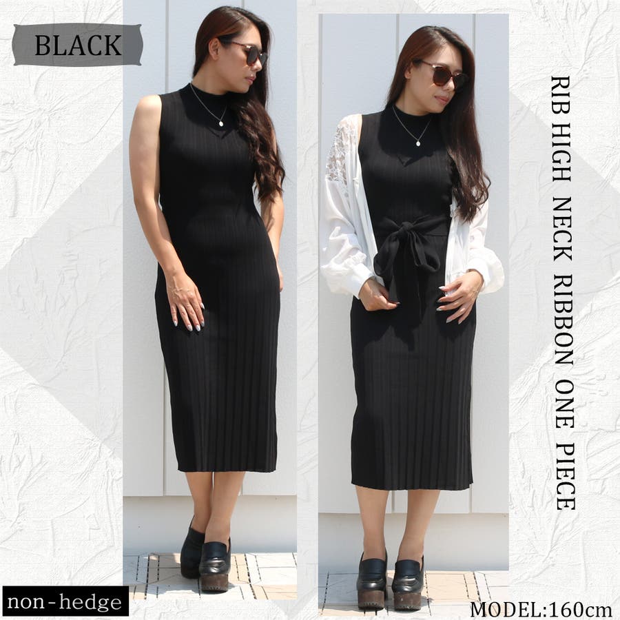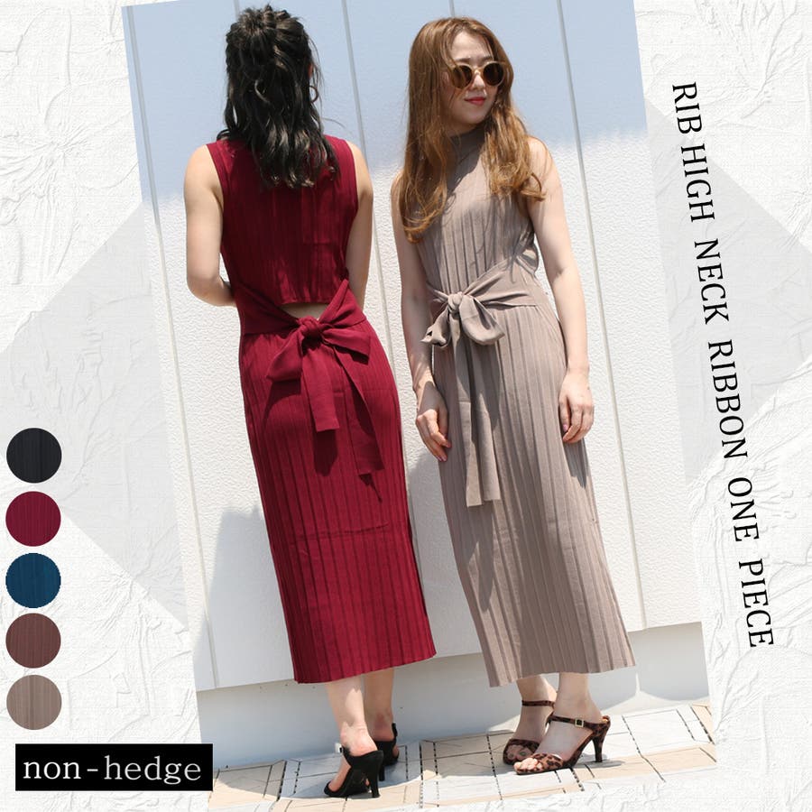 リブハイネックノースリリボンワンピース レディース ファッション