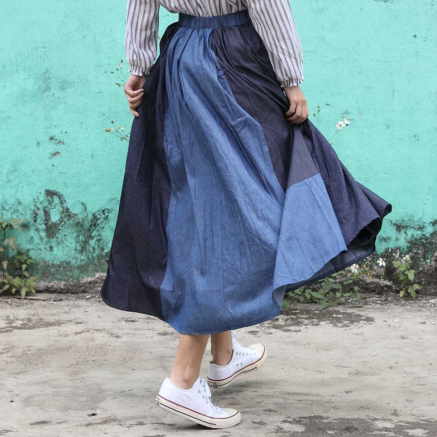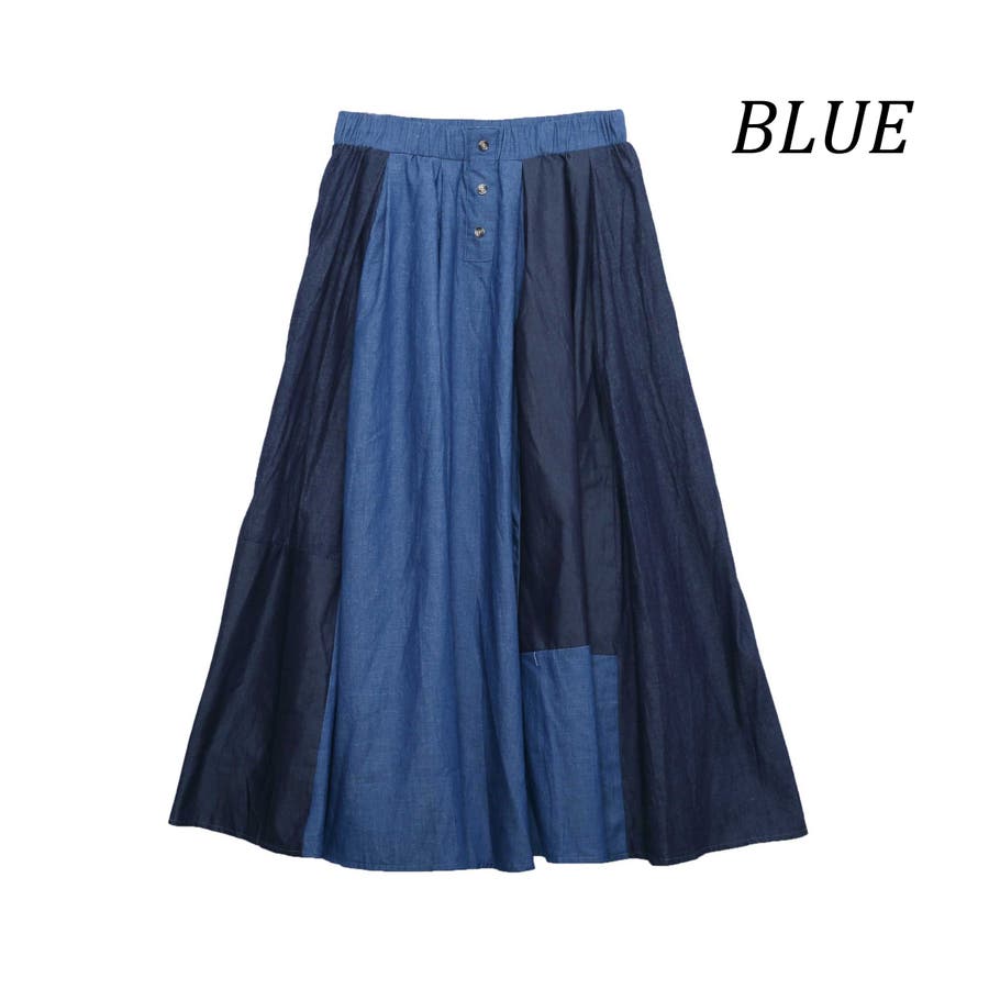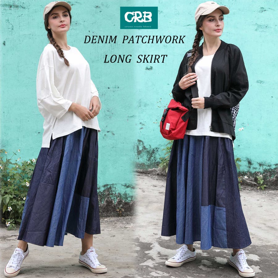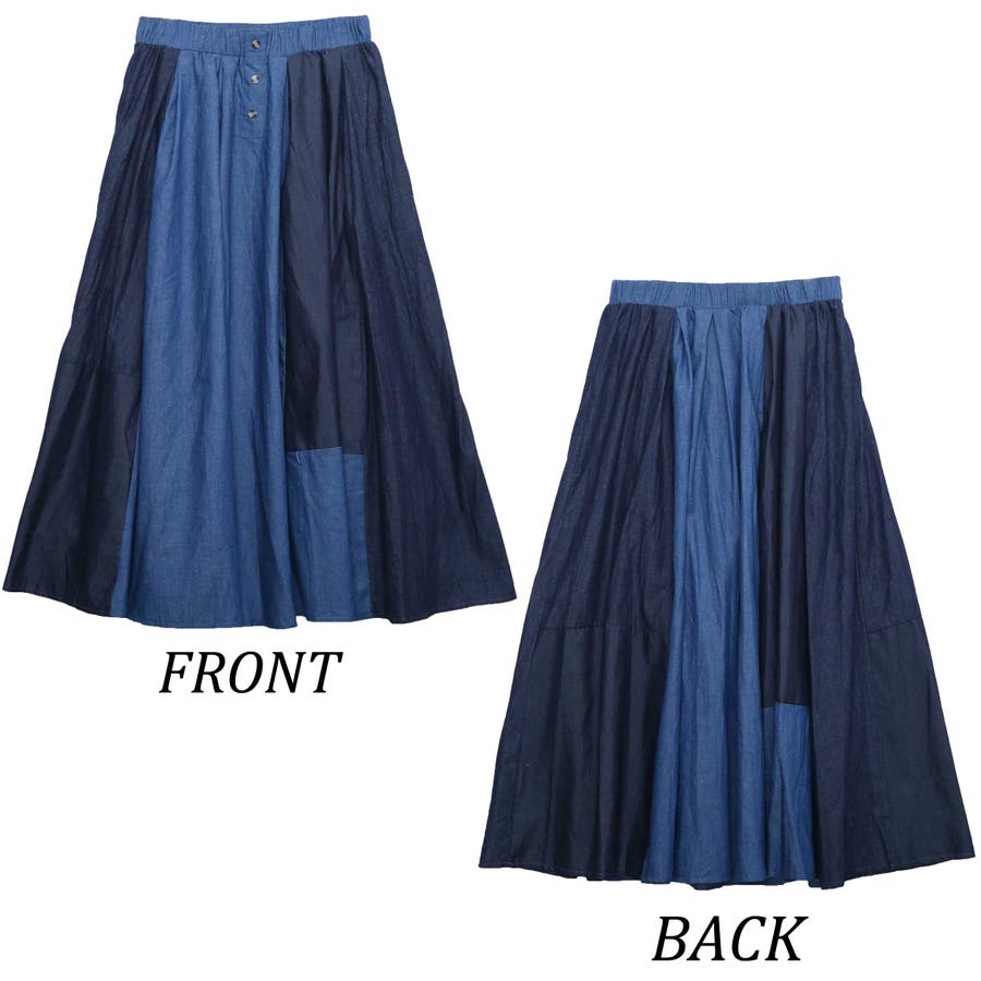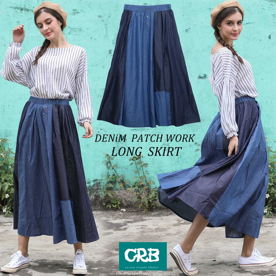 デニムパッチワーク切替がオシャレなロングスカートです。