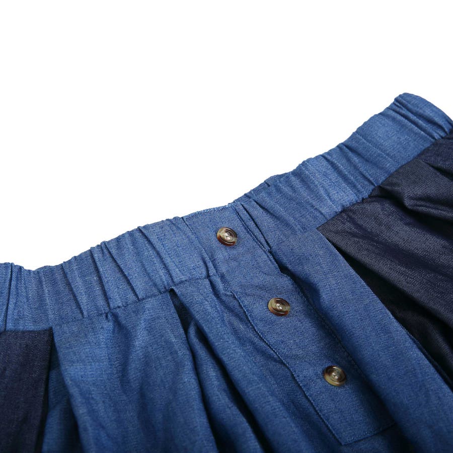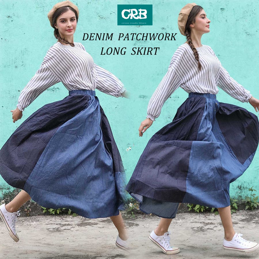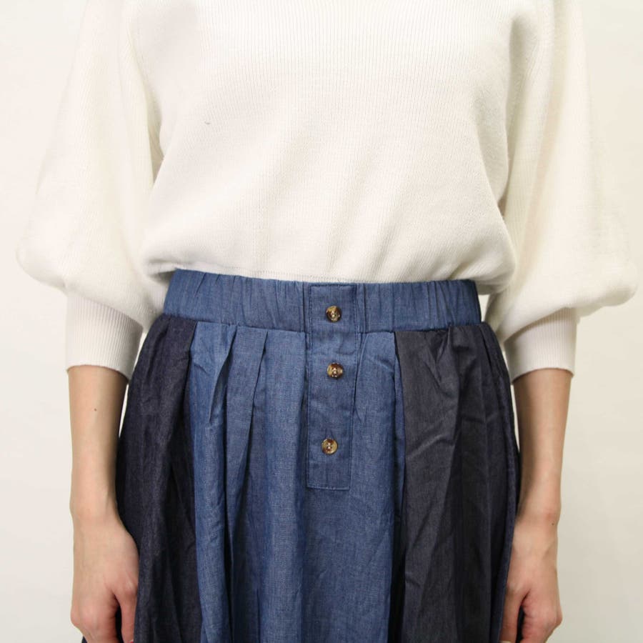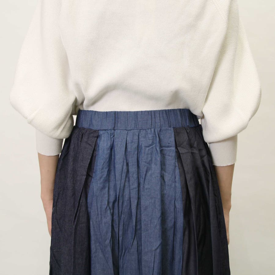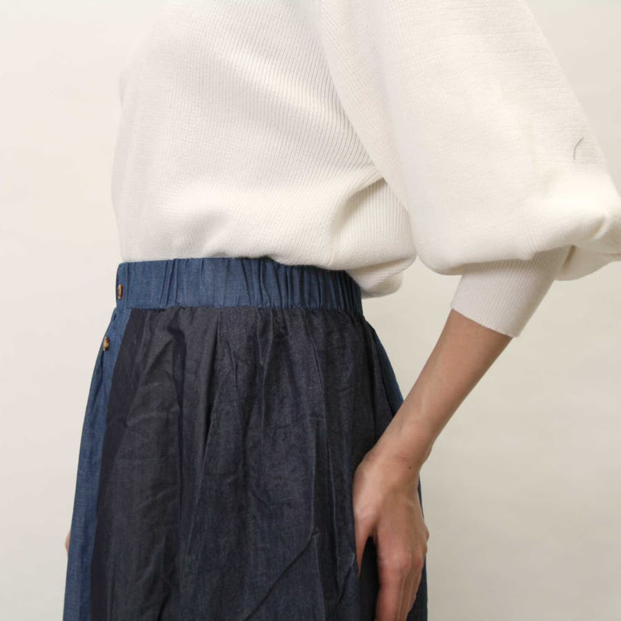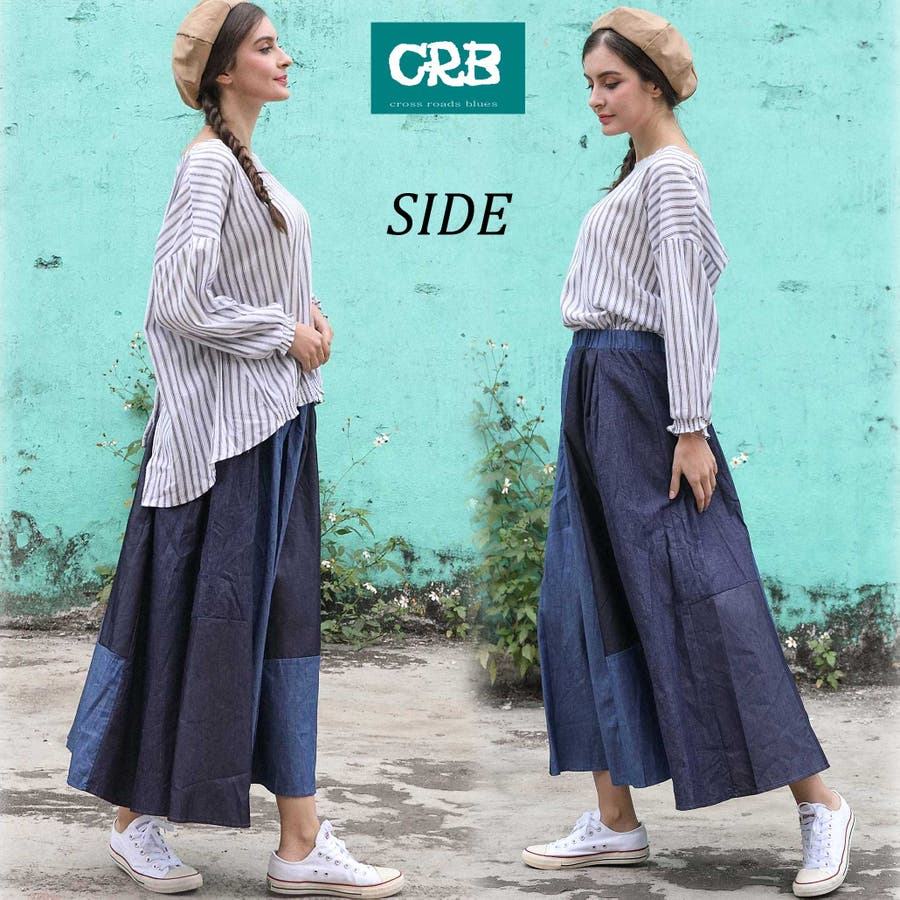 デニムパッチワーク切替がオシャレなロングスカートです。