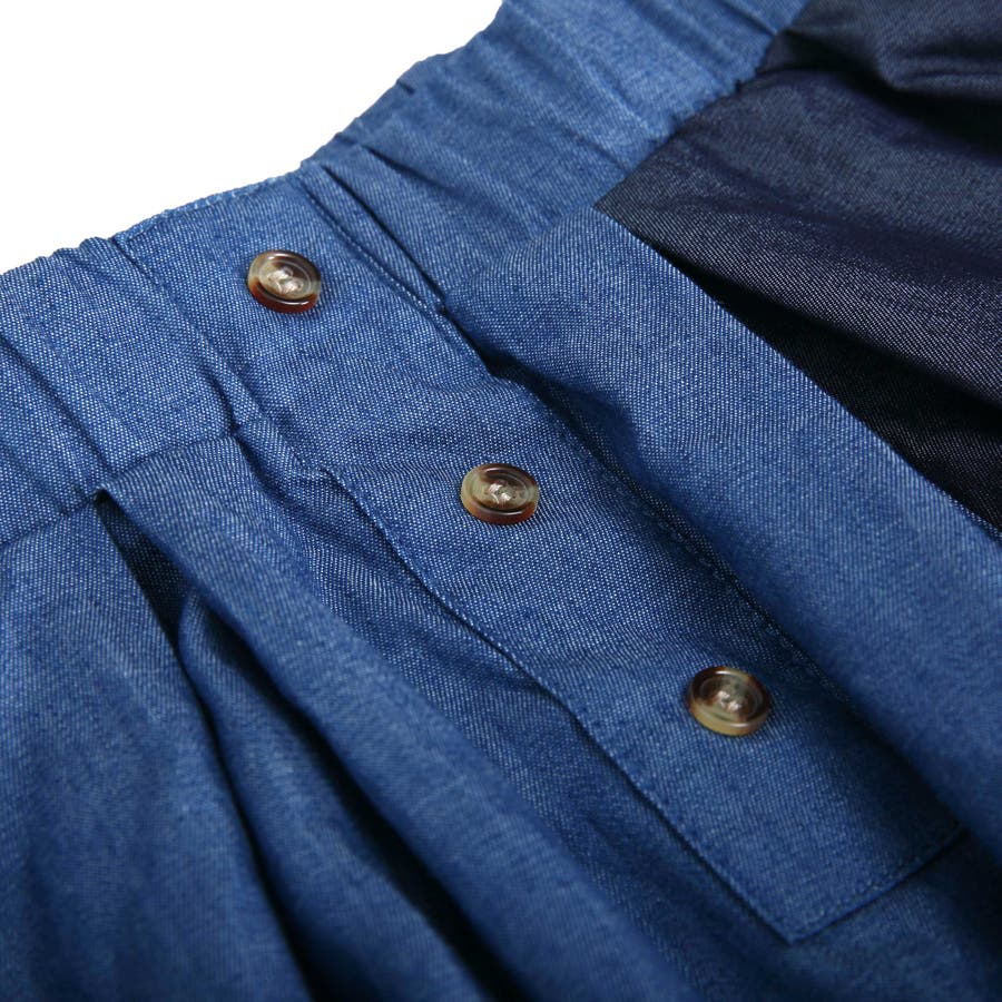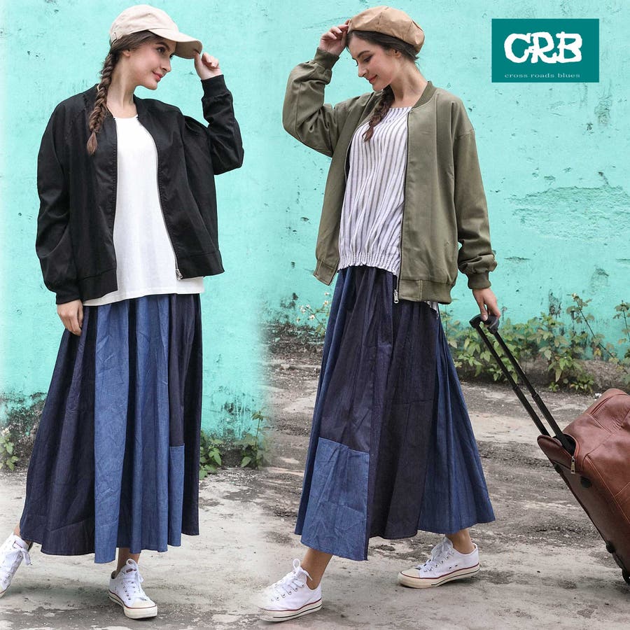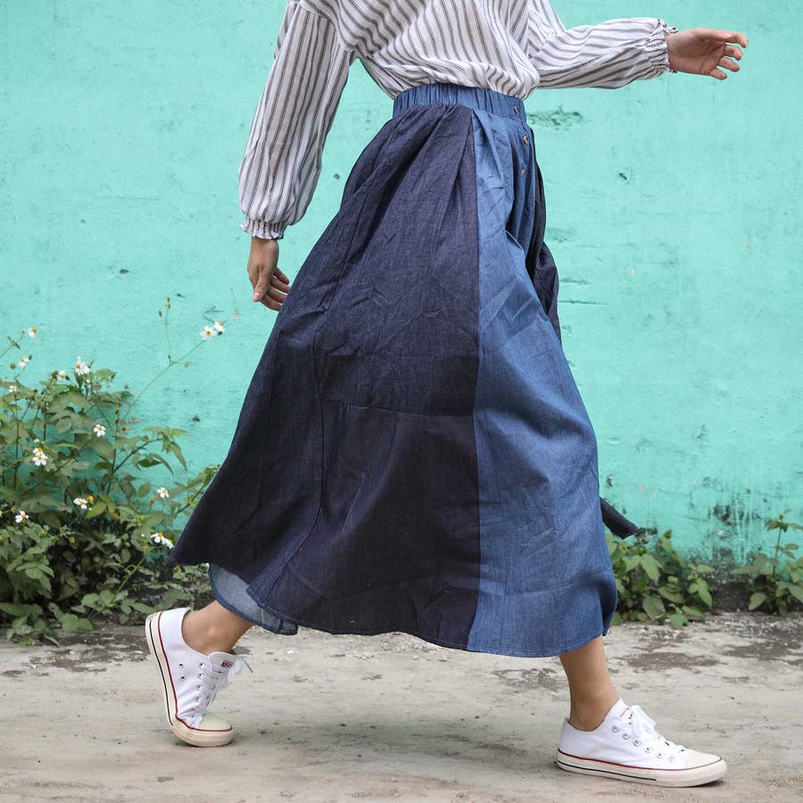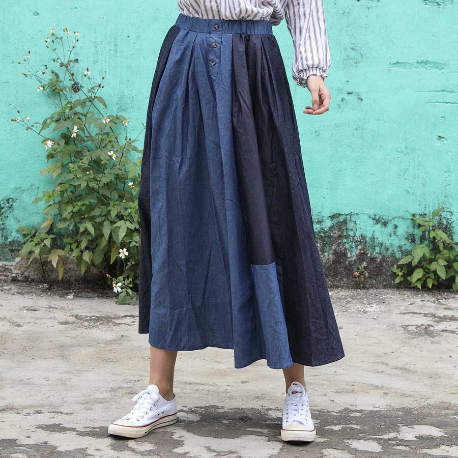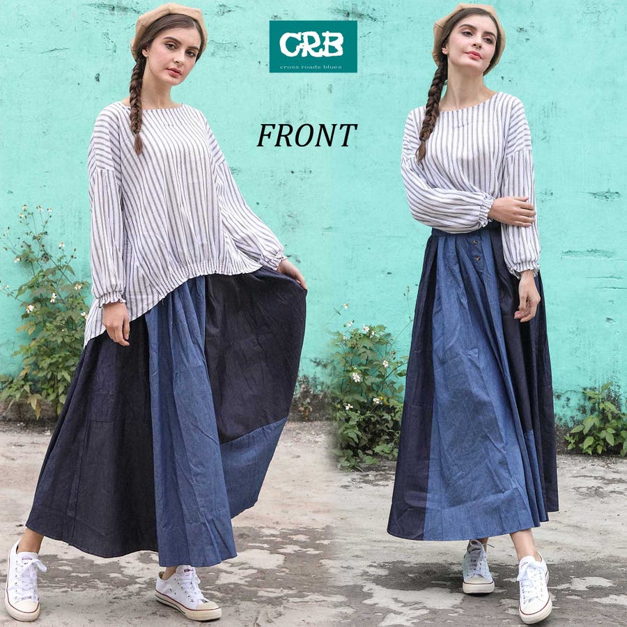 デニムパッチワーク切替がオシャレなロングスカートです。