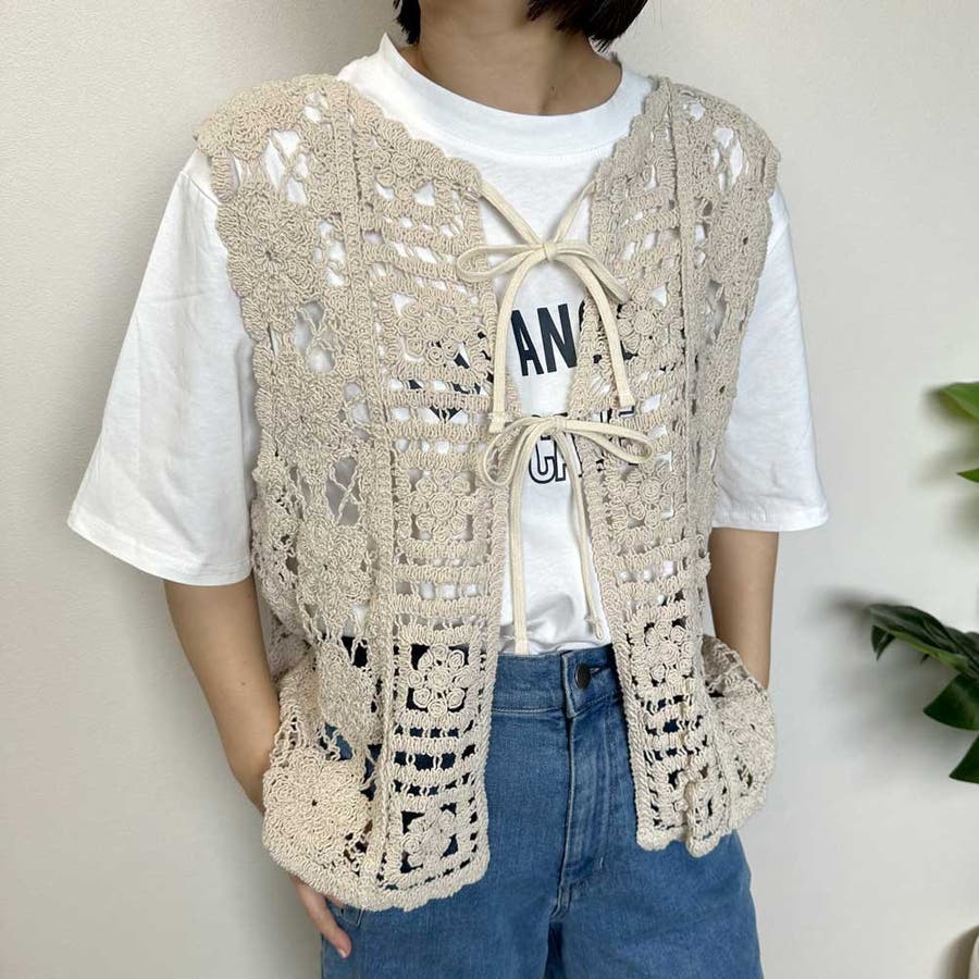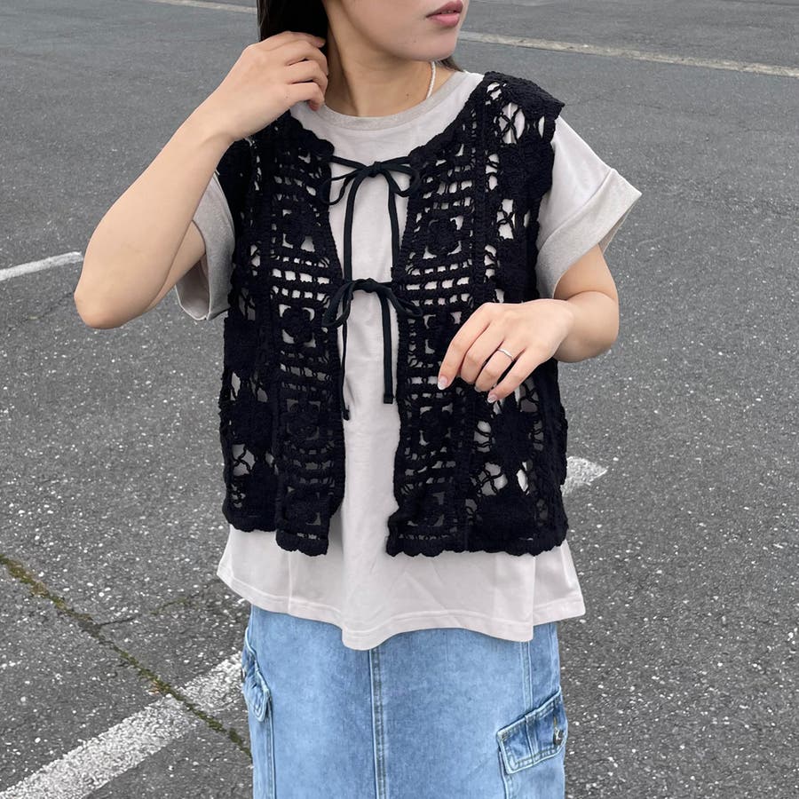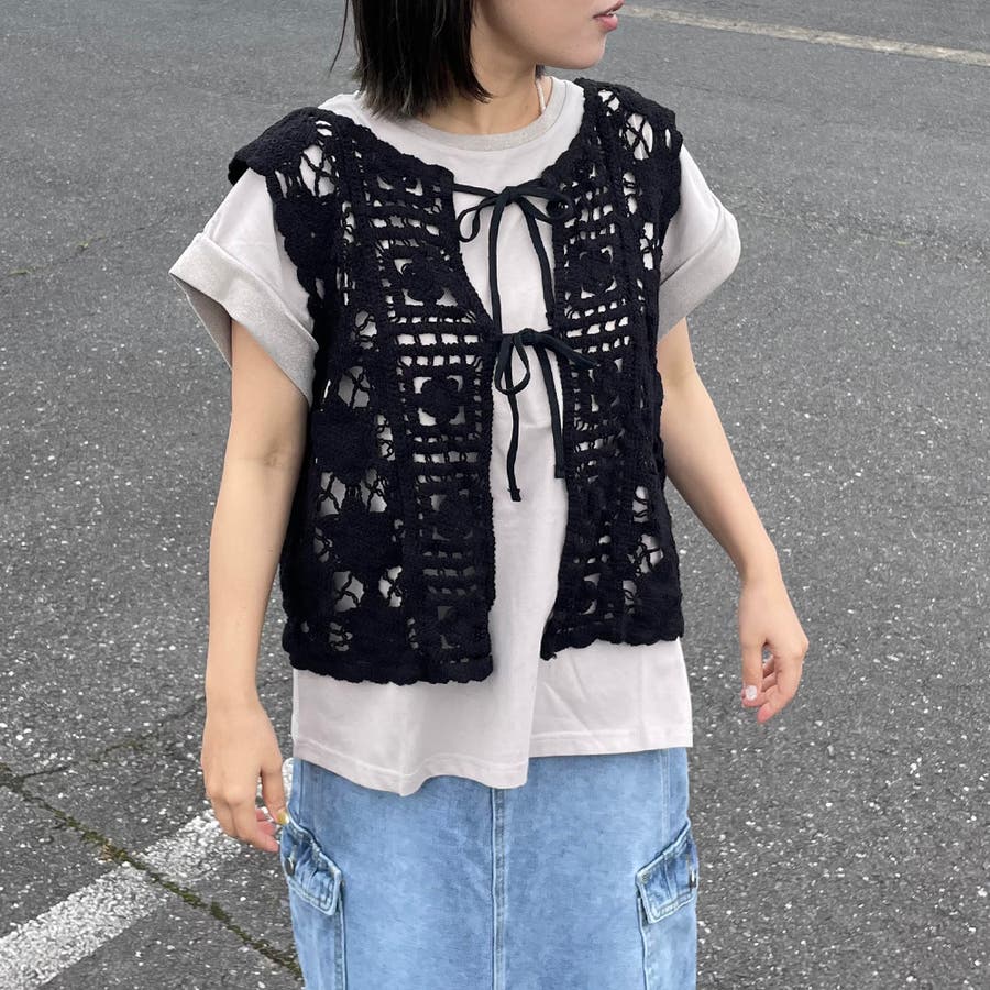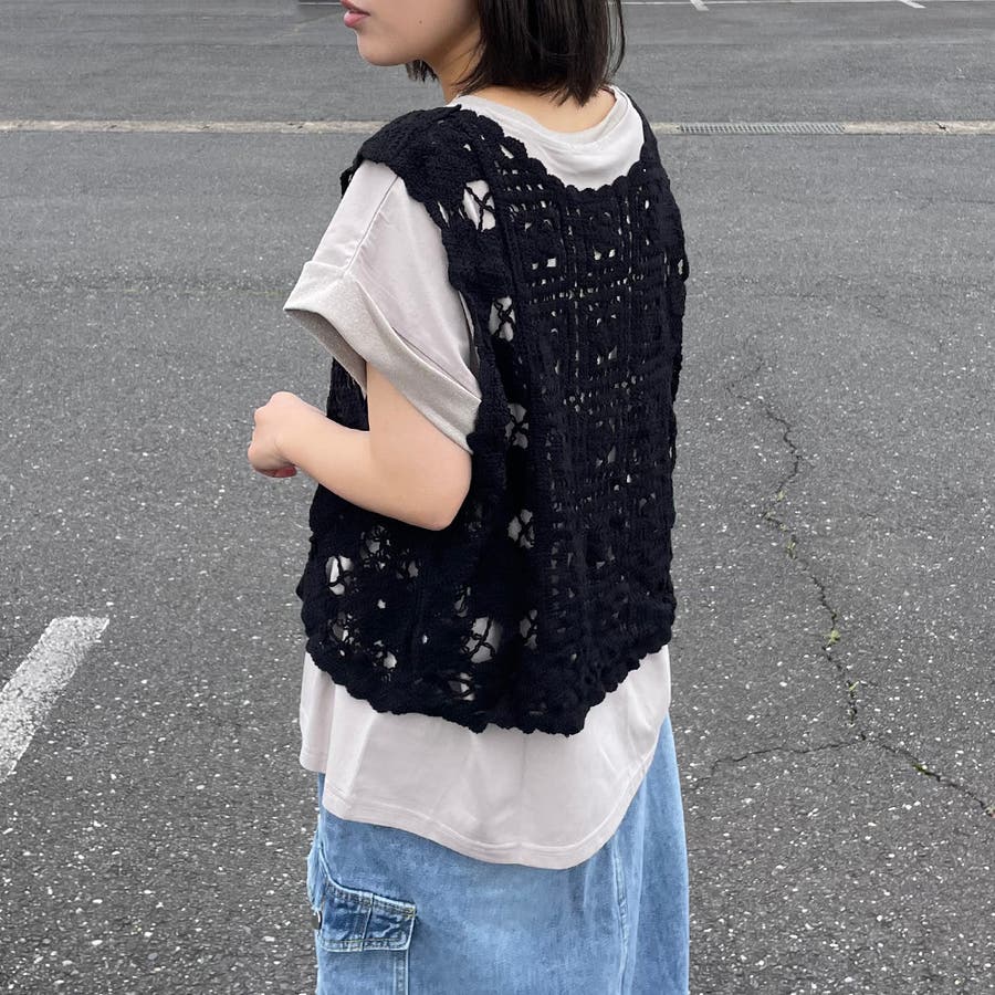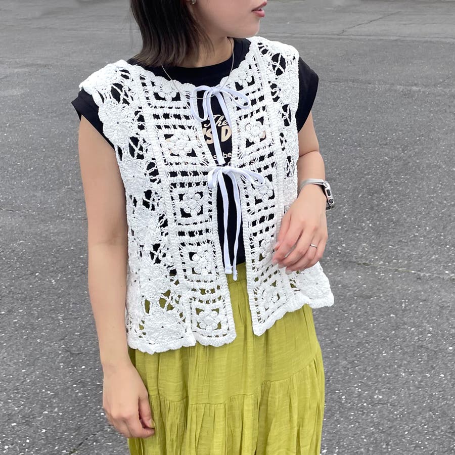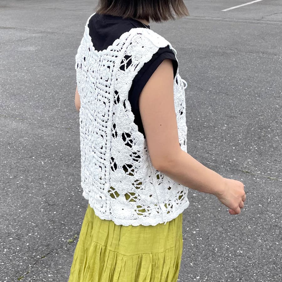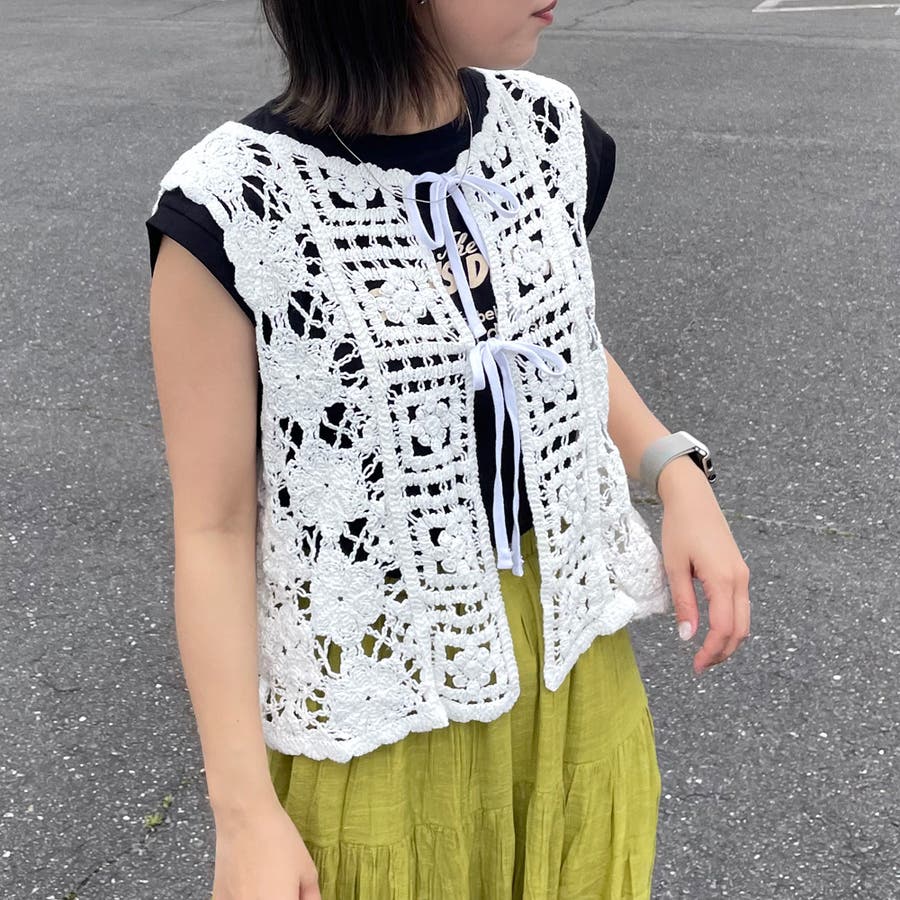 レディース/ファッション/おしゃれ/合わせやすい/大人/女性/春/夏/韓国/韓国ファッション/人気/定番/トレンド/新作/新着/新規/カジュアル/ナチュラル/ストリート/アウトドア/フェス/イベント/キャンプ/ラフ/シンプル/デザイン/無地/モード/ギャル/シアー/メッシュ/サマーニット/ノースリ/タンクトップ/ベスト/軽量/ゆったり/体型カバー/カジュアルダウン/羽織/羽織り/Vネック/レイヤード/オフホワイト/アイボリー/白/SS/ブラック/黒/クロ/かぎ編み/クロシェ