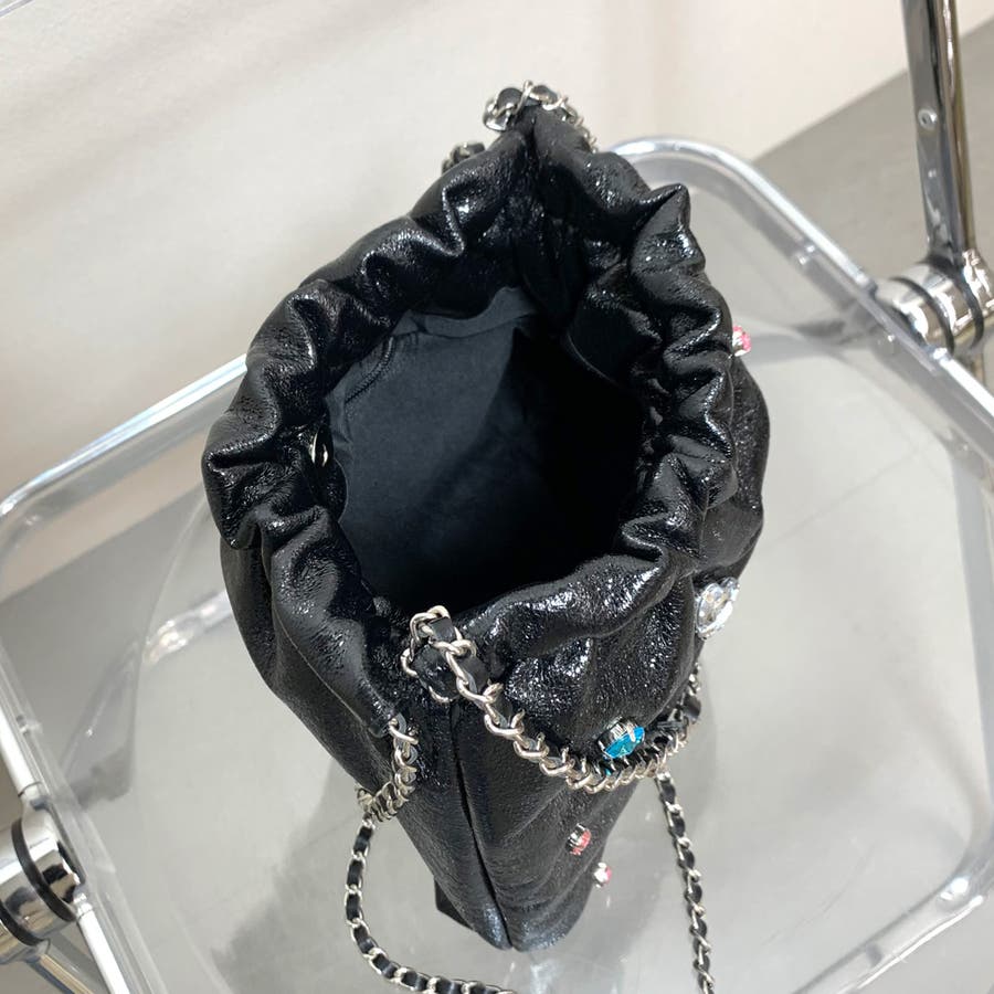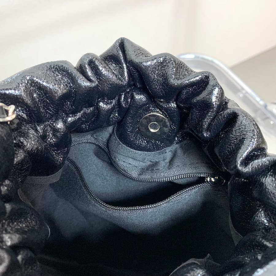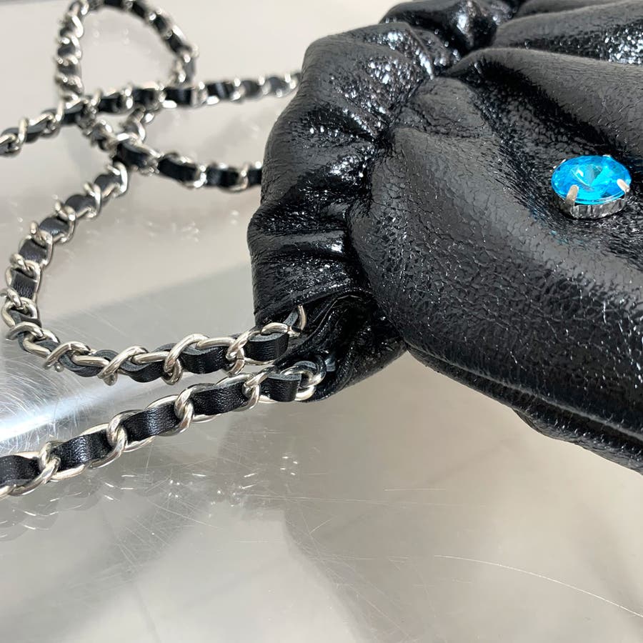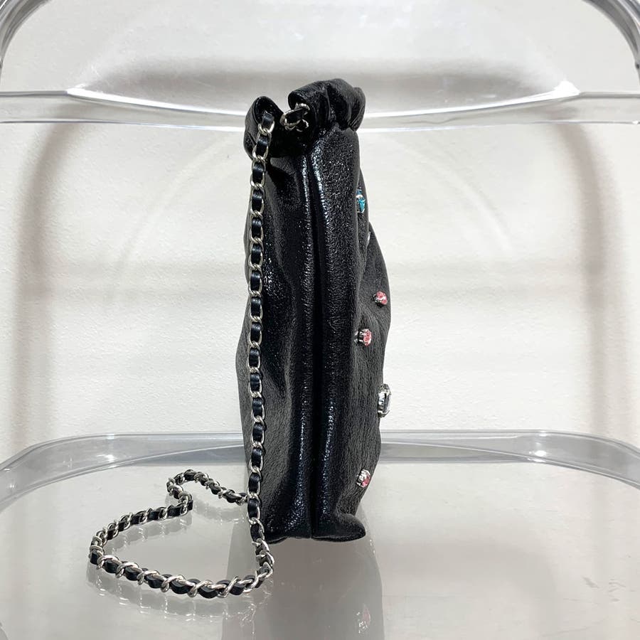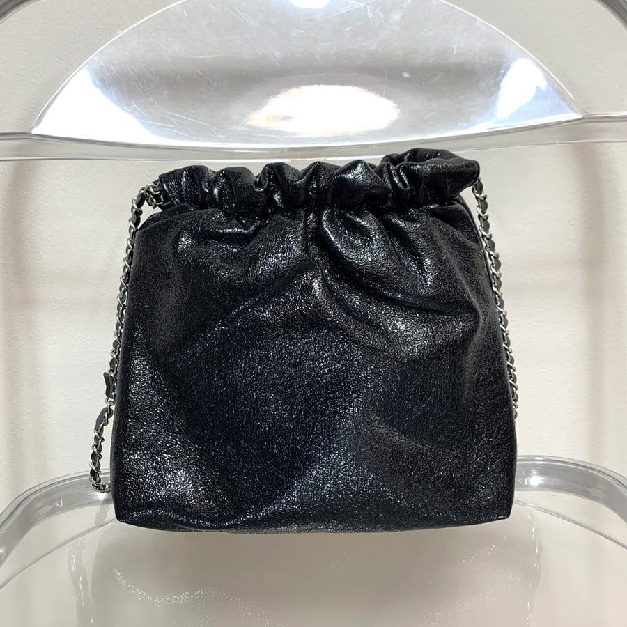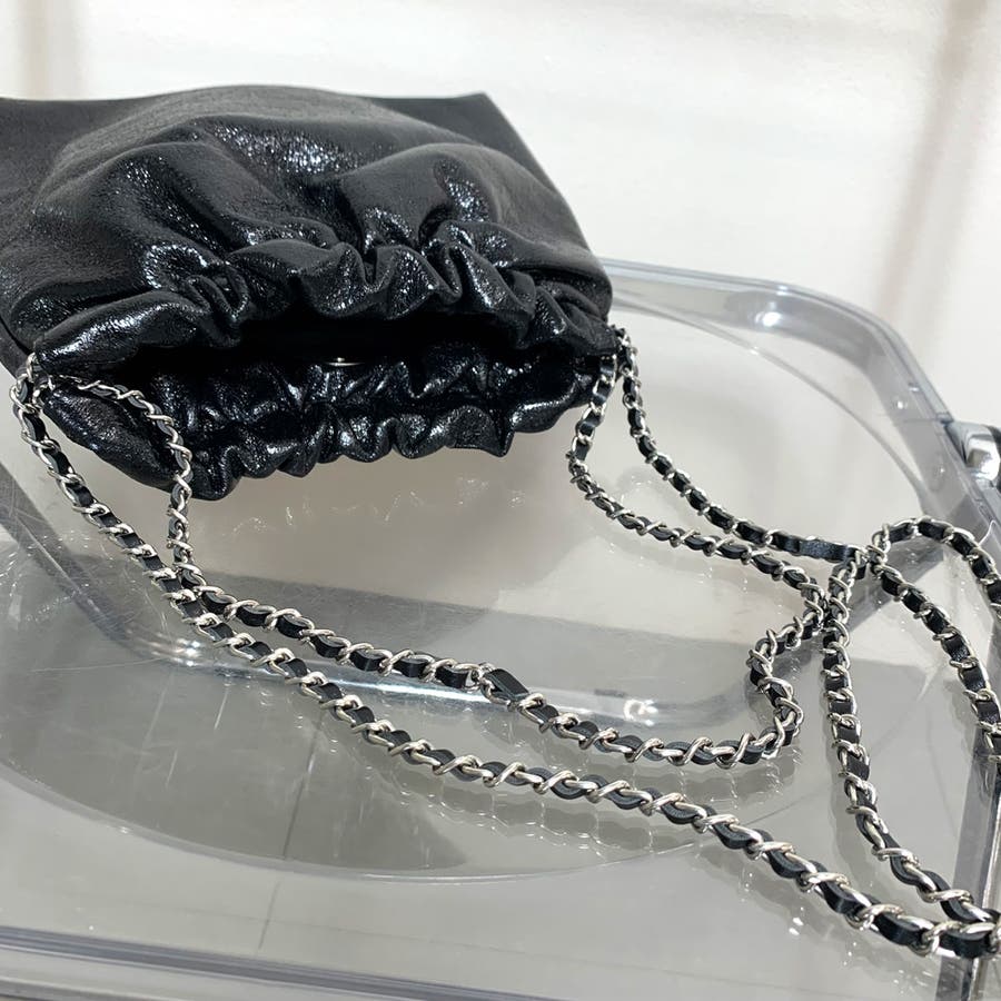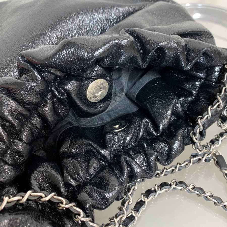 【サイズ】高さ23cm、上横幅18cm、底横幅19cm、マチ6cm、ショルダーチェーン105cm、持ち手チェーン60cm、重さ350g