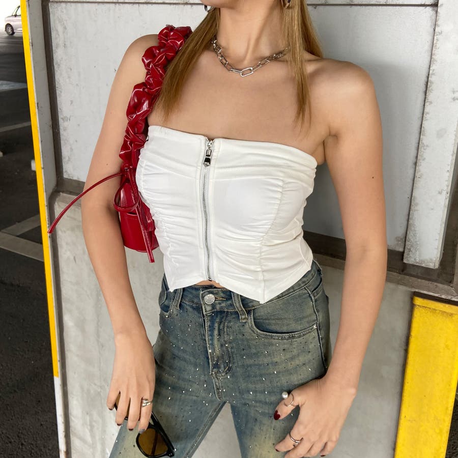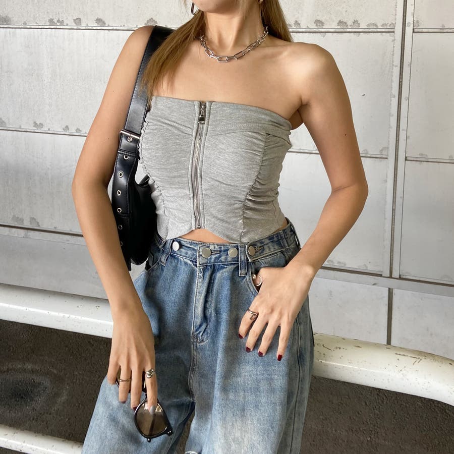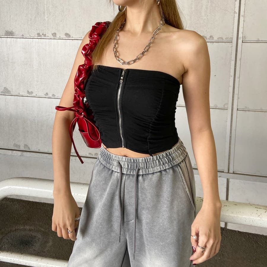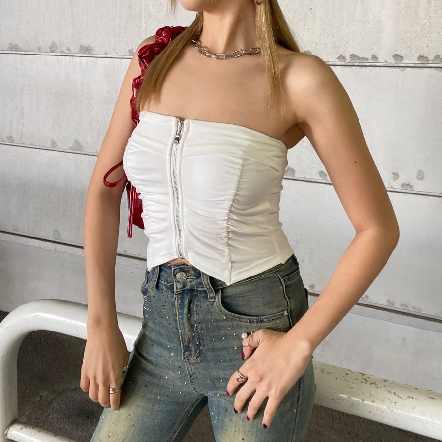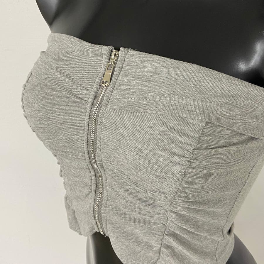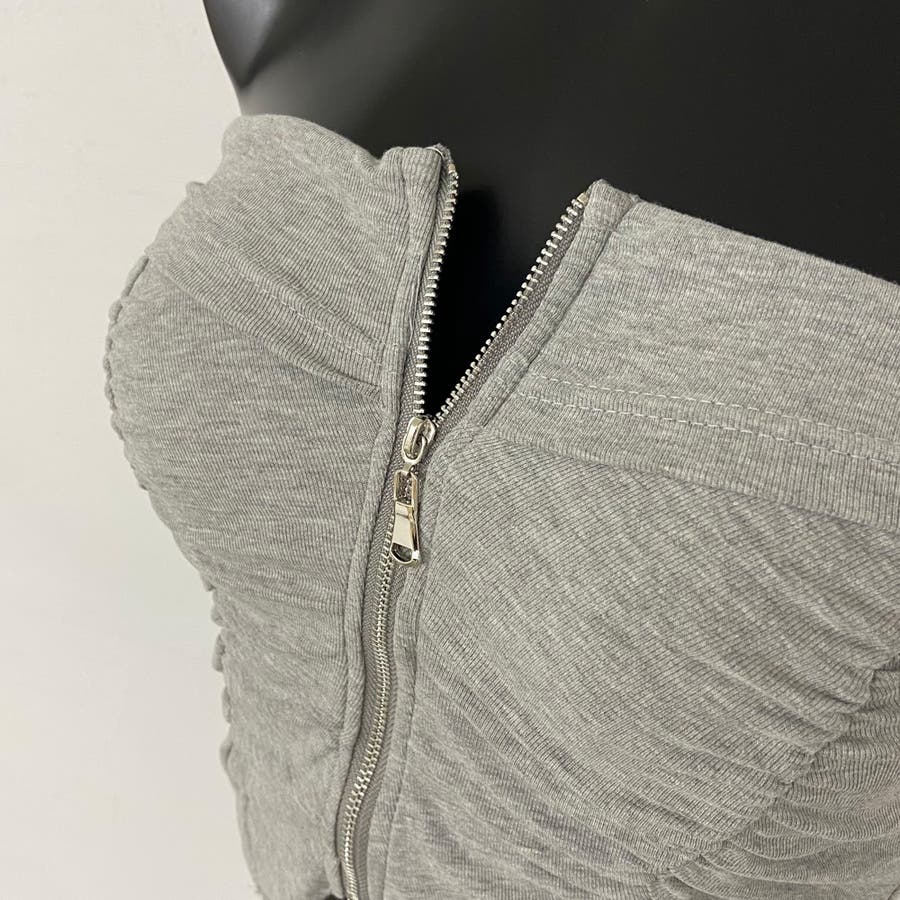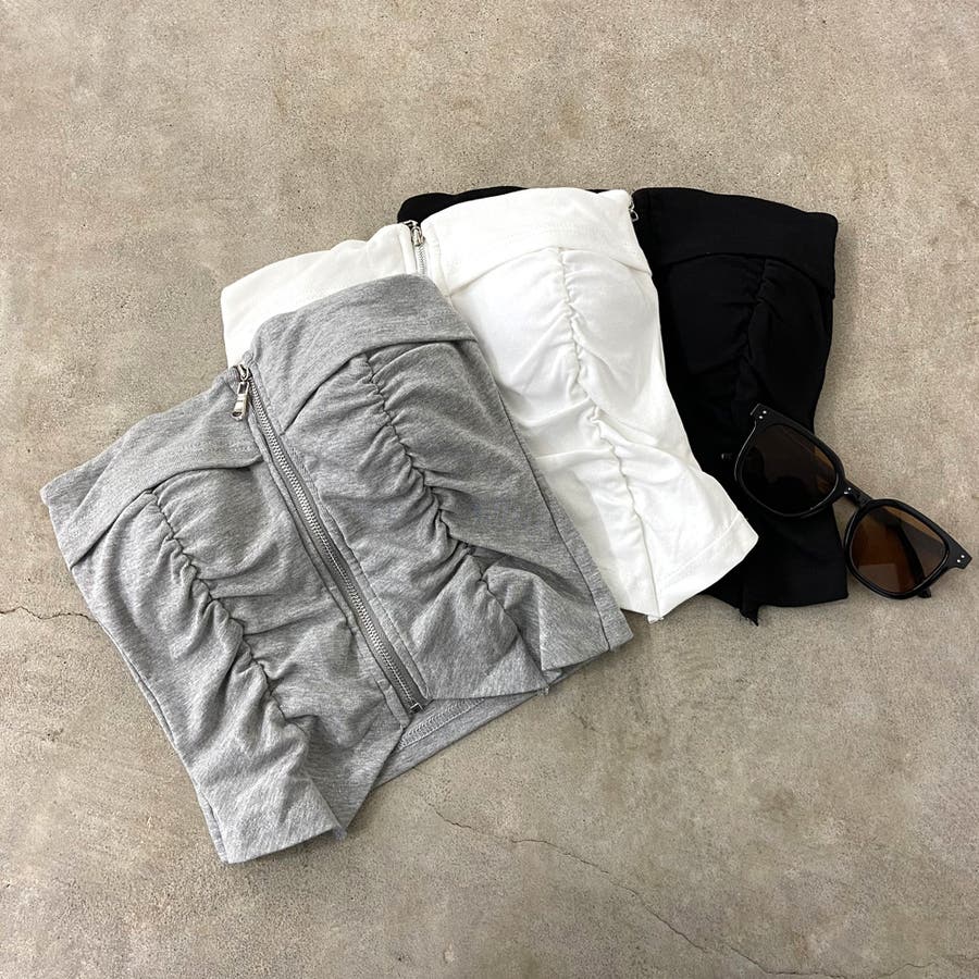 フロントZIPとギャザーデザインがアクセントになったベアトップ。