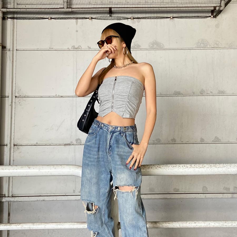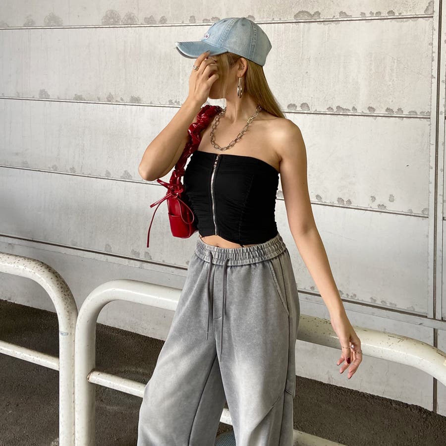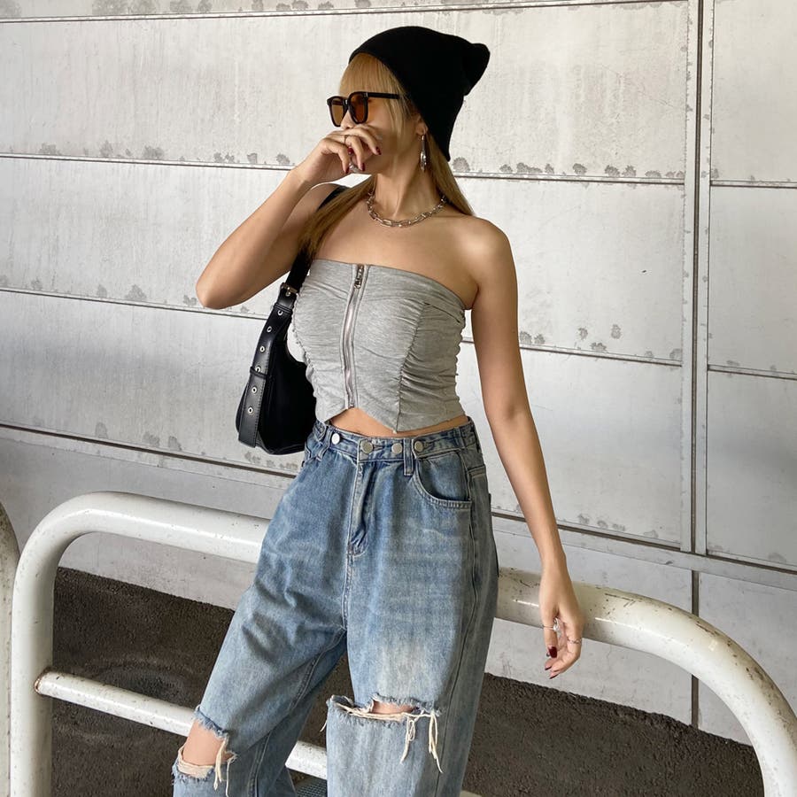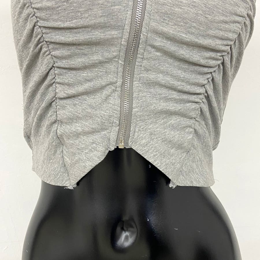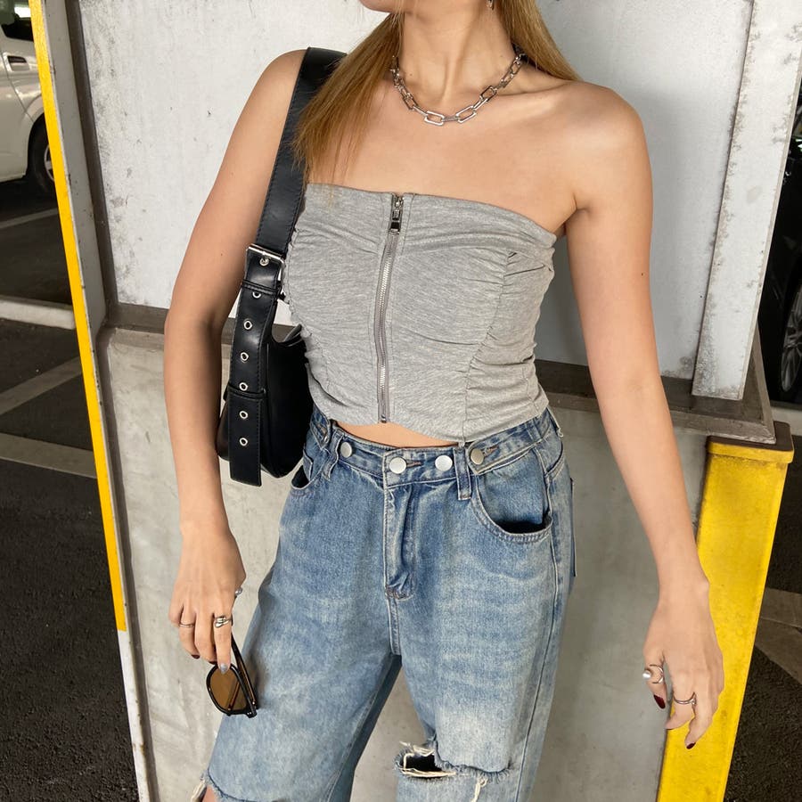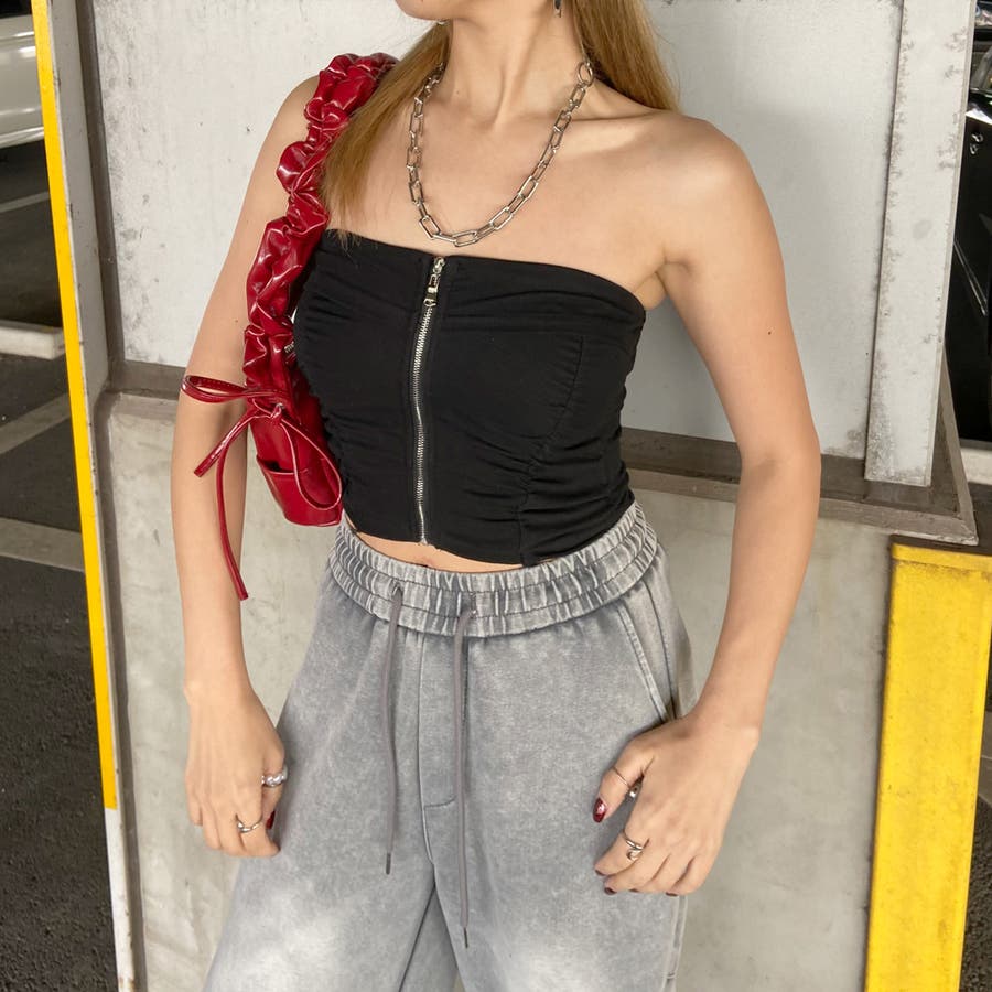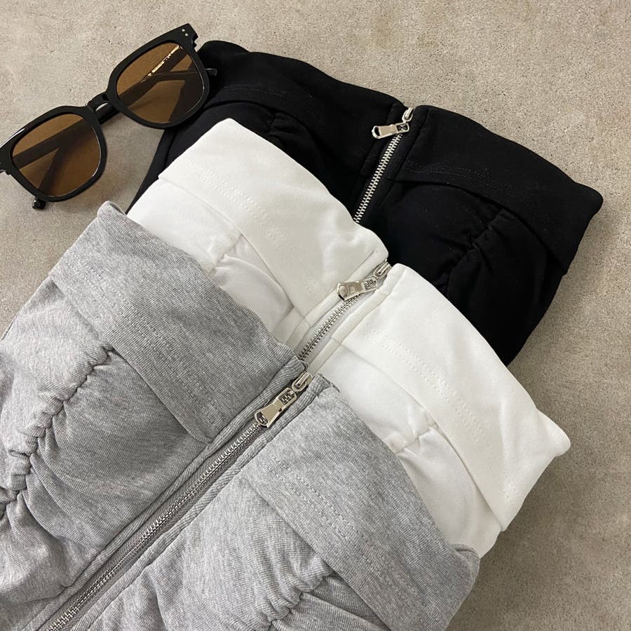 フロントZIPとギャザーデザインがアクセントになったベアトップ。