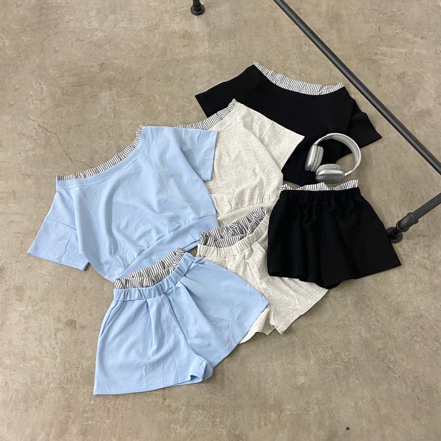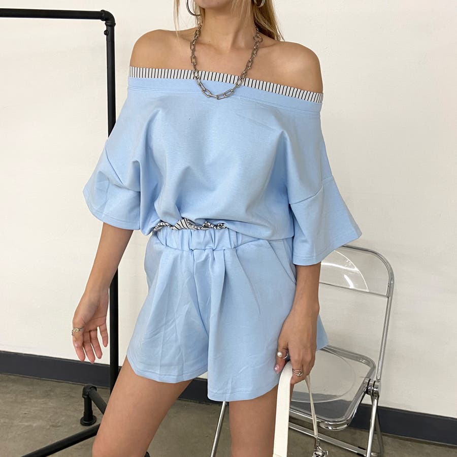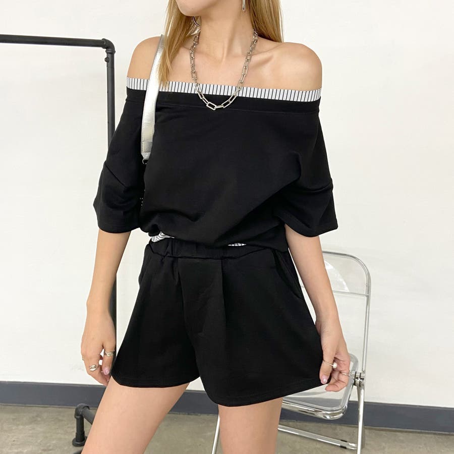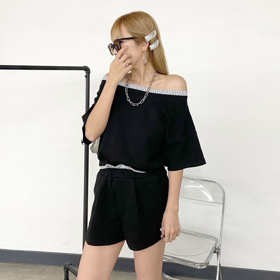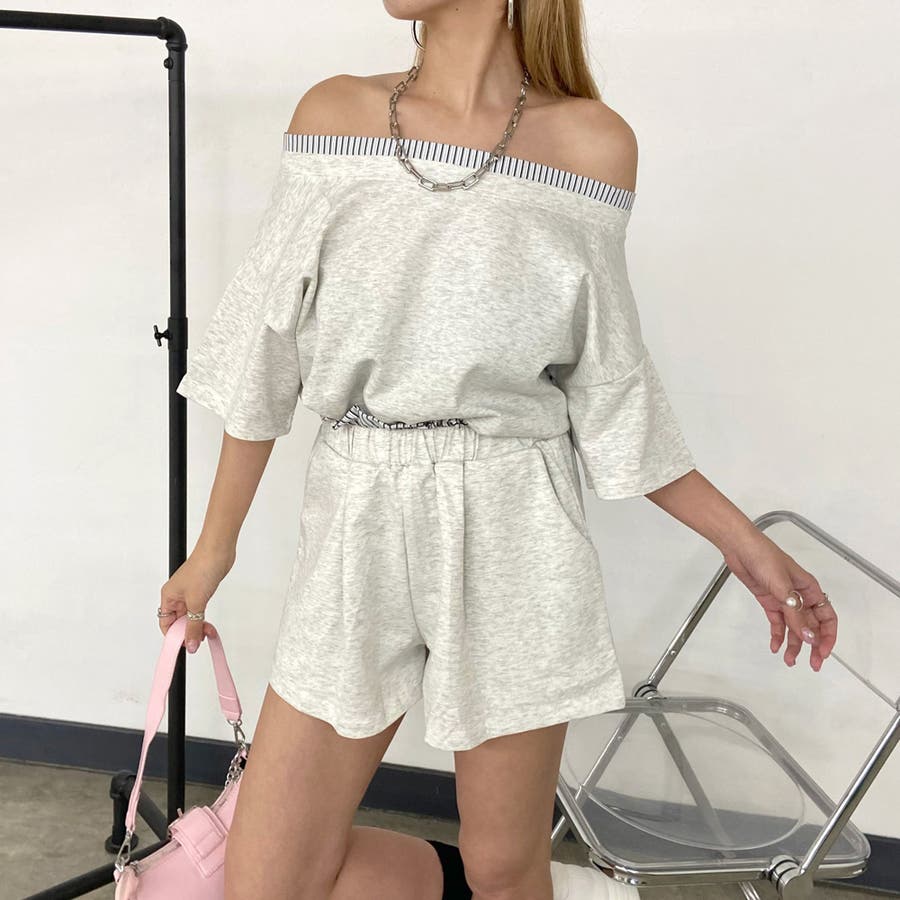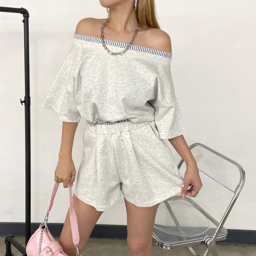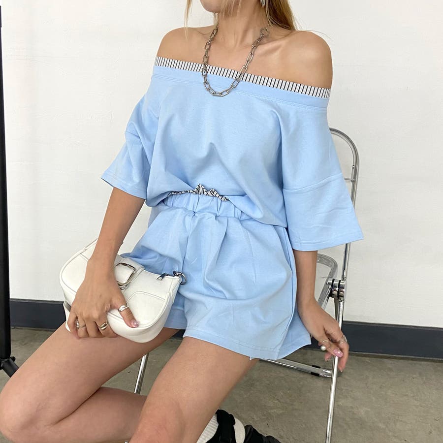 ストライプ切替オフショルトップス・ショートパンツセットアップ
