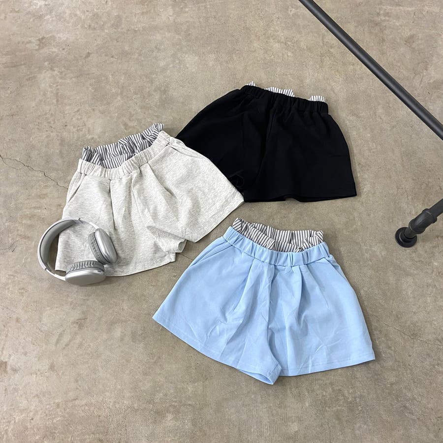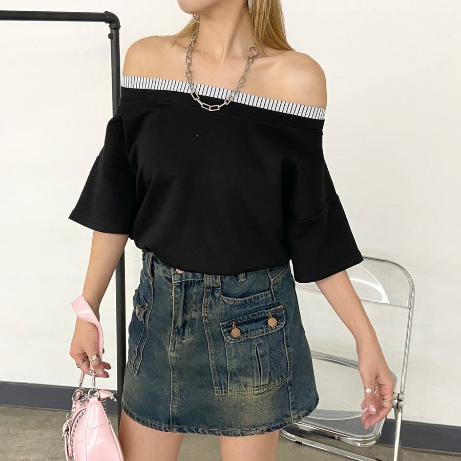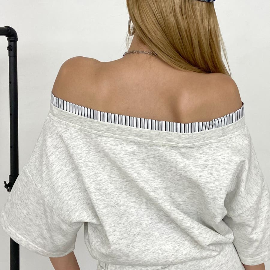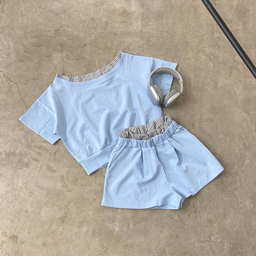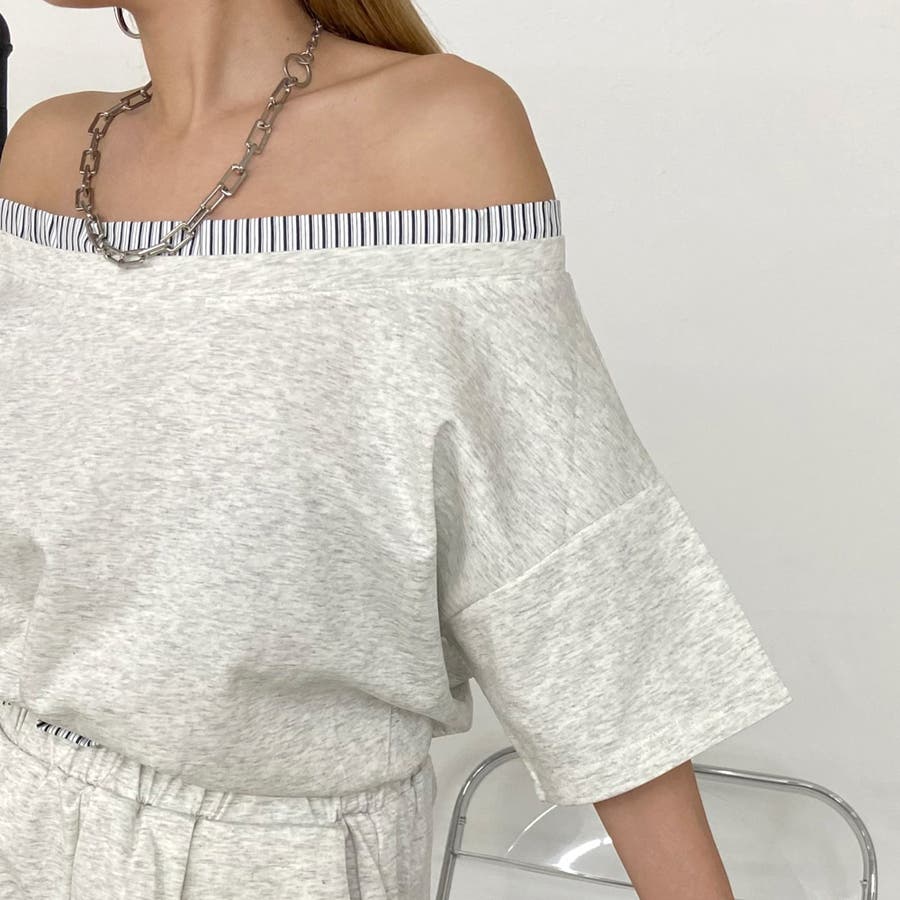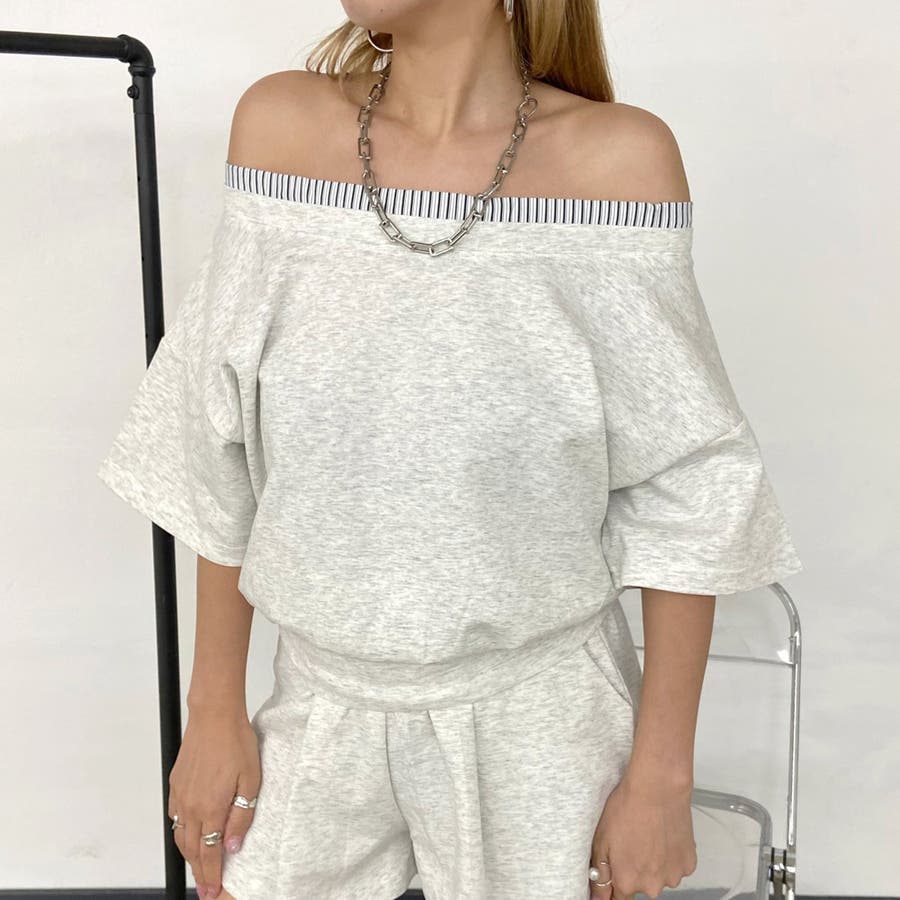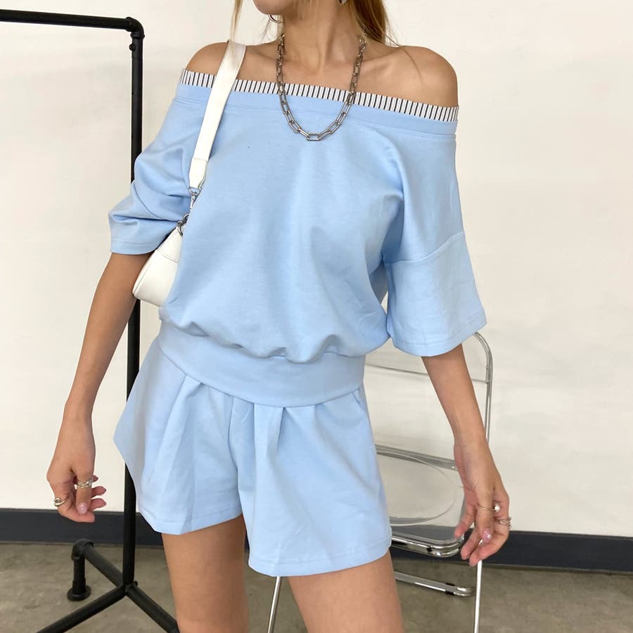 ストライプ切替オフショルトップス・ショートパンツセットアップ
