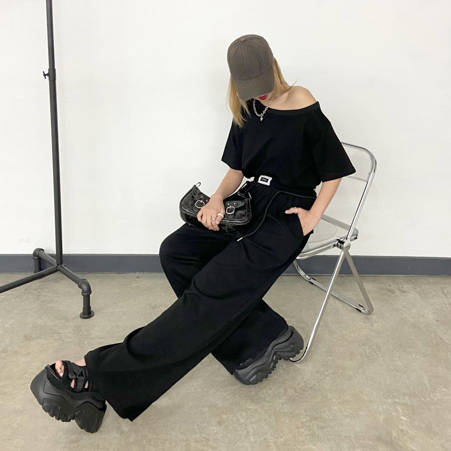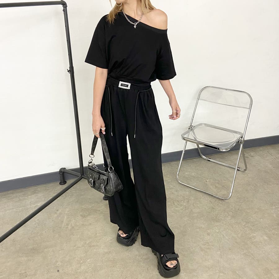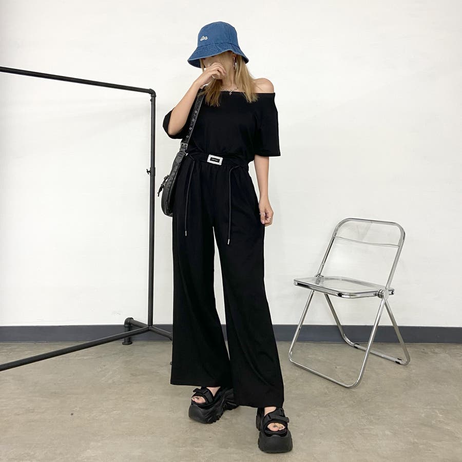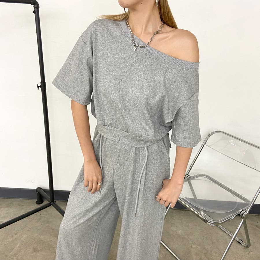 最初から、トップスは、ワンショルみたいに肩が下がってる作りでした。めちゃくちゃ着やすい素材でパンツも可愛いループ紐で、緩かわセットアップ
