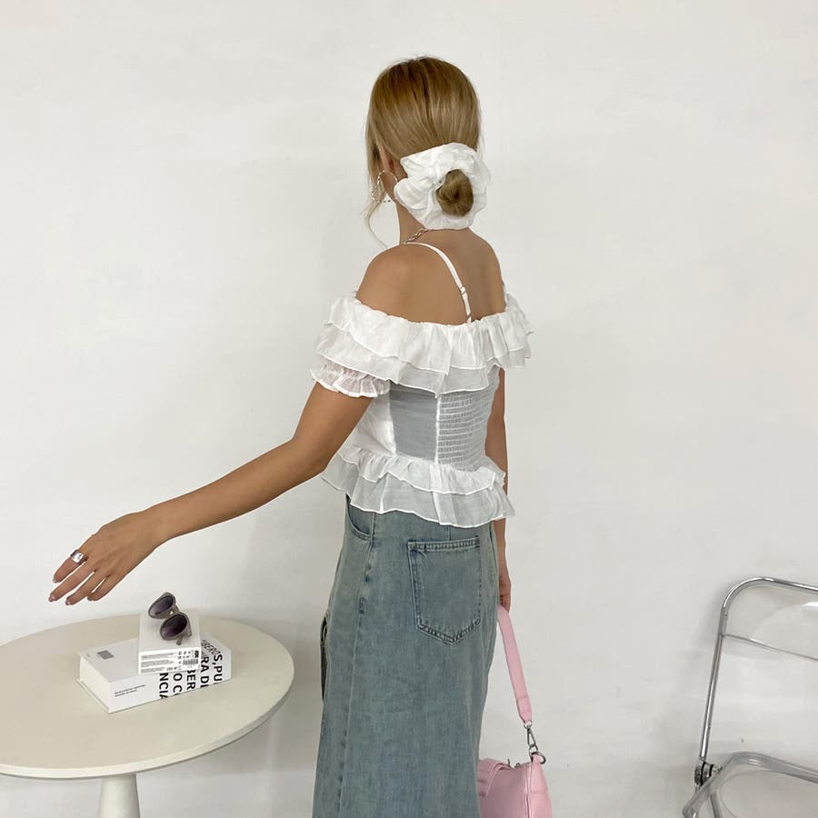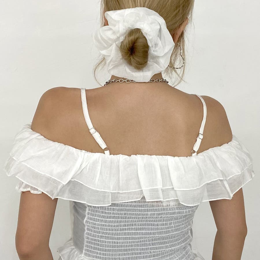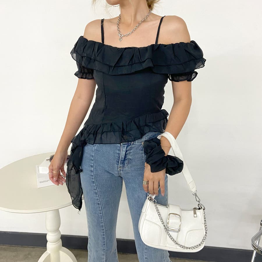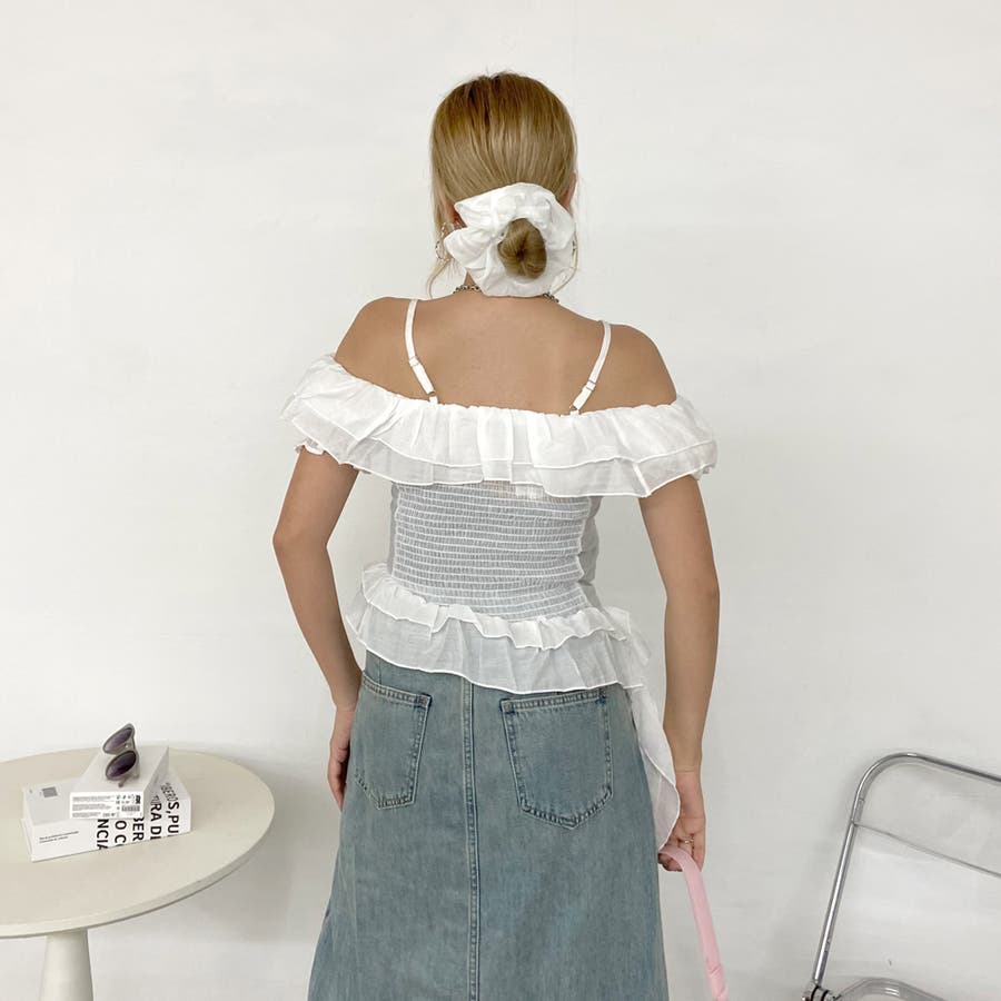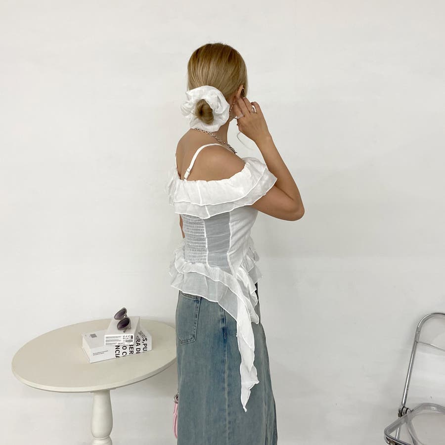 シュシュ付きイレヘムフリルオフショルトップス