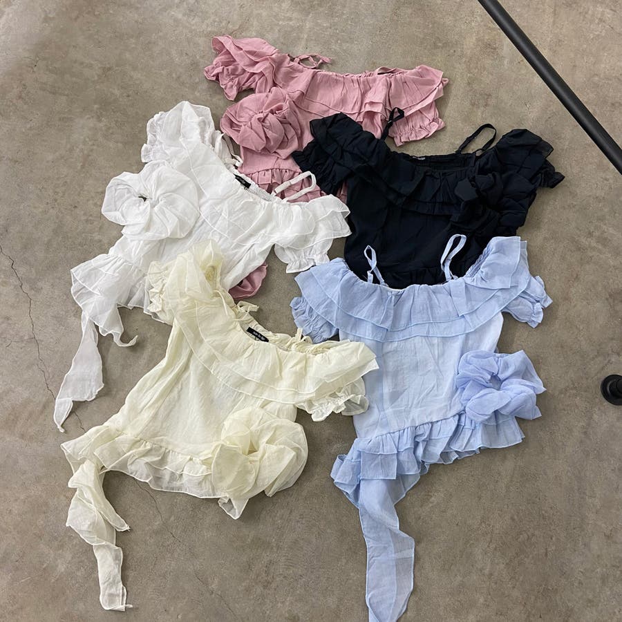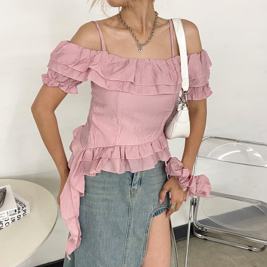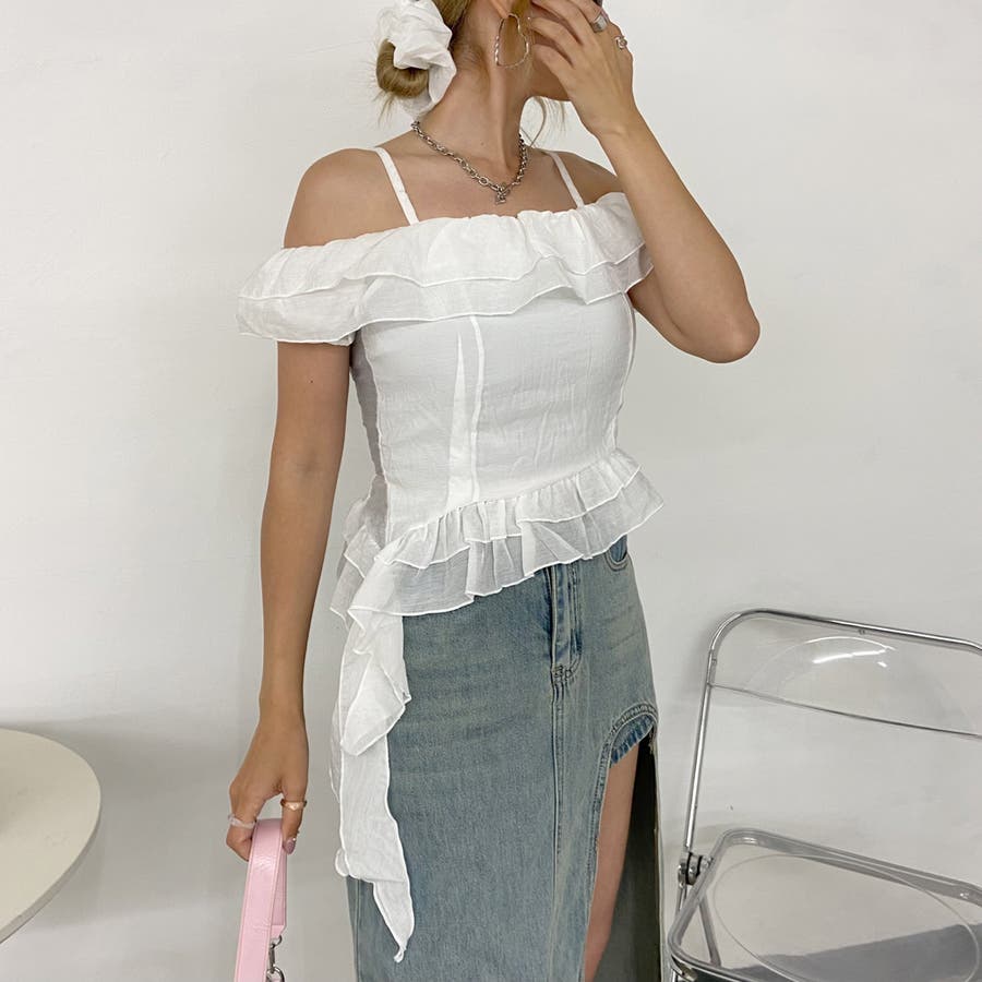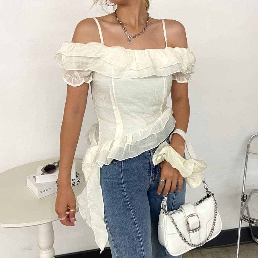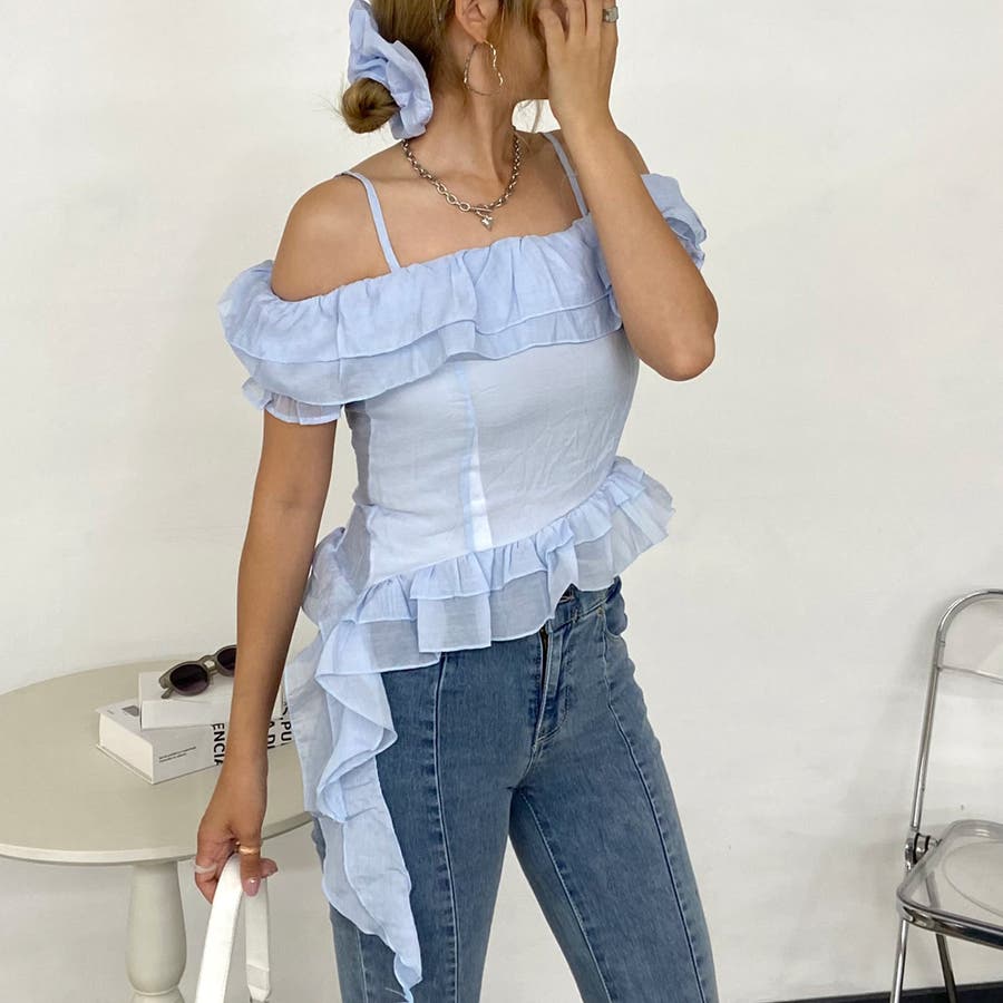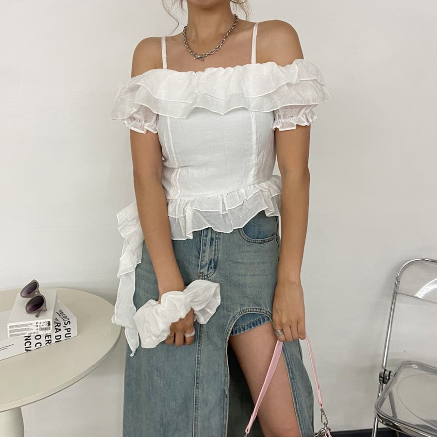 シュシュ付きイレヘムフリルオフショルトップス