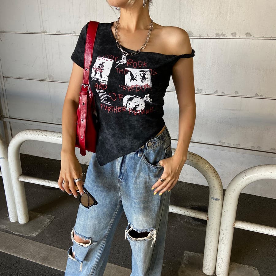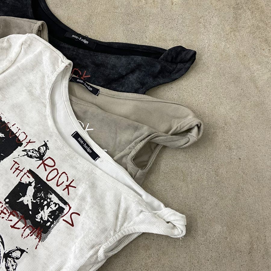ロックプリントイレヘムリブトップス
