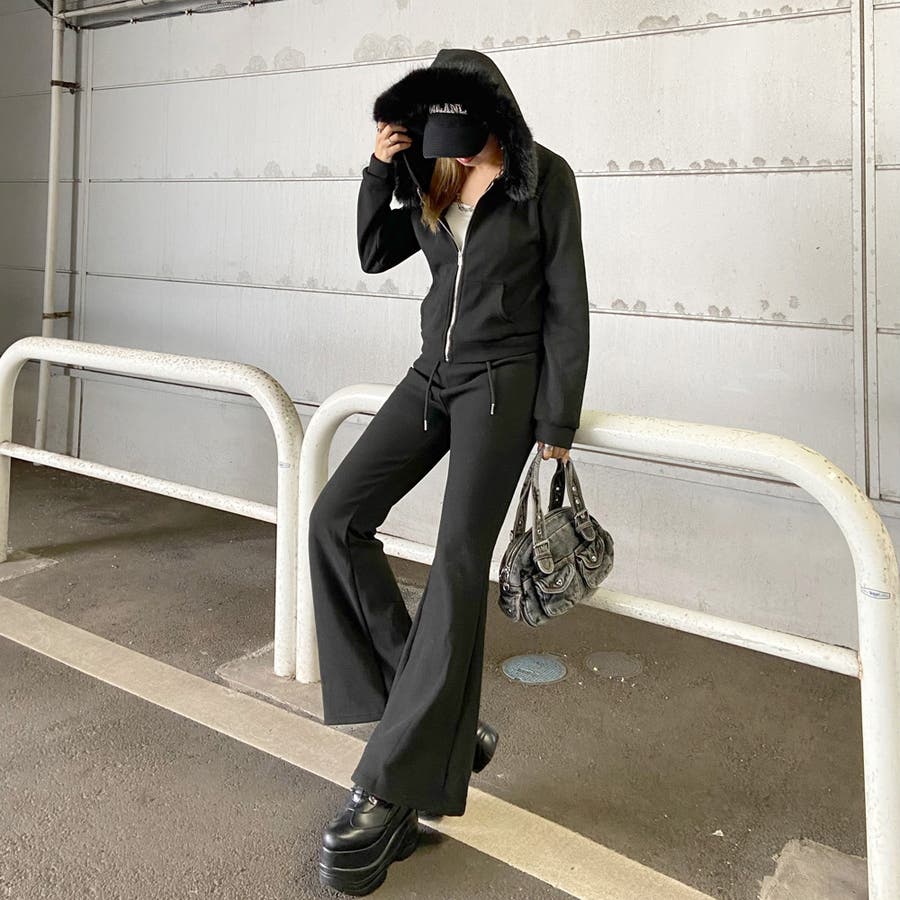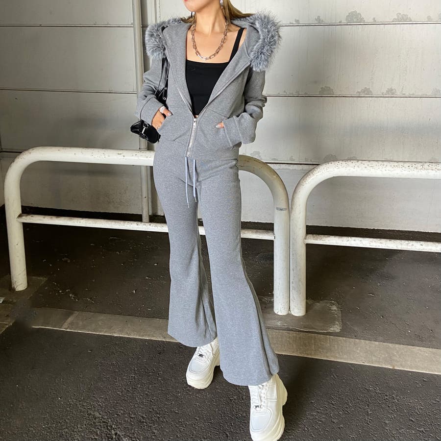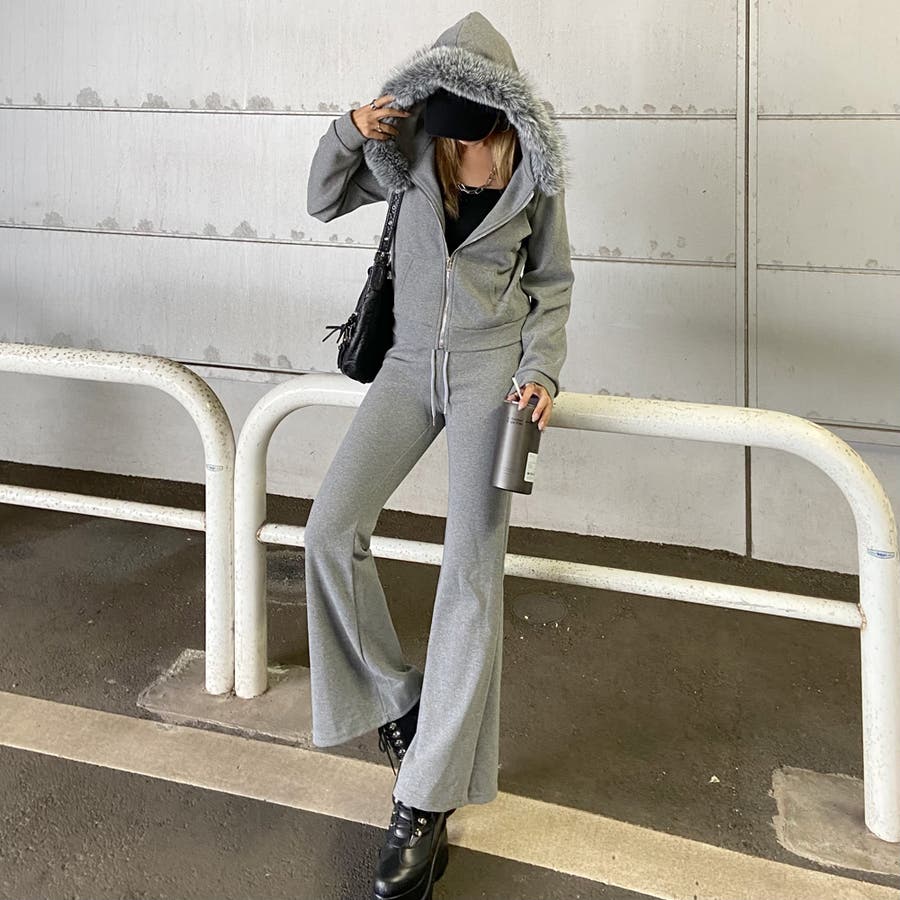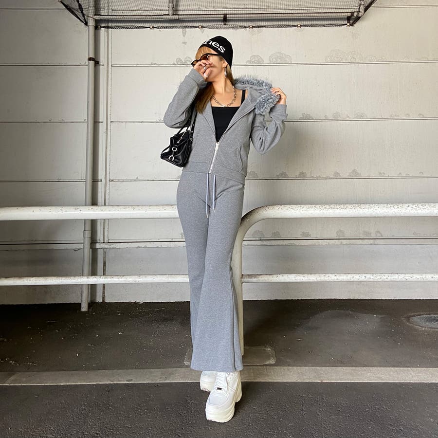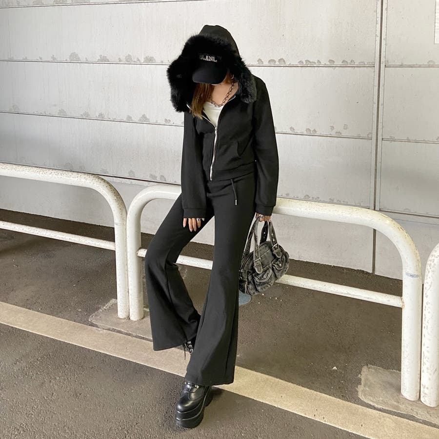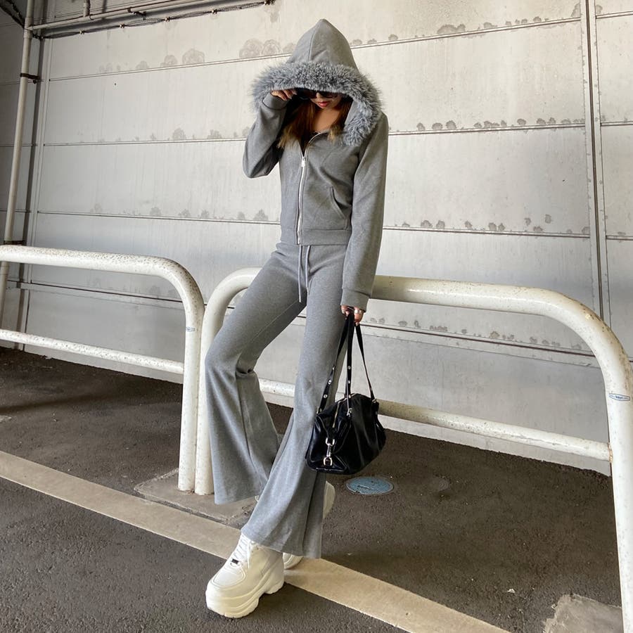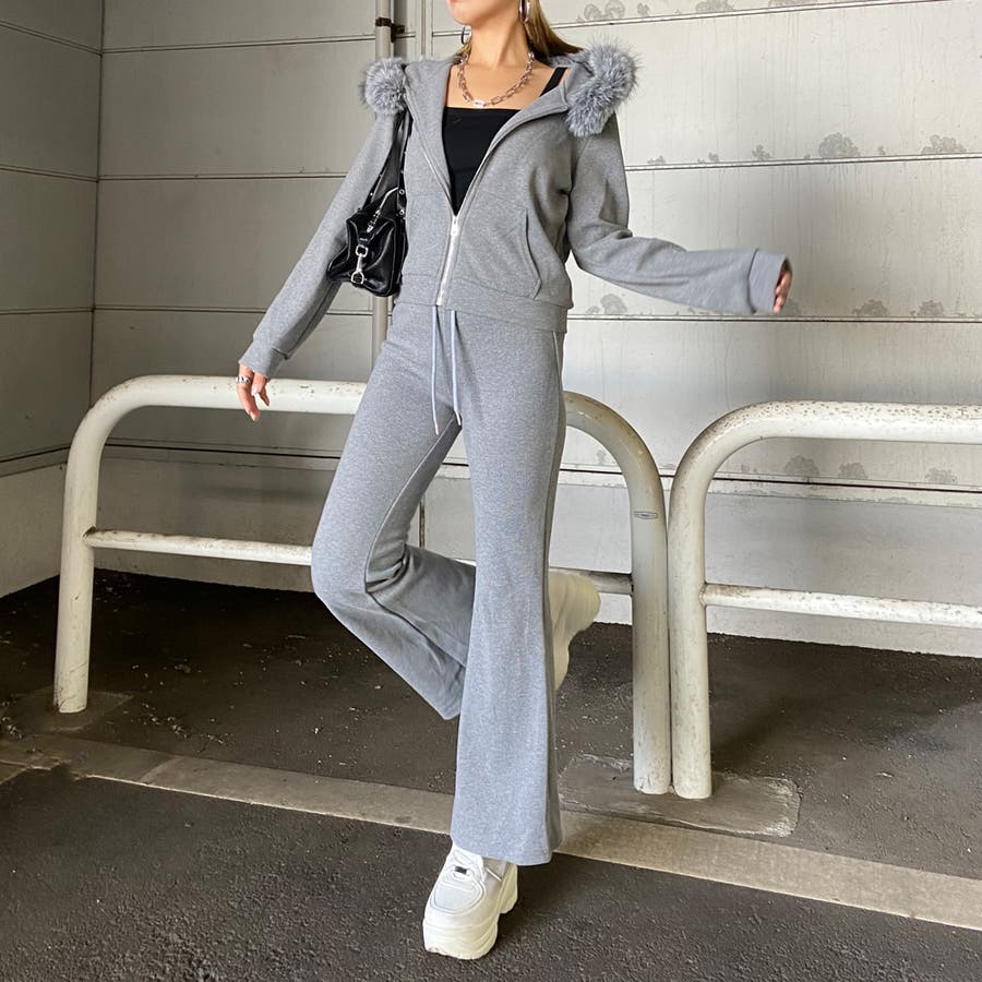 ファーフードZIPパーカー・フレアパンツセットアップ