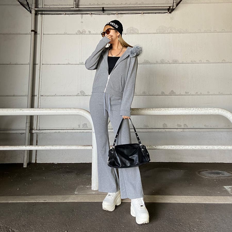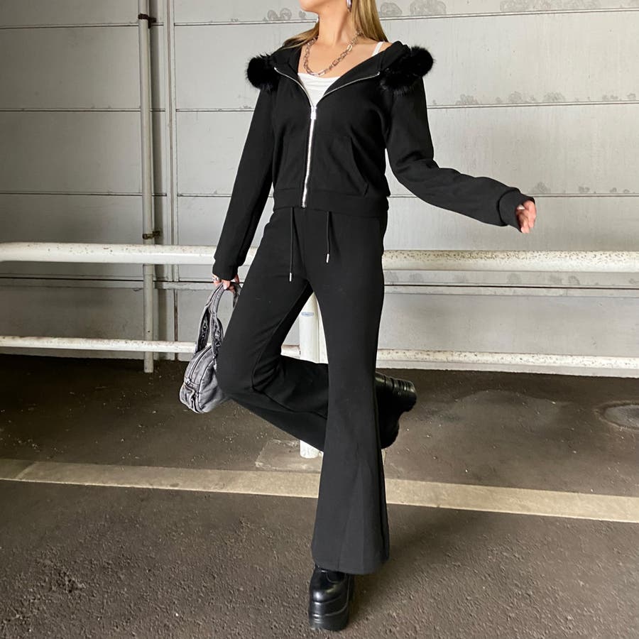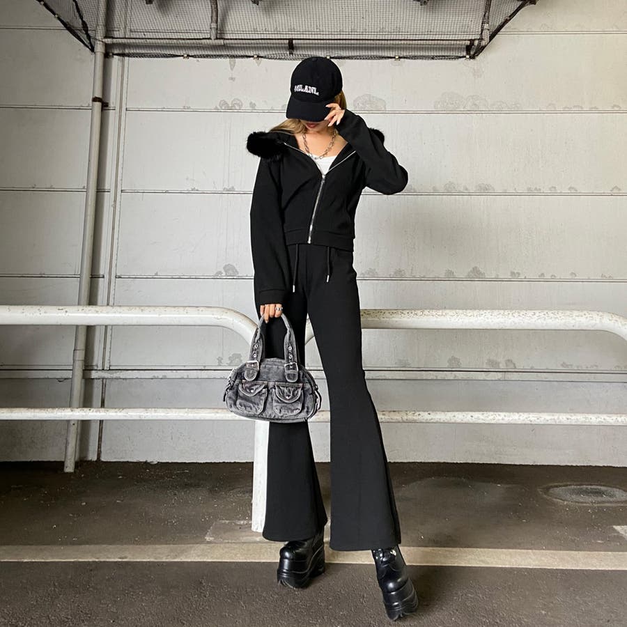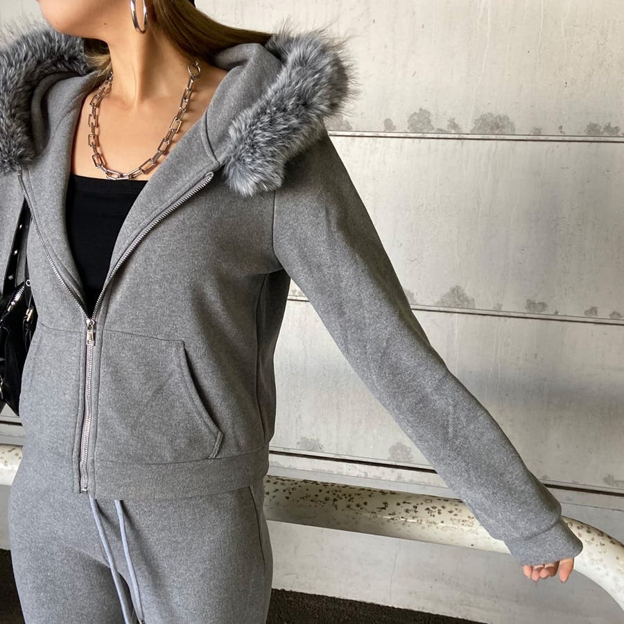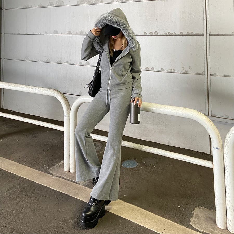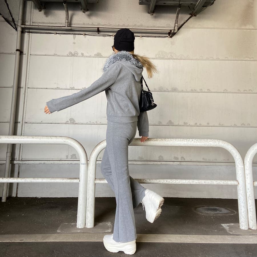 ファーフードZIPパーカー・フレアパンツセットアップ