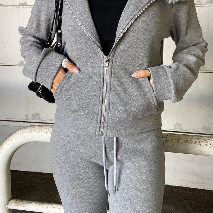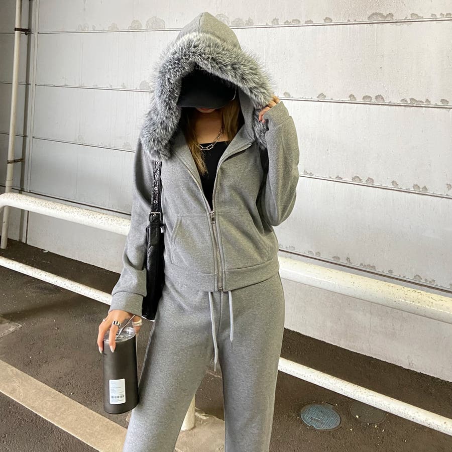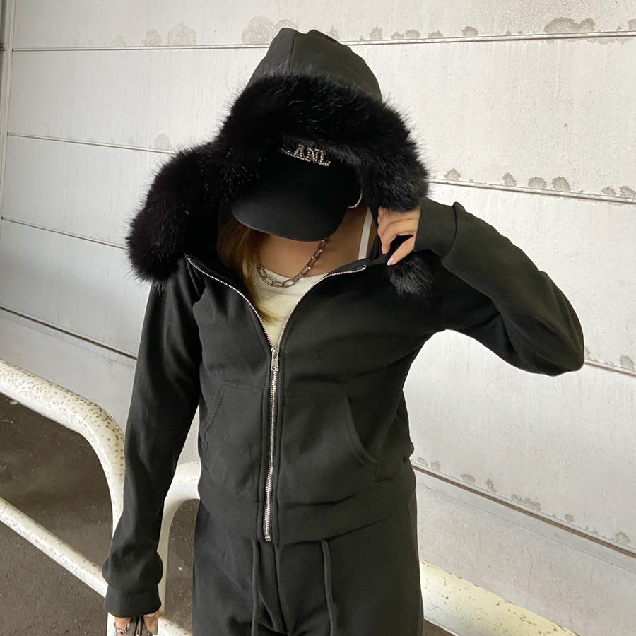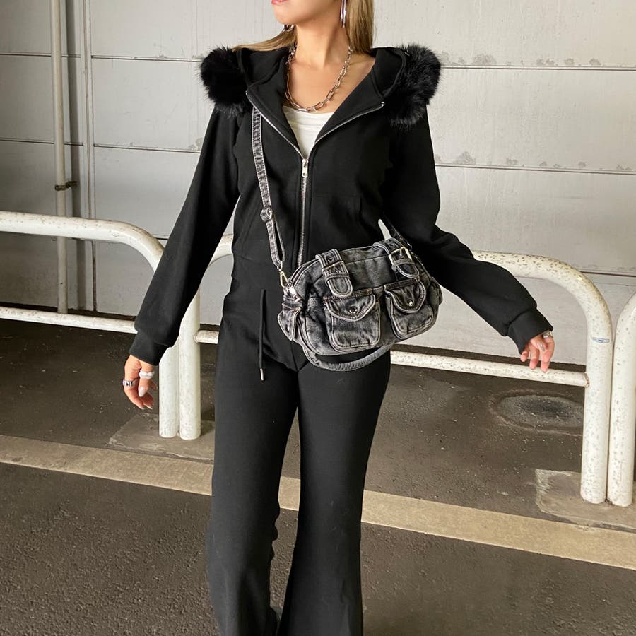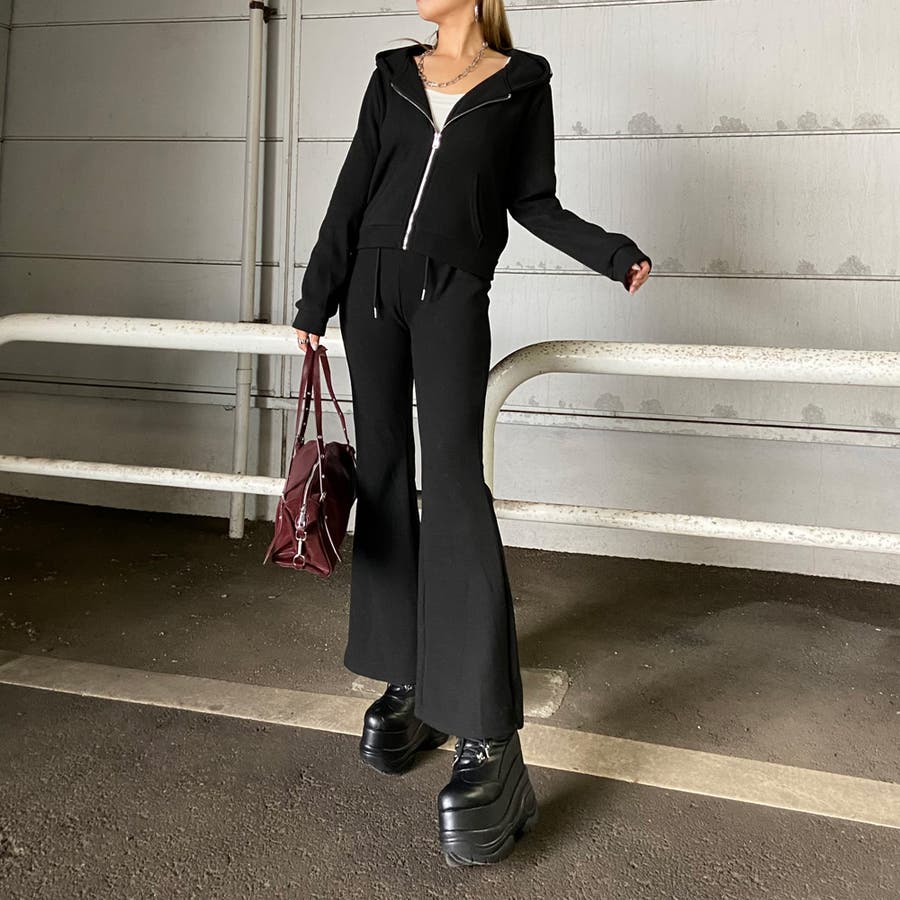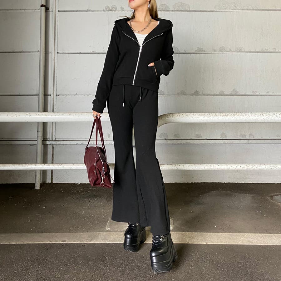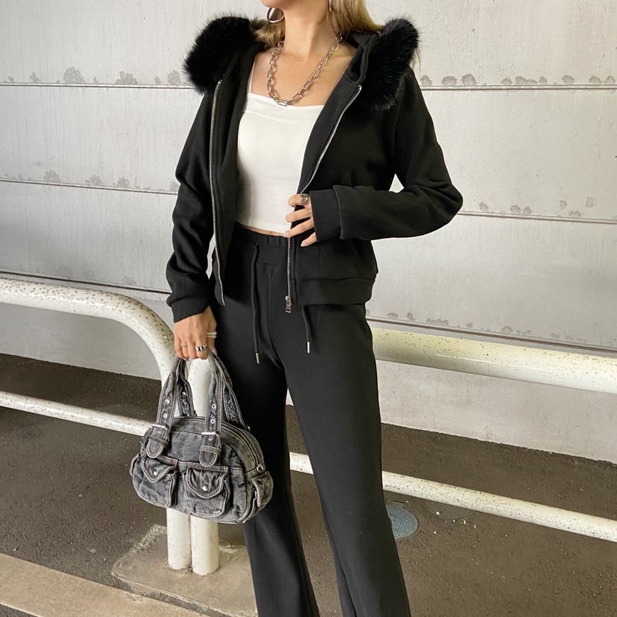 ファーフードZIPパーカー・フレアパンツセットアップ