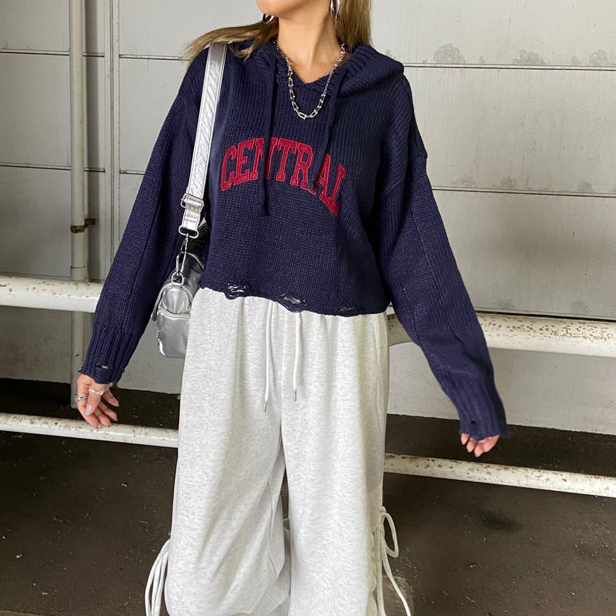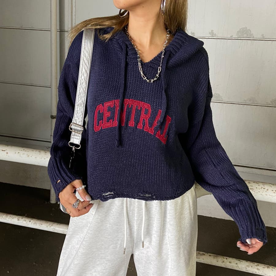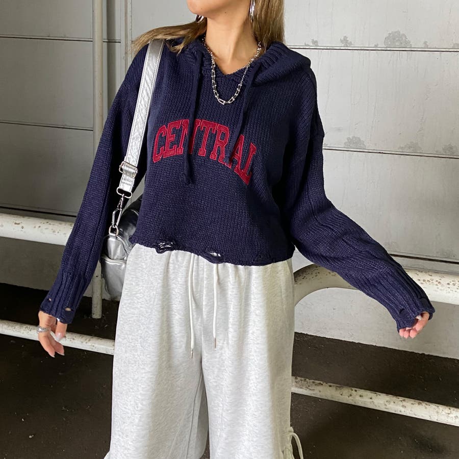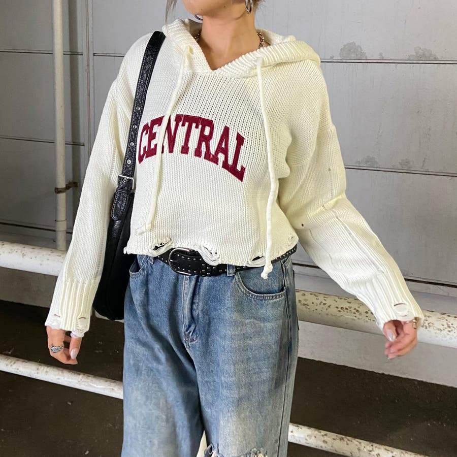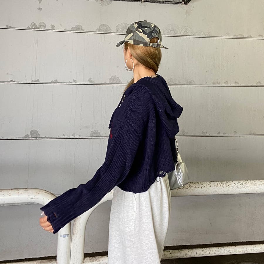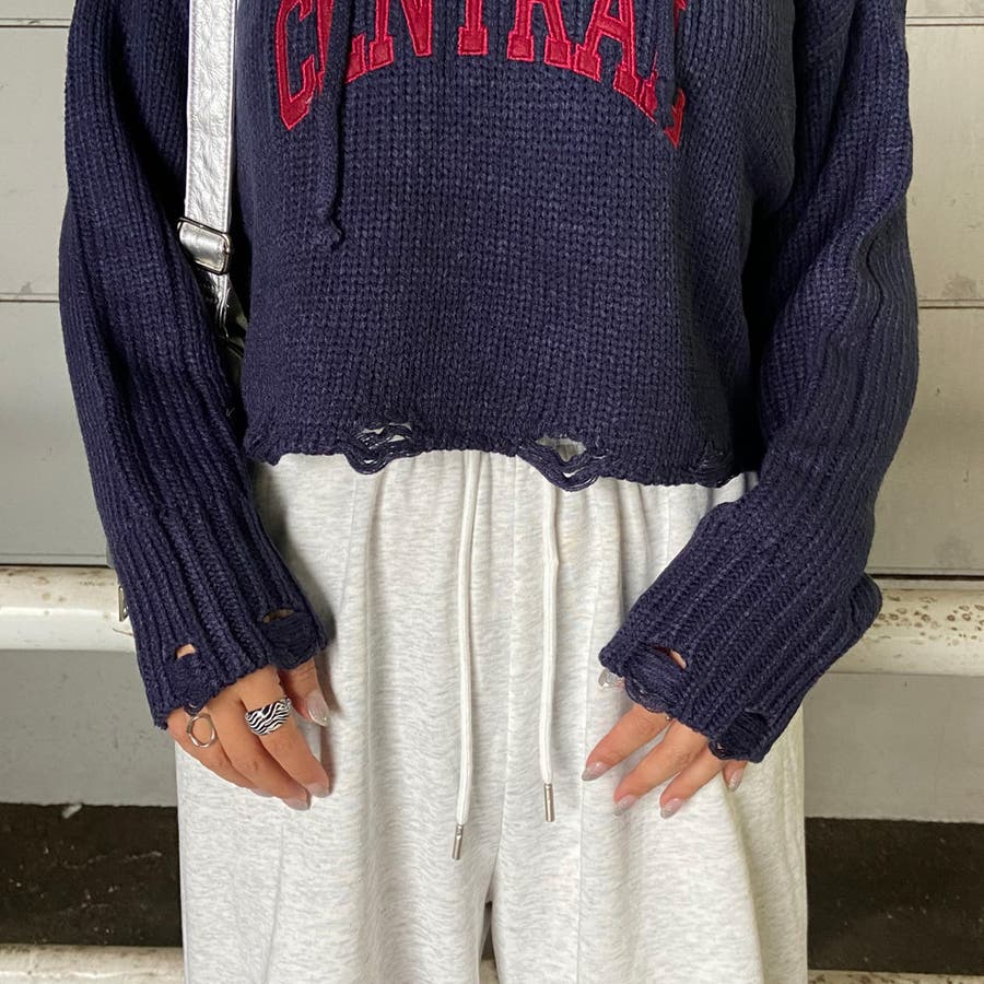 フードロゴダメージショートニットトップス