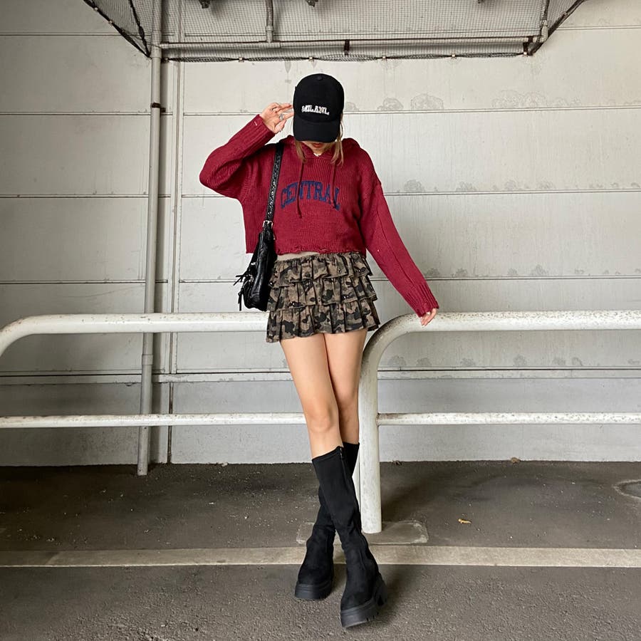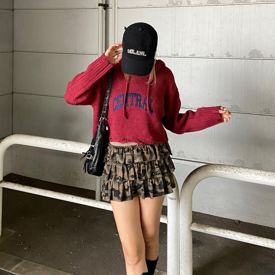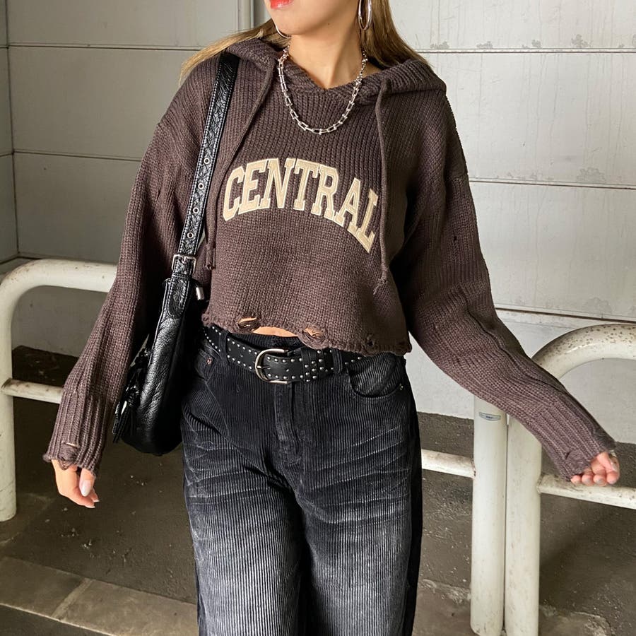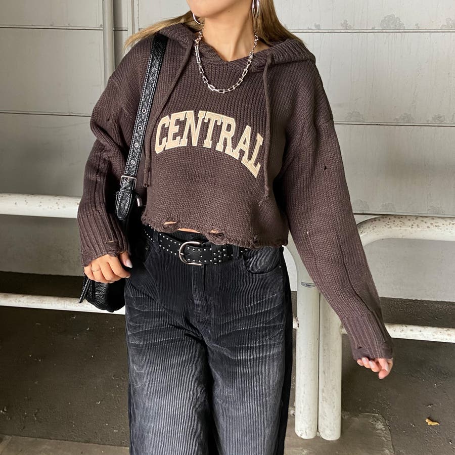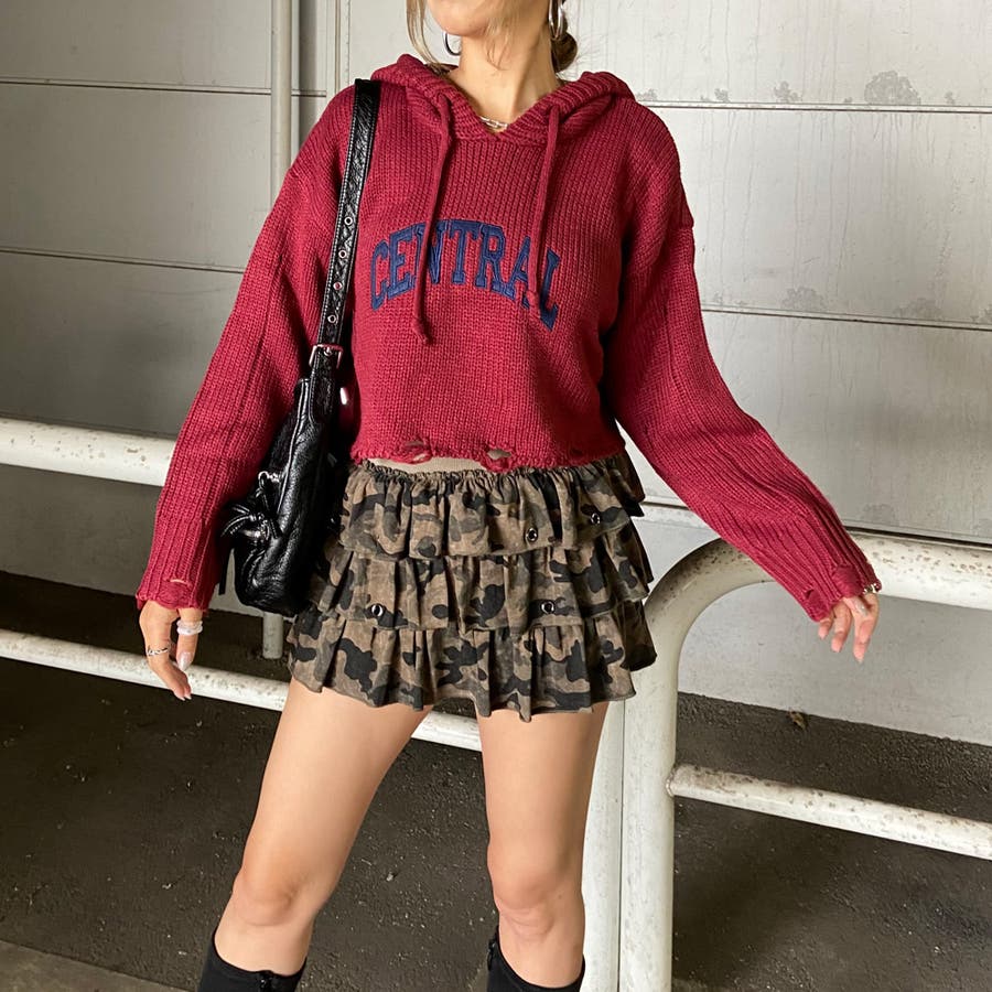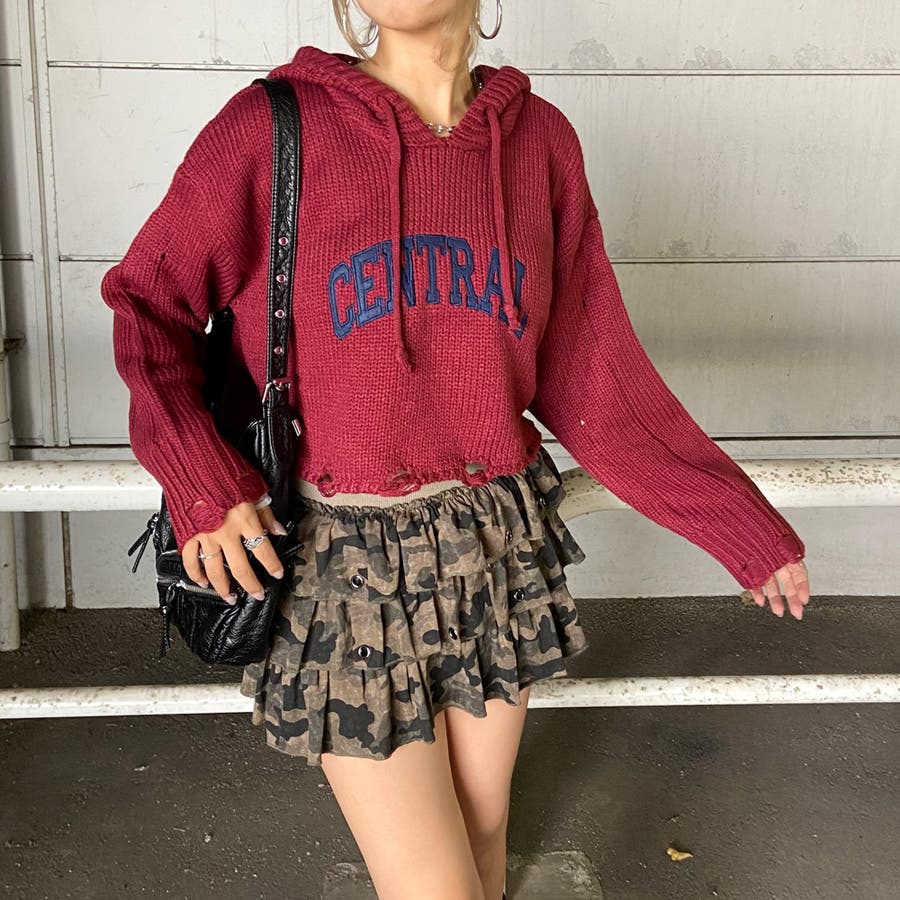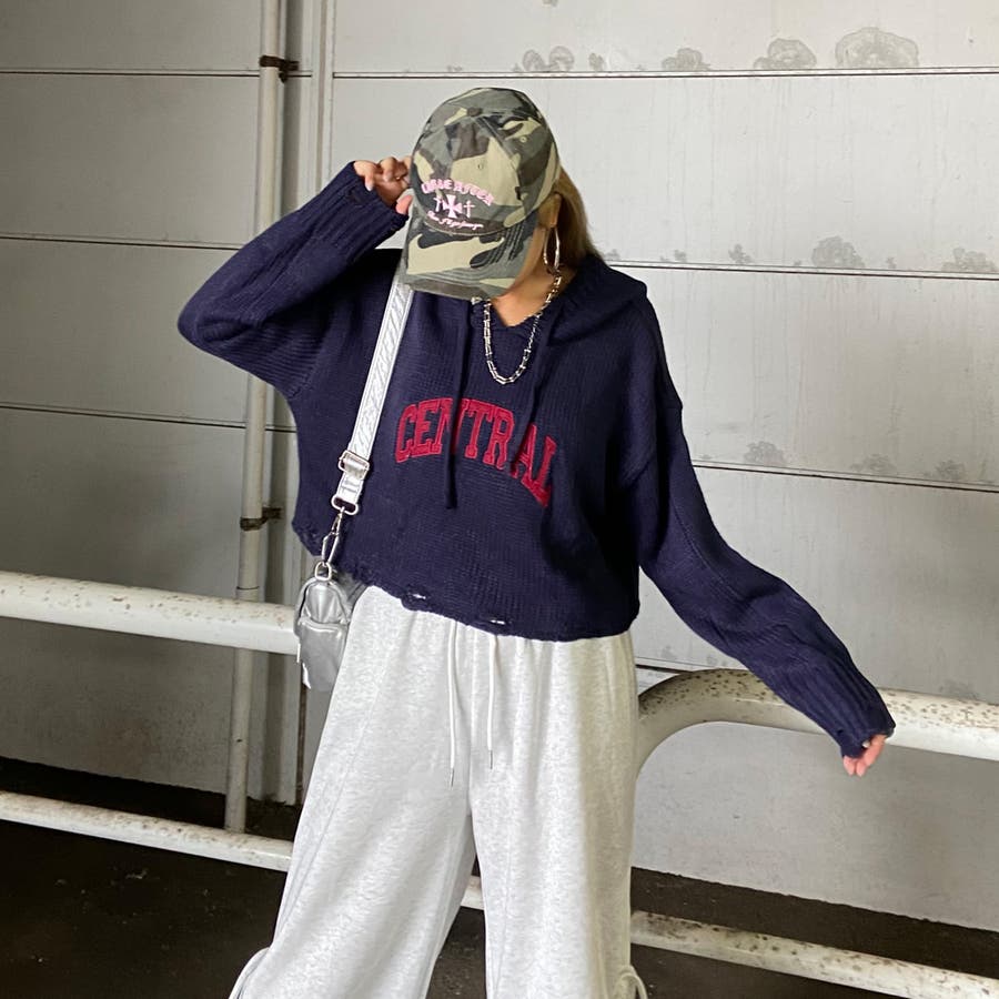 フードロゴダメージショートニットトップス